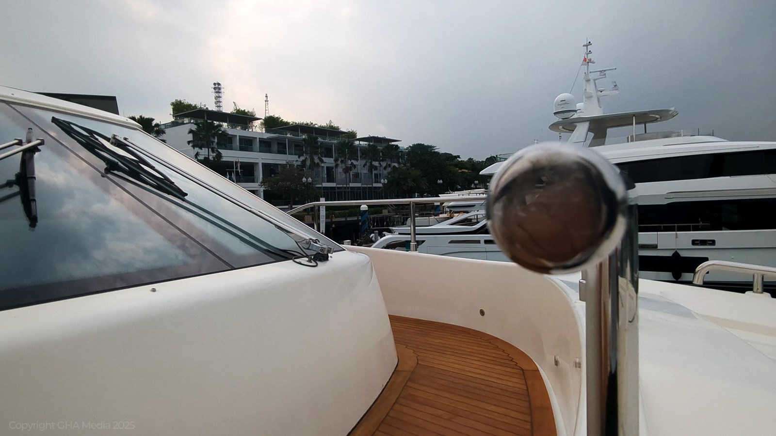 - Starboard-side fold-down balcony with teak flooring