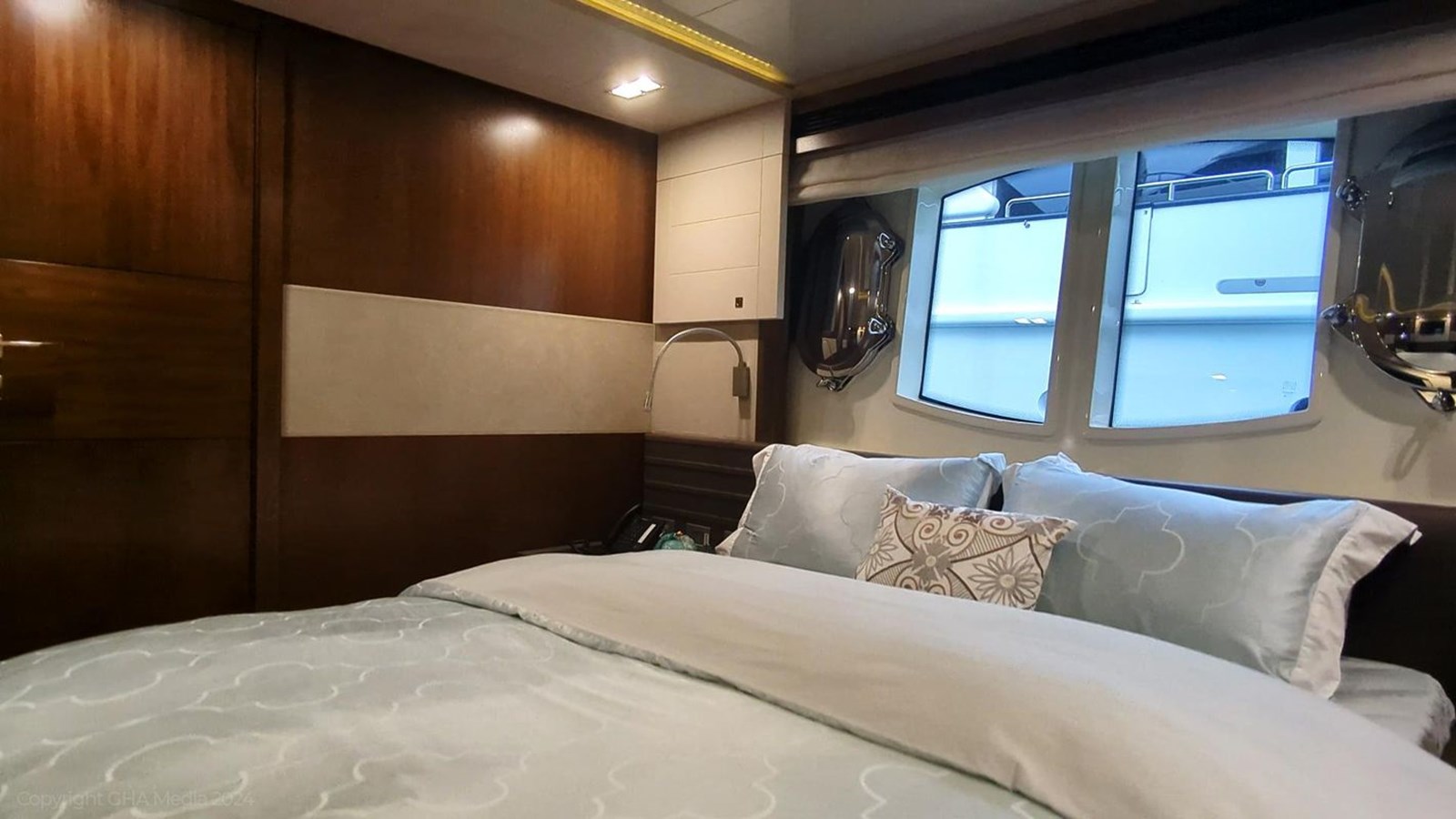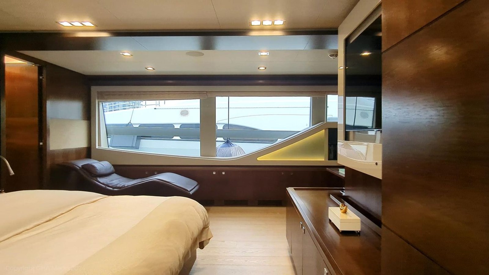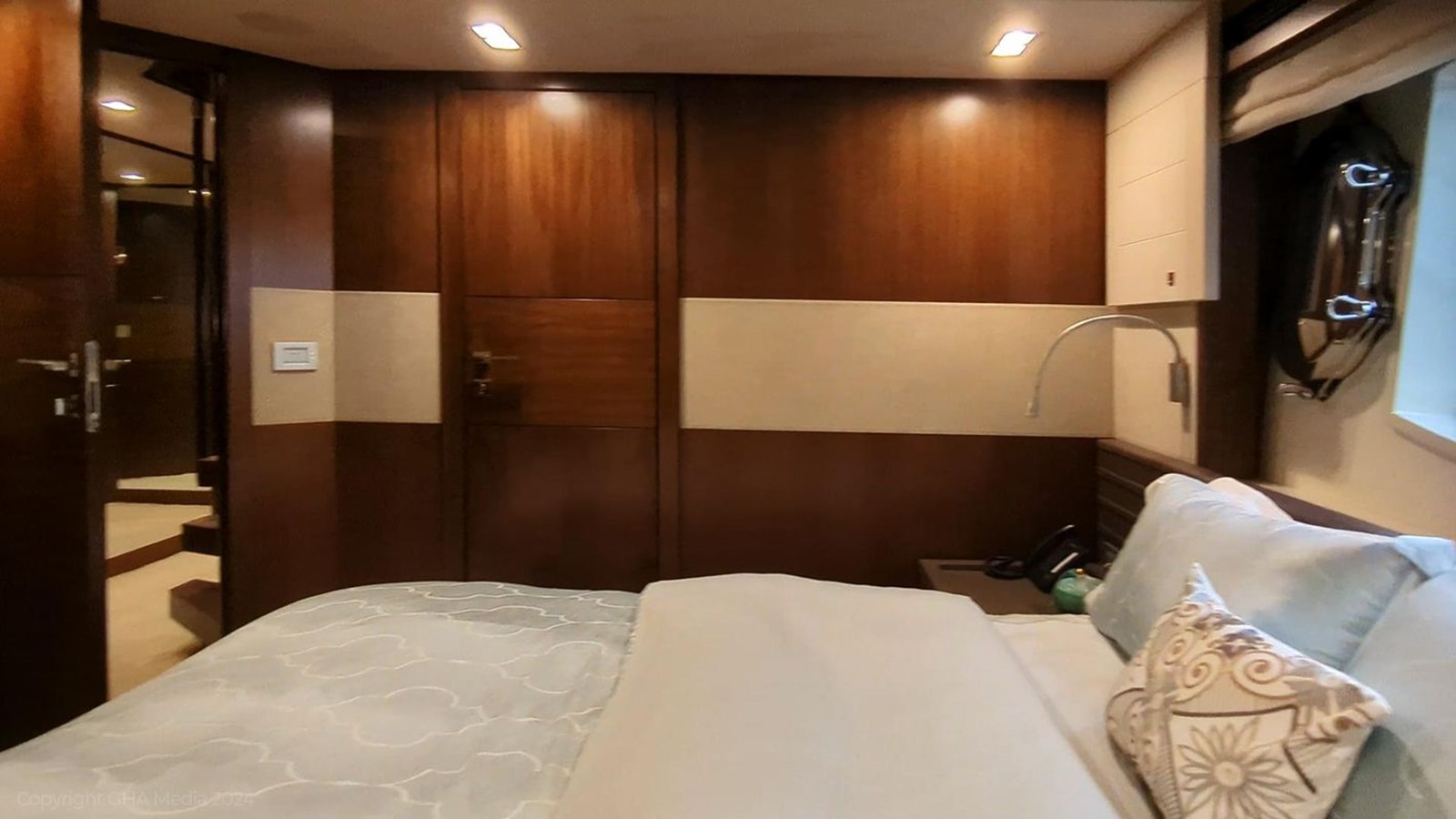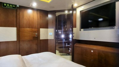 - 2 VIP cabins aft with en-suites, wardrobes, and upgraded AV