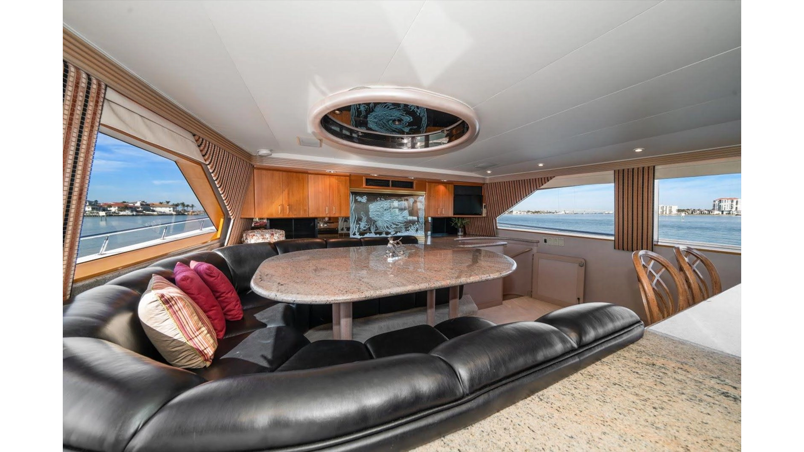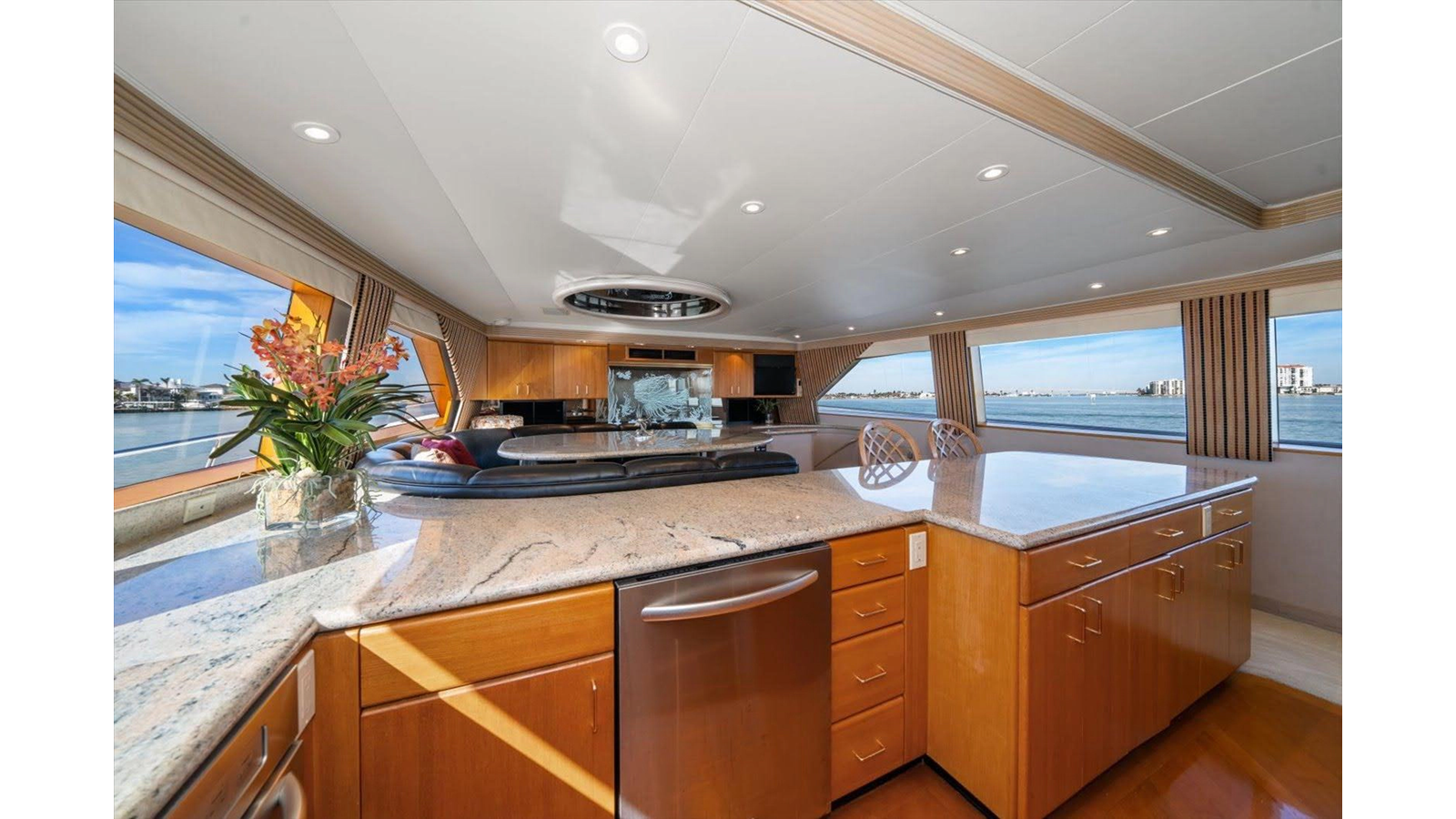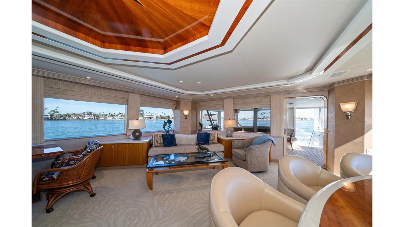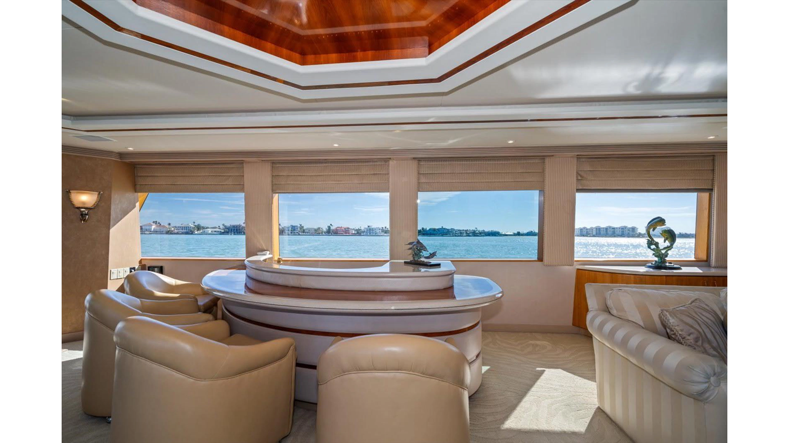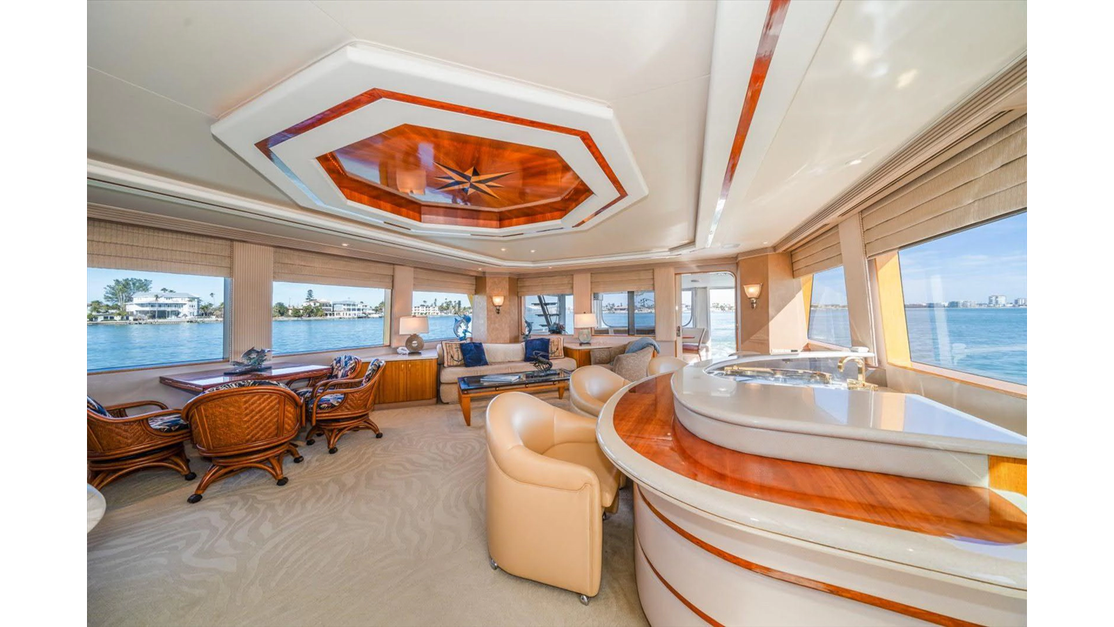 The couches are done in Chenille with four occasional barrel type bar chairs which can be pulled over for dining on the Hi-Lo table. The Main Salon ceiling is done with custom overhead treatments with three layers and five beveled molding throughout the Salon and the entire yacht. The walk-behind bar is step down to let the bar top be low enough not to obstruct the view from the other side of the Salon while seated.