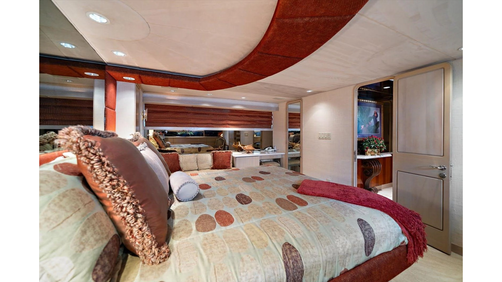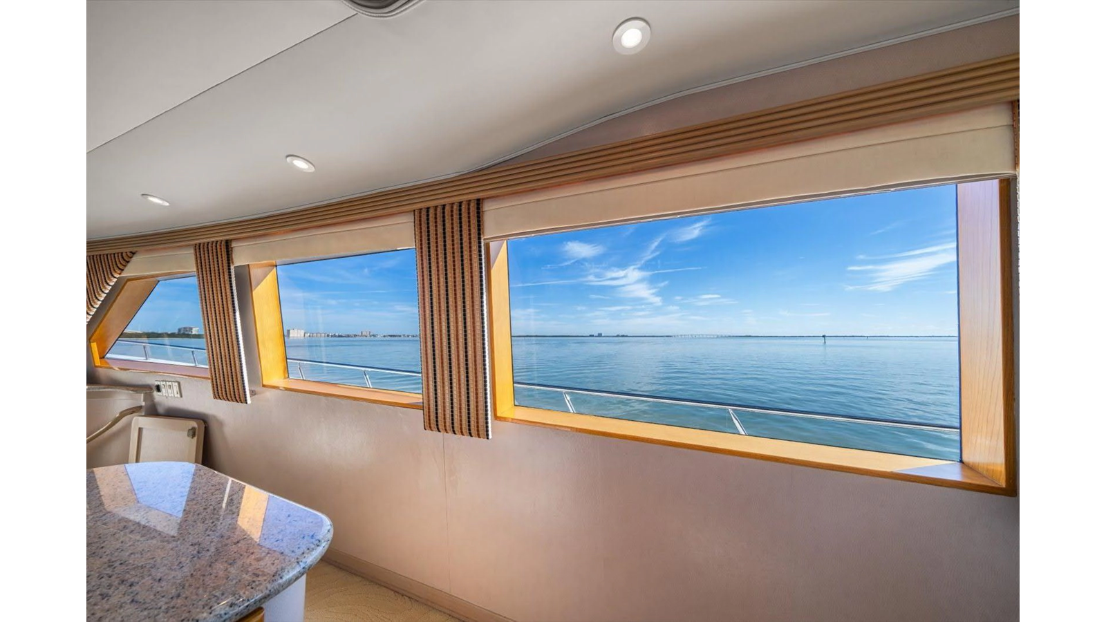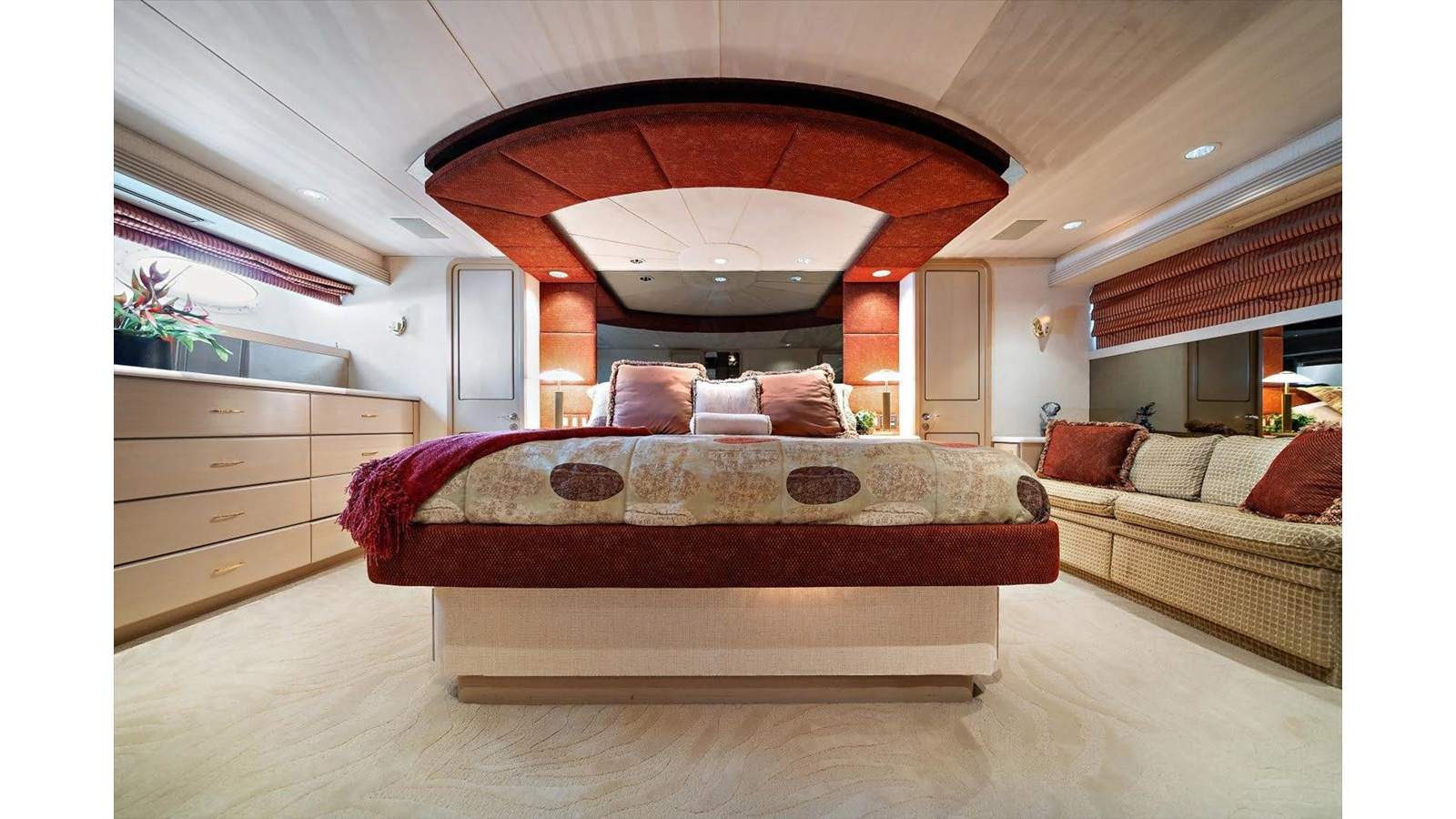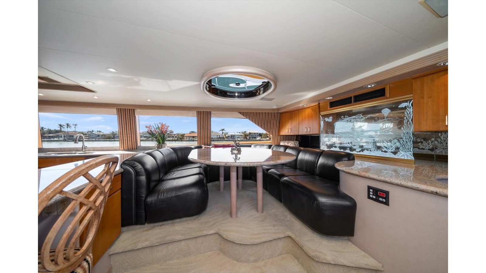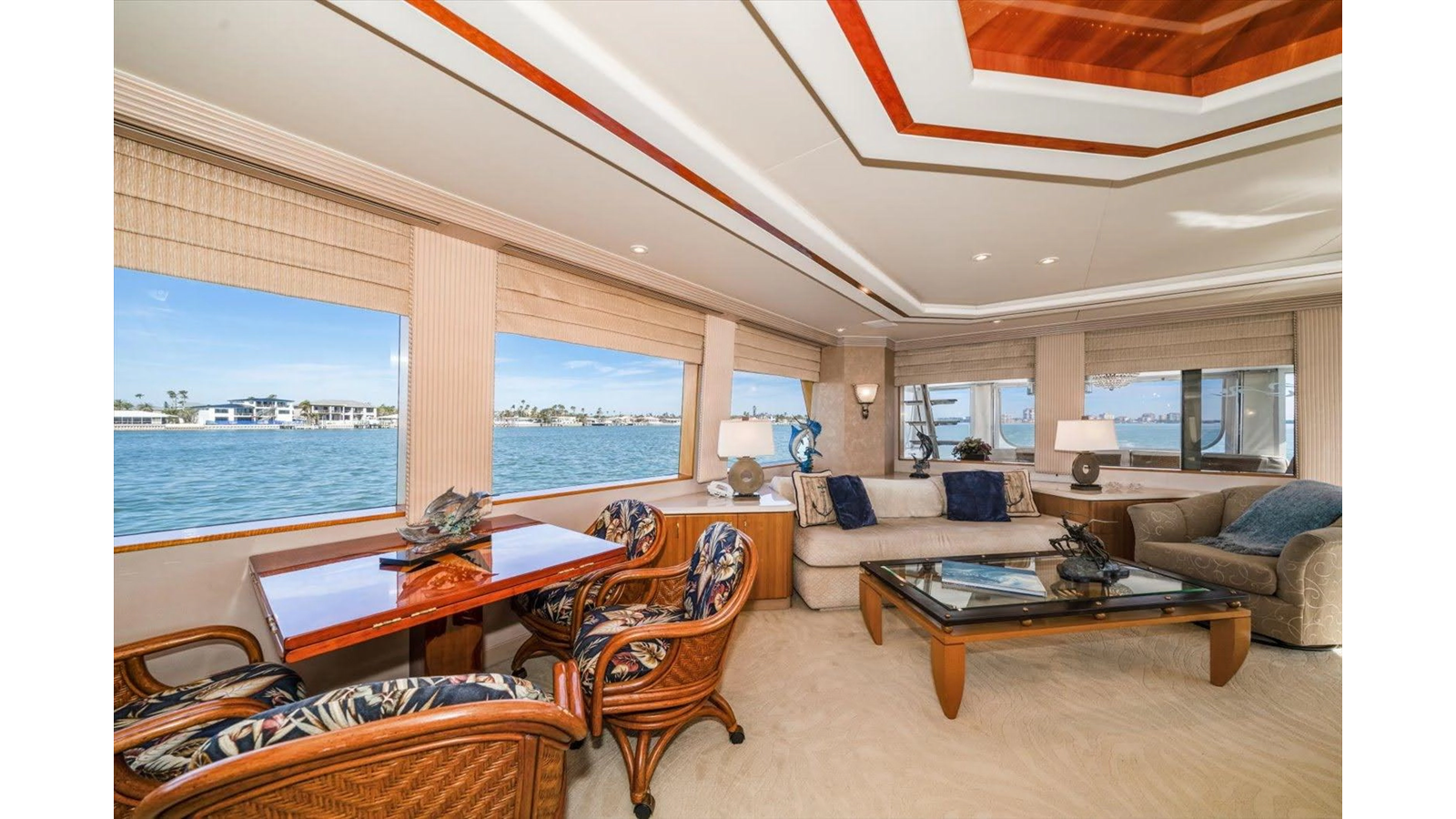 The couches are done in Chenille with four occasional barrel type bar chairs which can be pulled over for dining on the Hi-Lo table. The Main Salon ceiling is done with custom overhead treatments with three layers and five beveled molding throughout the Salon and the entire yacht. The walk-behind bar is step down to let the bar top be low enough not to obstruct the view from the other side of the Salon while seated.