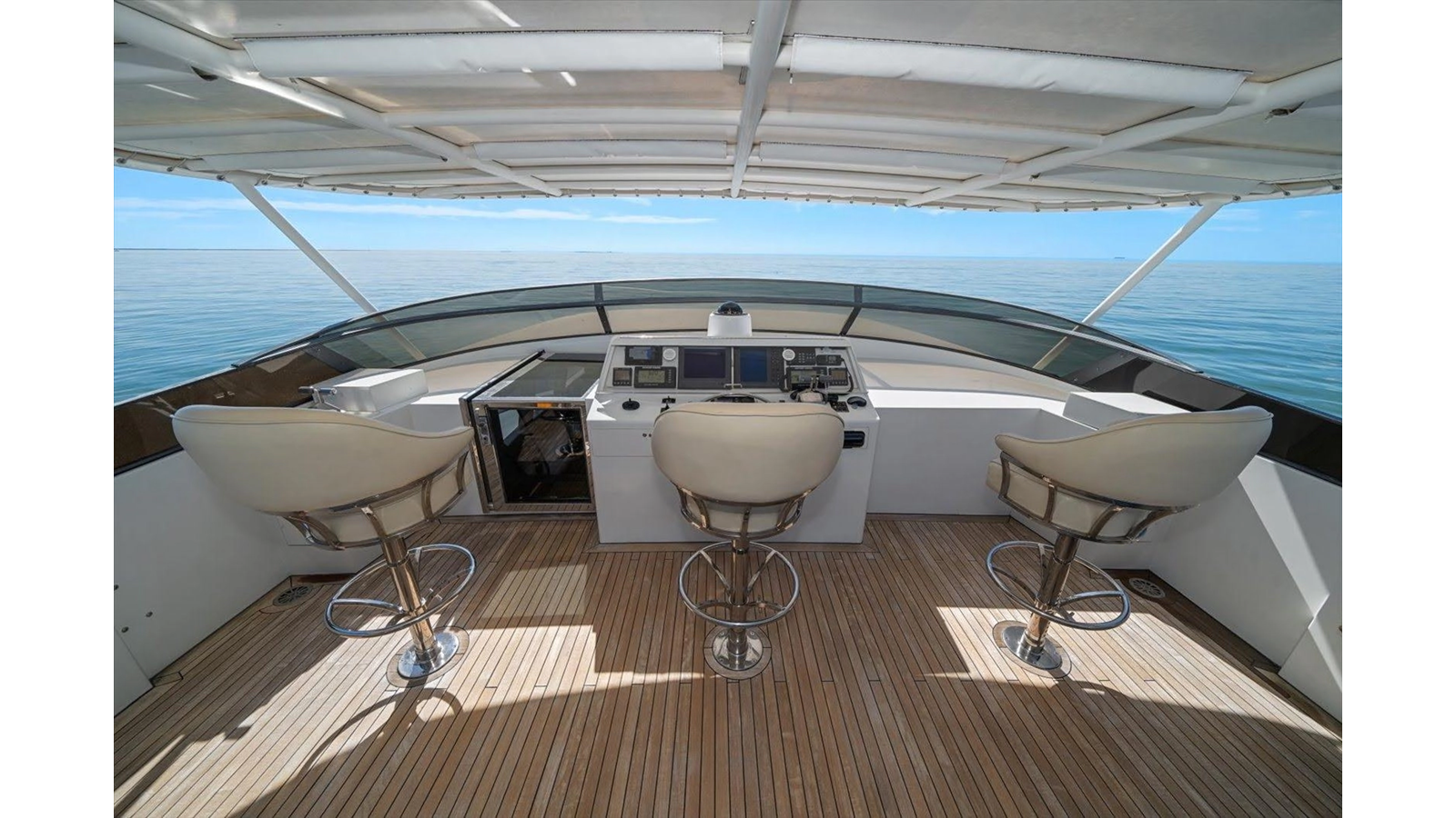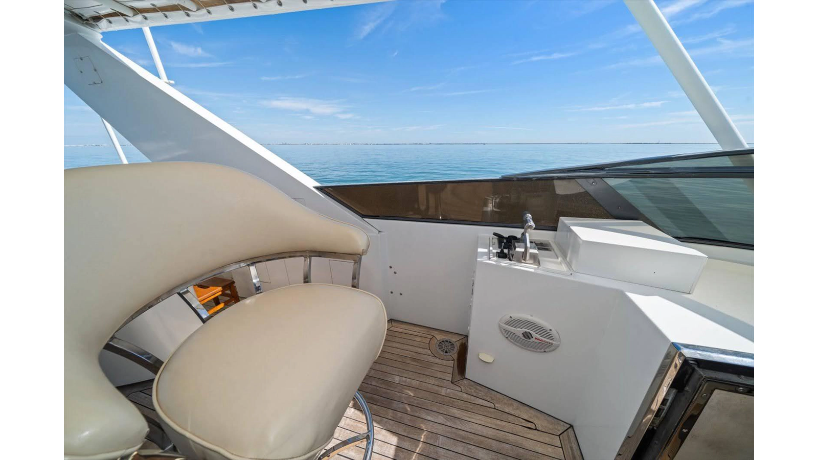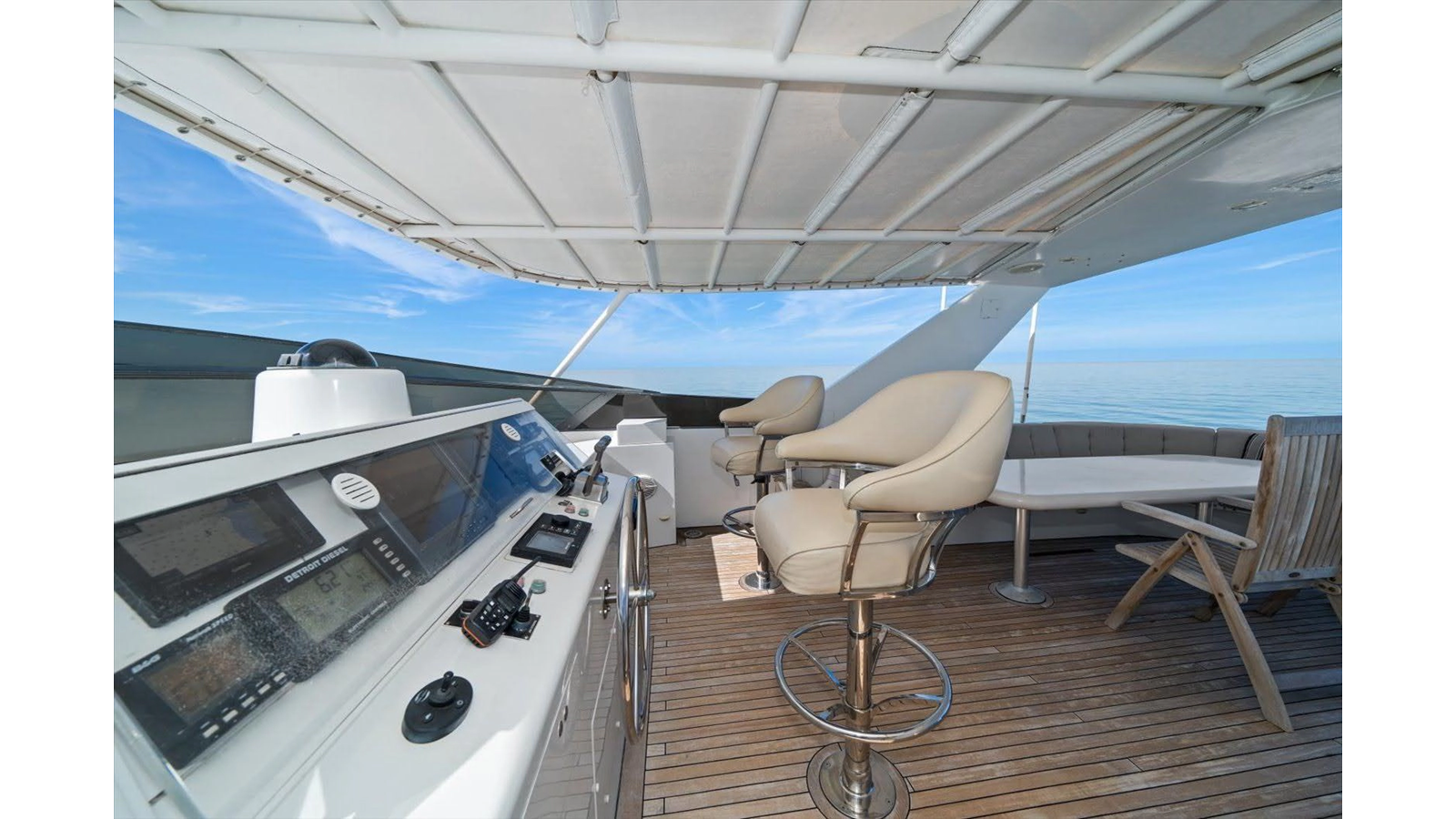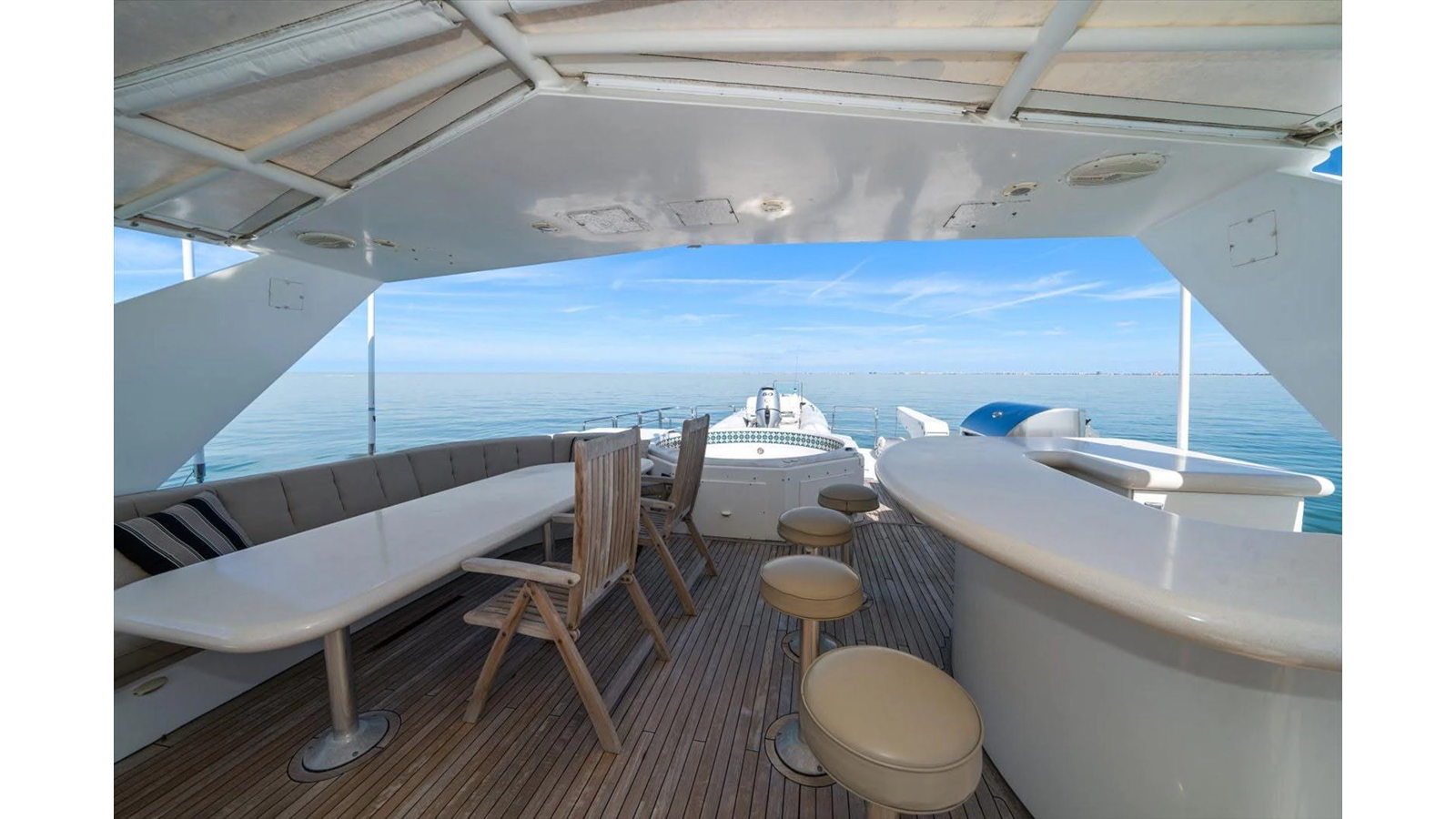 The Flybridge/Sundeck is extremely large with a Jacuzzi in the center. There is a custom wet bar with 4 stools and a whirlpool icemaker. Starboard dinette seating for 15-20 people. There are three custom Steel Crown chairs raised and have footrests to accompany the captain while cruising. A sundeck measuring a massive 19ft x 13ft area.