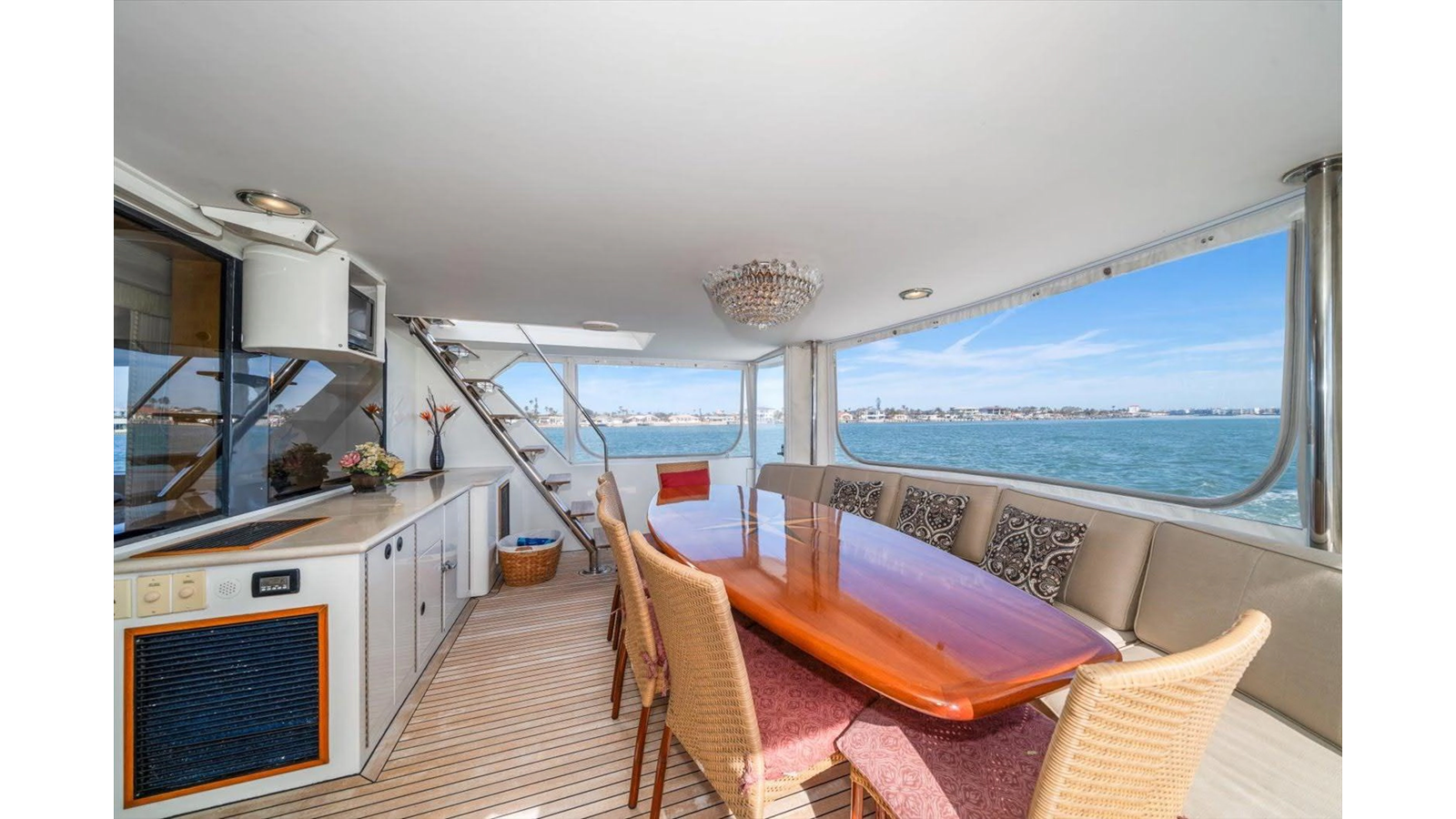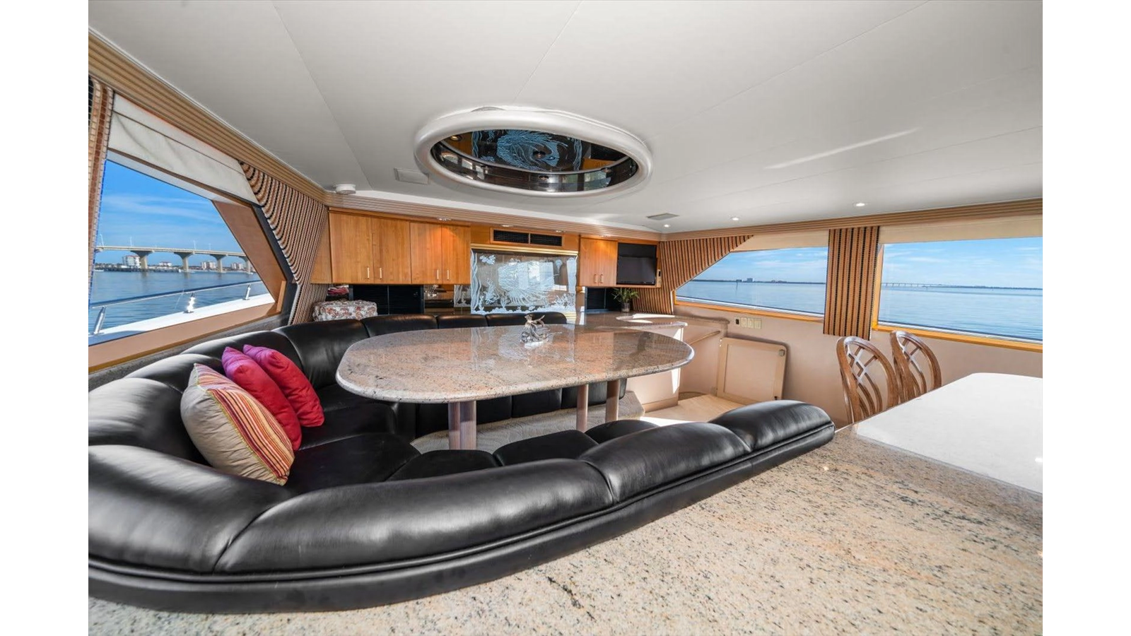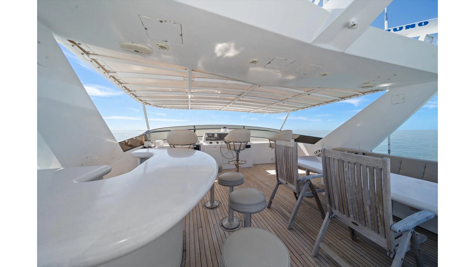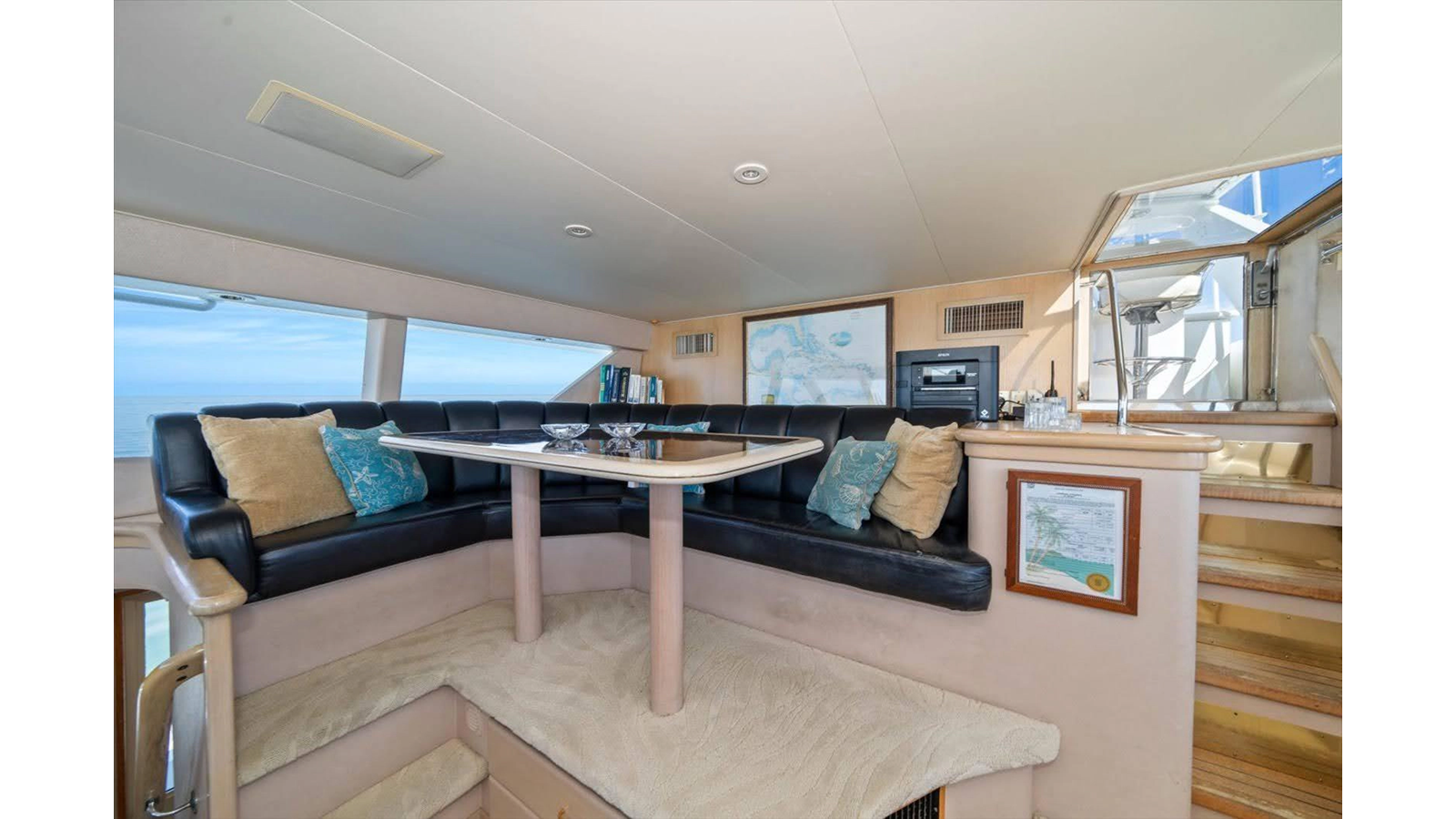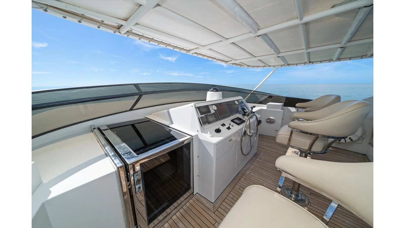 The Flybridge/Sundeck is extremely large with a Jacuzzi in the center. There is a custom wet bar with 4 stools and a whirlpool icemaker. Starboard dinette seating for 15-20 people. There are three custom Steel Crown chairs raised and have footrests to accompany the captain while cruising. A sundeck measuring a massive 19ft x 13ft area.