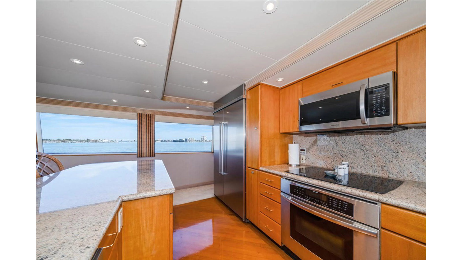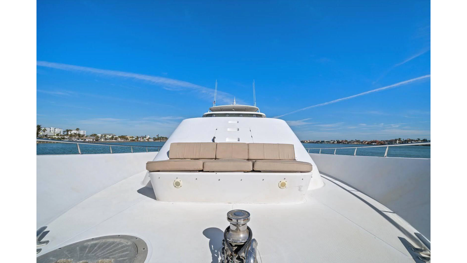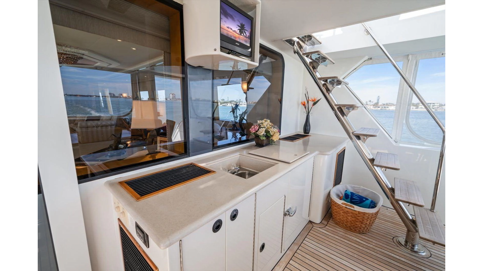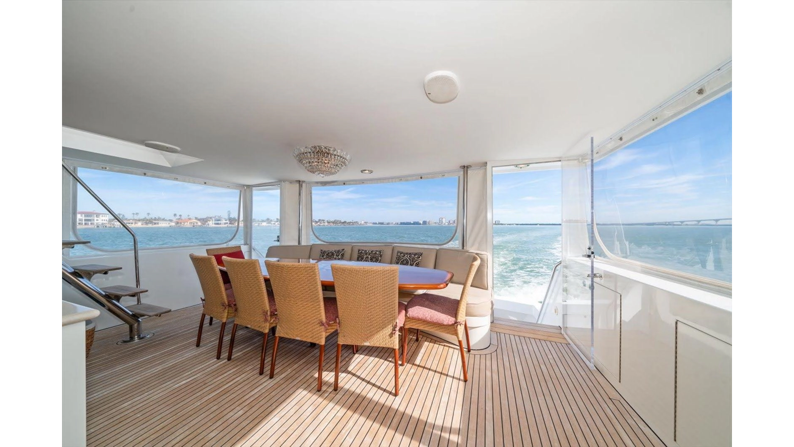 The Flybridge/Sundeck is extremely large with a Jacuzzi in the center. There is a custom wet bar with 4 stools and a whirlpool icemaker. Starboard dinette seating for 15-20 people. There are three custom Steel Crown chairs raised and have footrests to accompany the captain while cruising. A sundeck measuring a massive 19ft x 13ft area.