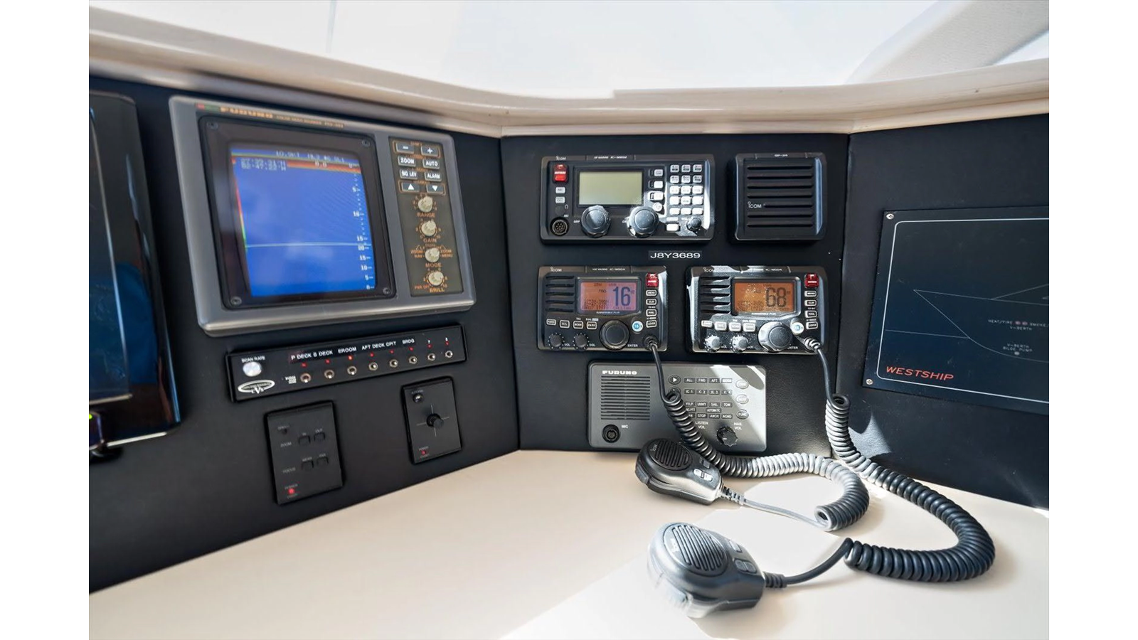 - Standard 230 SW 40 HM hailer intercom w/4 horns(2 in cockpit, 2 on mast) MMI APBK600 UPS back-up Two (2) Icom IC-M502 VHF Radios (GMDSS) on flybridge and wheelhouse