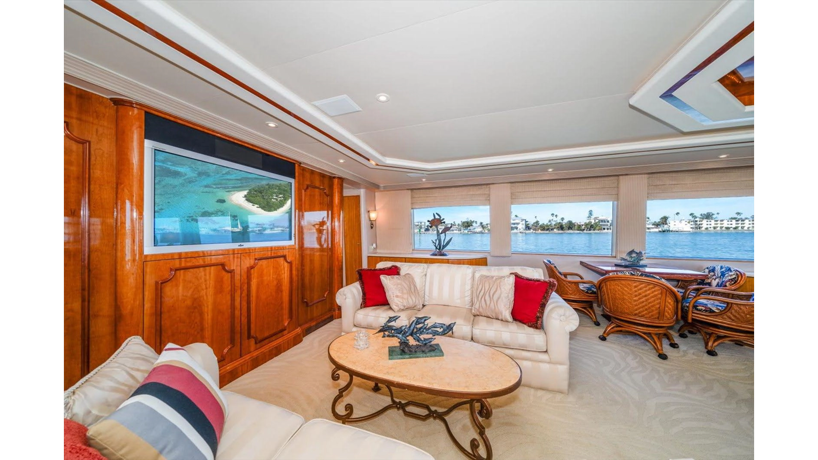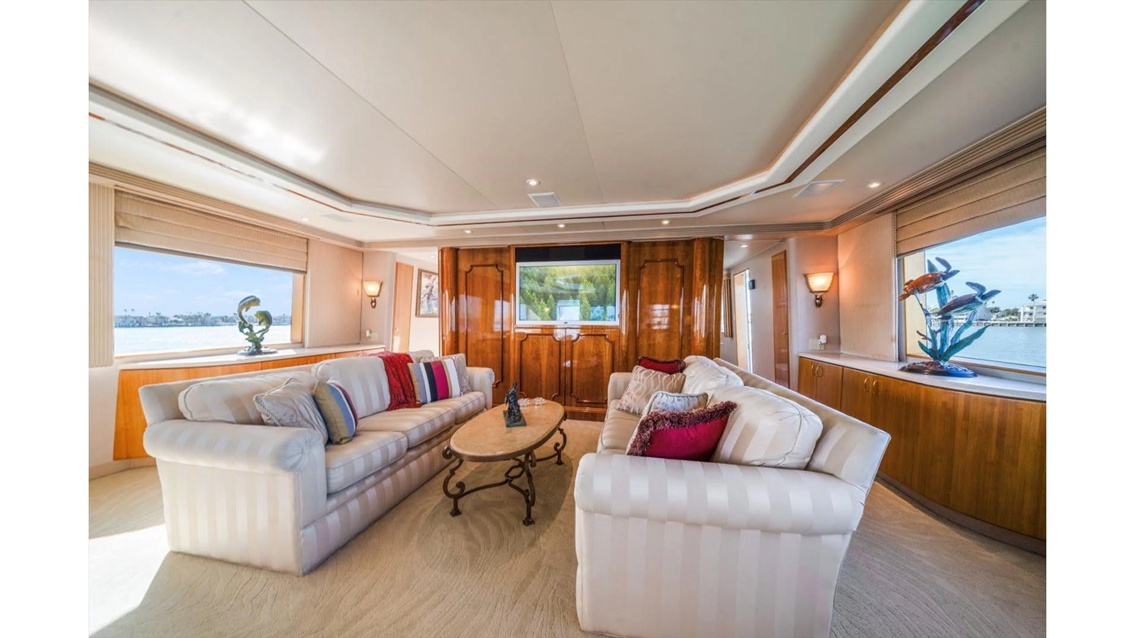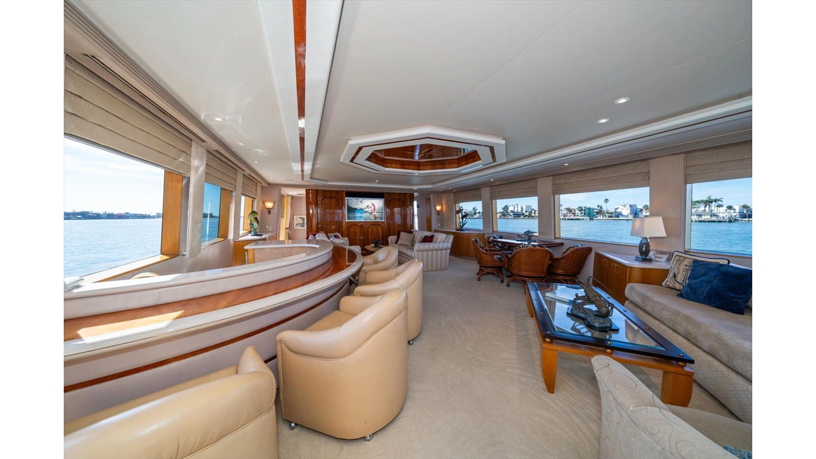 The open luxury Main Salon is very large with a custom entertainment center forward with custom wrap-around sofas.