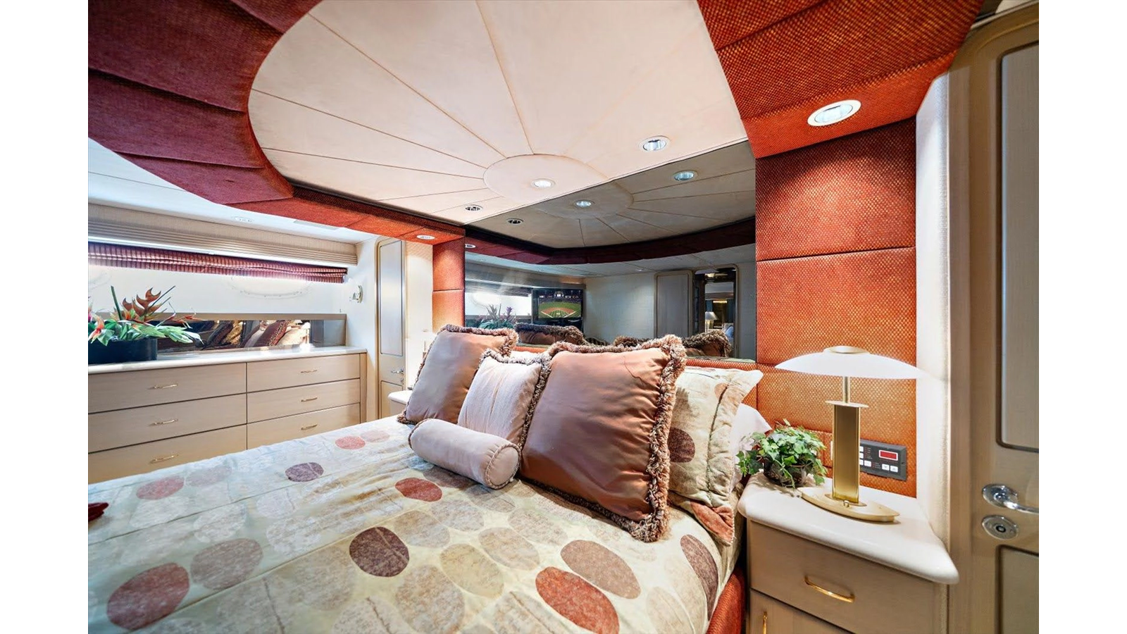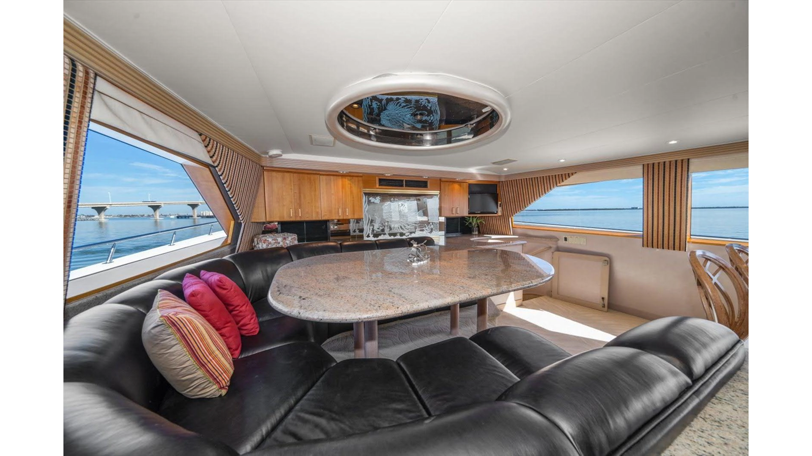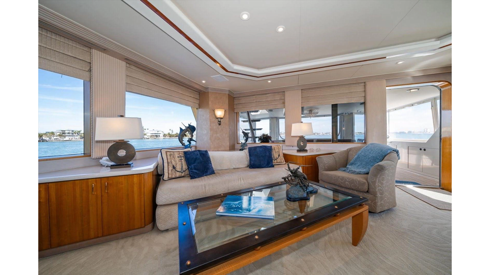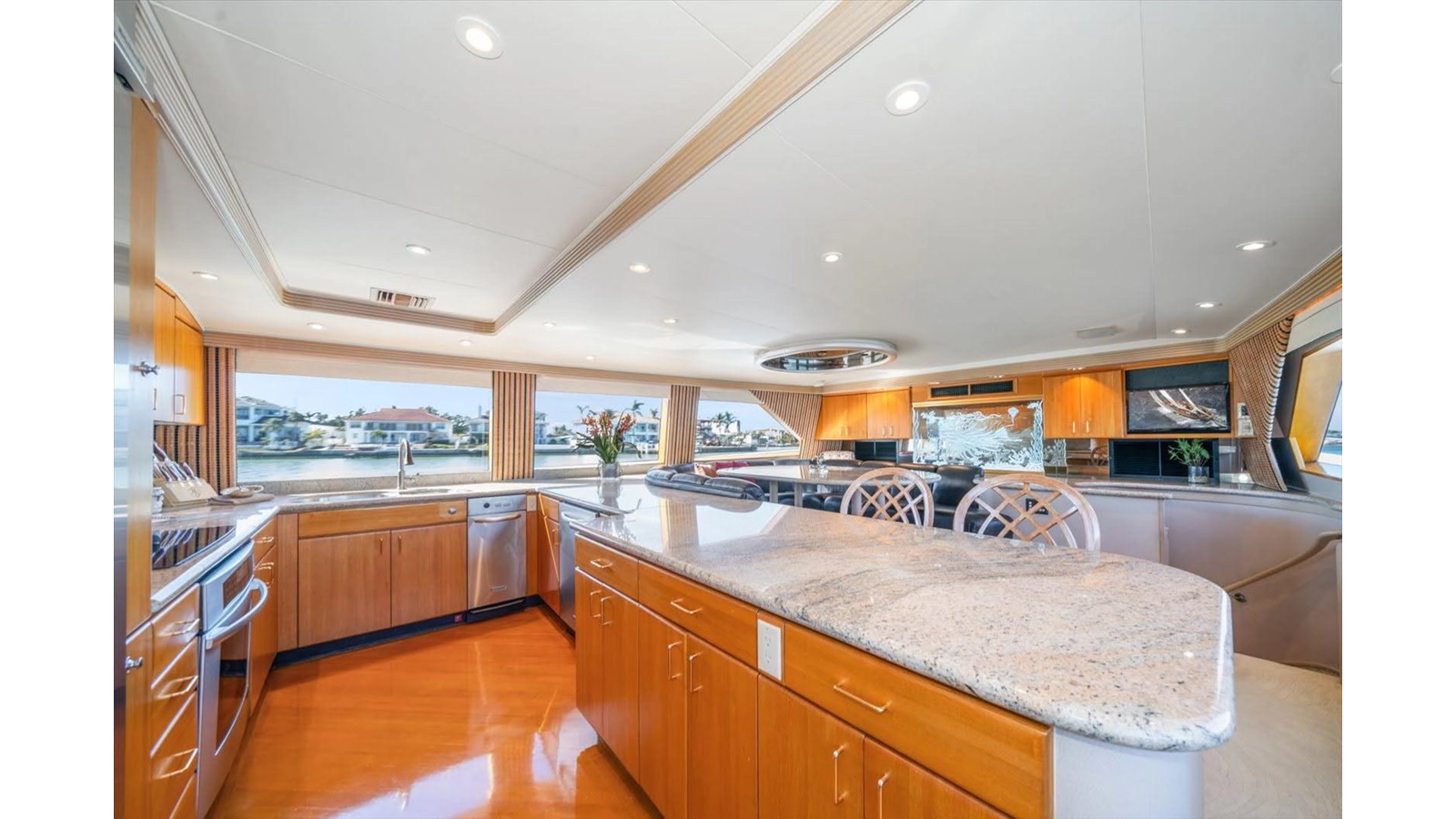 The open luxury Main Salon is very large with a custom entertainment center forward with custom wrap-around sofas.