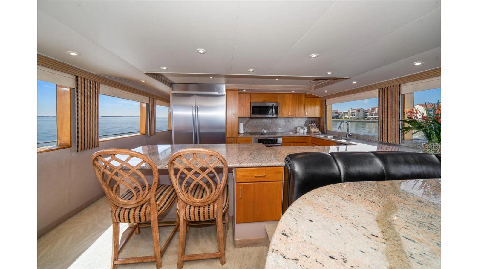 The Country Kitchen gourmet Galley is open and has a very casual feeling with custom Granite counter tops and a wrap-around U-Shaped raised dinette seating all with beautiful wood flooring and carpet. The seating is leather with perfect shape for a most comfortable dining experience for 10+. The dinette is also raised for panoramic viewing. An additional two bar stools pull over to the dinette for additional seating. The Galley has custom upper/lower pull-out pantry cabinet with locking latches.