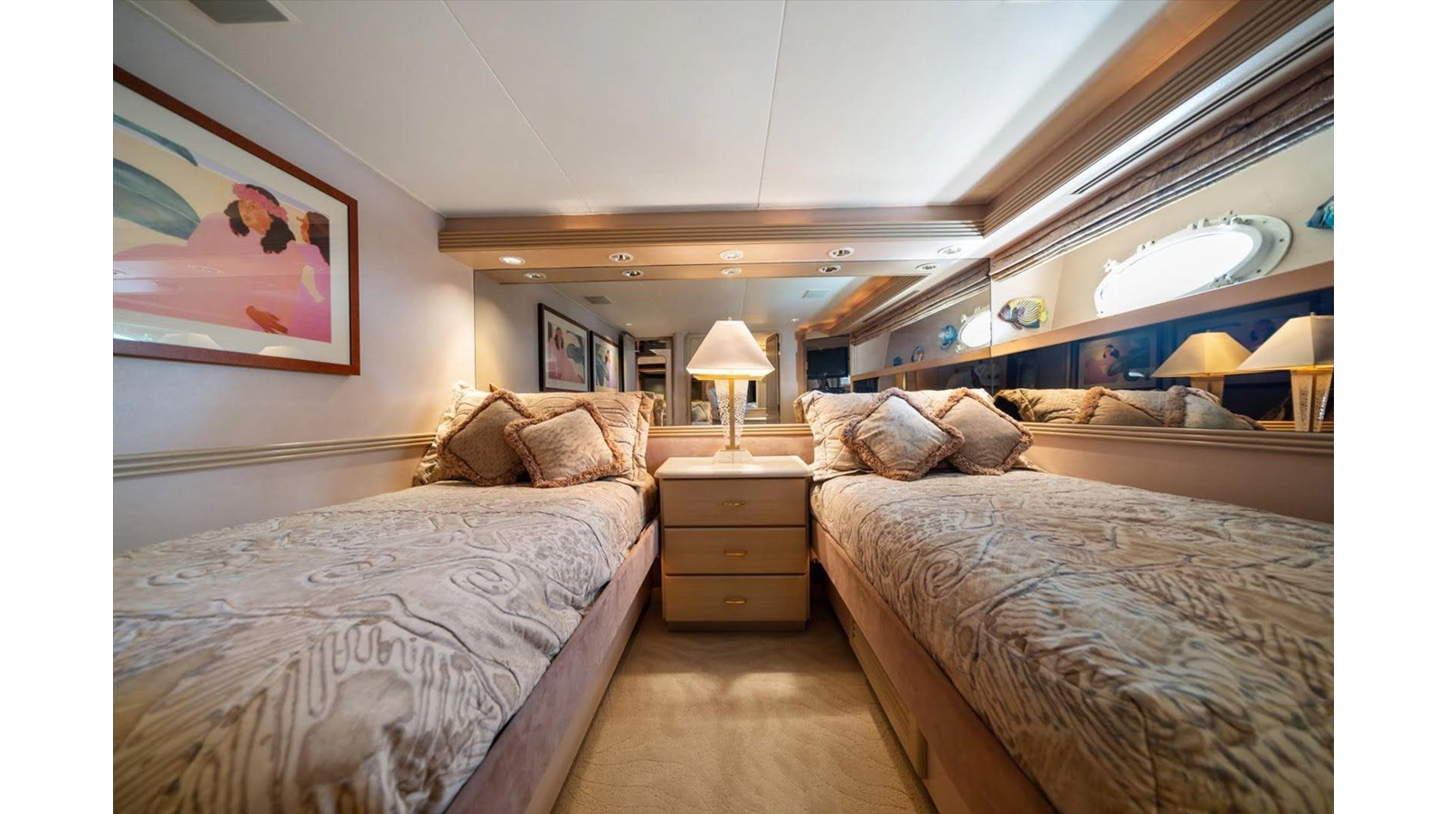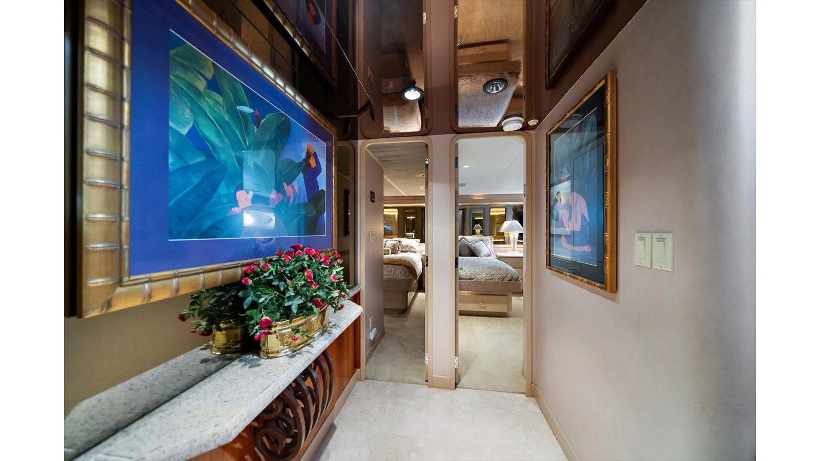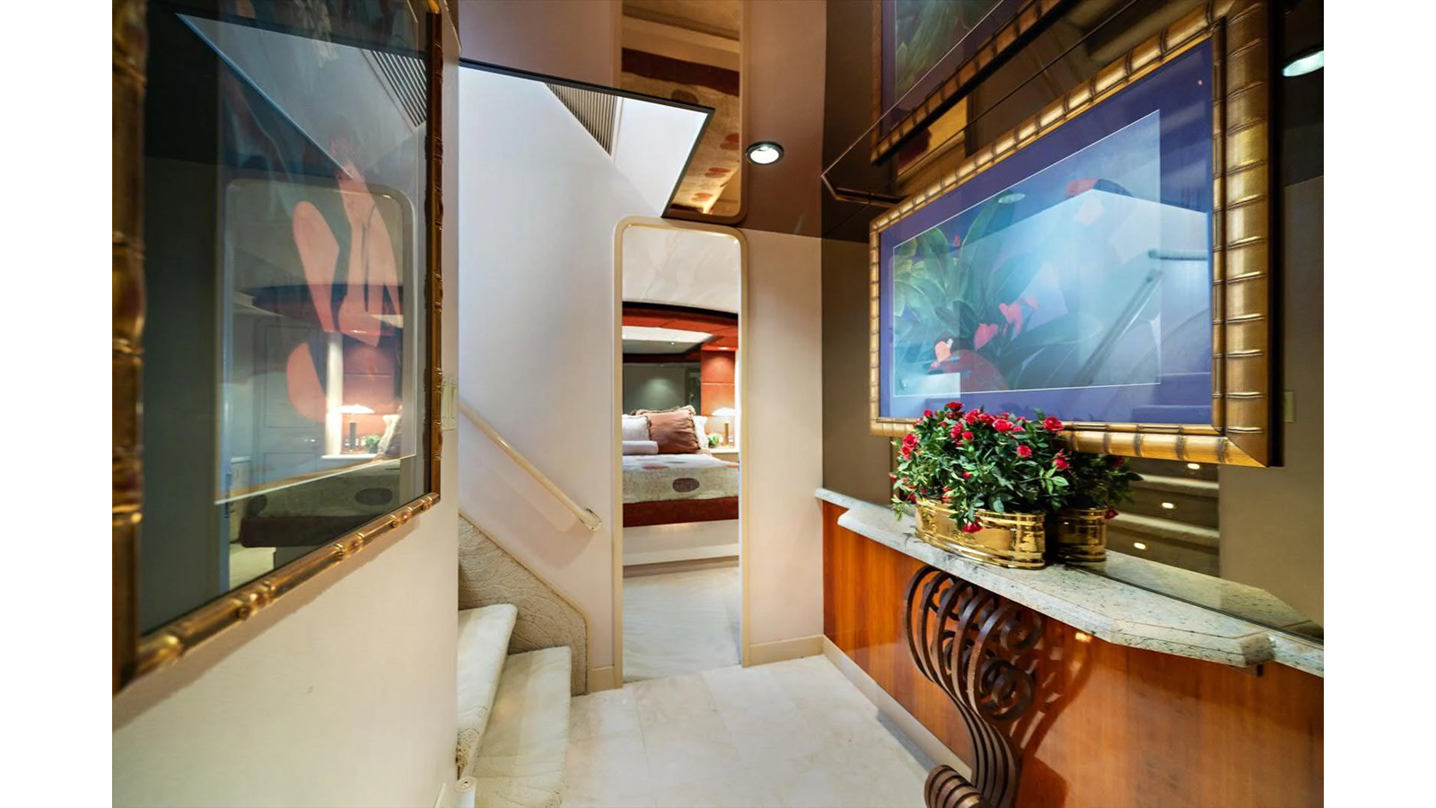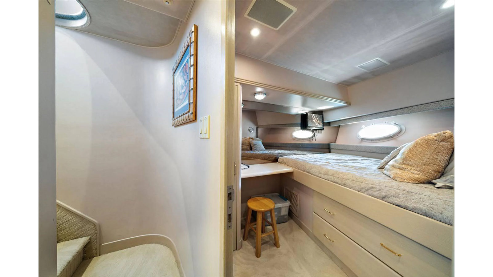 There is 1 master and 2 guest staterooms accessible from the port stairway. Once down at the bottom of the stairway, you will enter into a very elegant, tiled landing area/ foyer with access to all 3 staterooms with on suite heads.