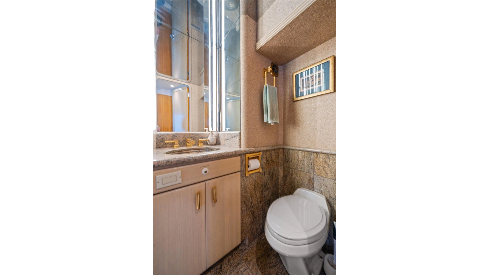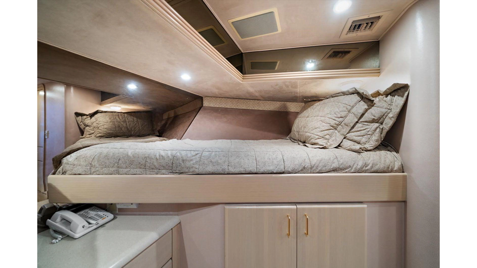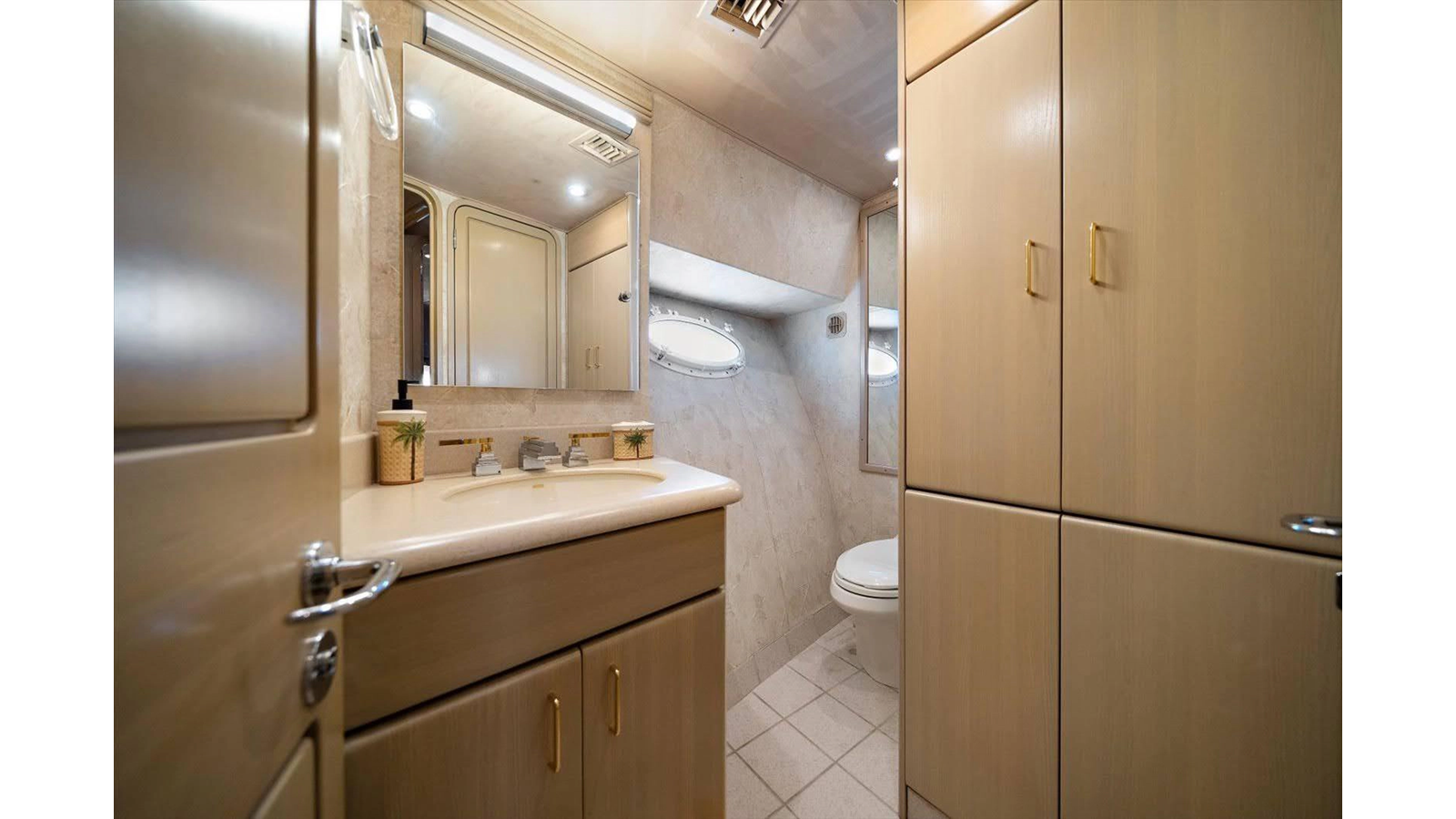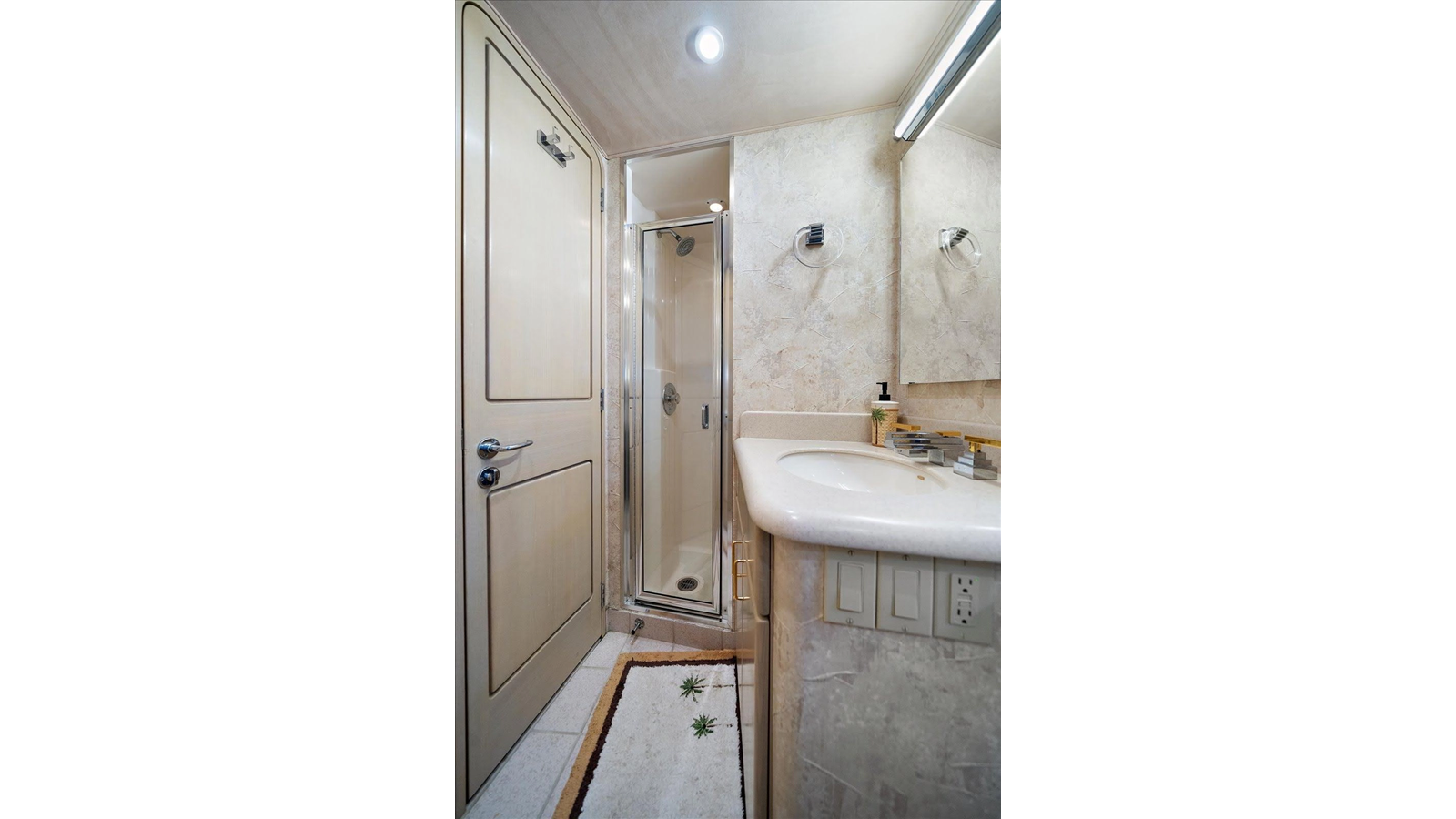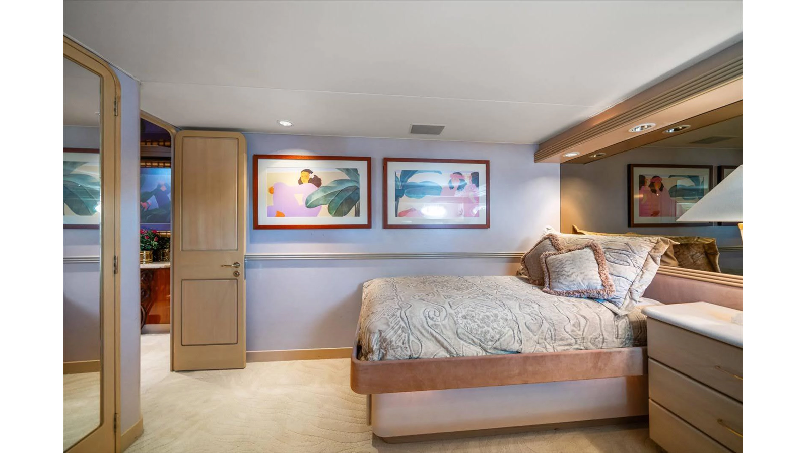 There is 1 master and 2 guest staterooms accessible from the port stairway. Once down at the bottom of the stairway, you will enter into a very elegant, tiled landing area/ foyer with access to all 3 staterooms with on suite heads.