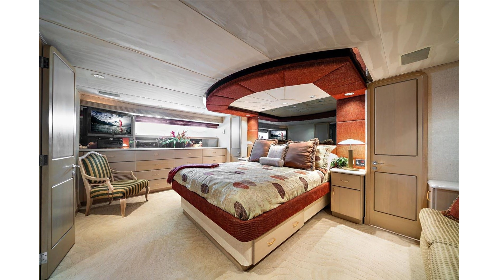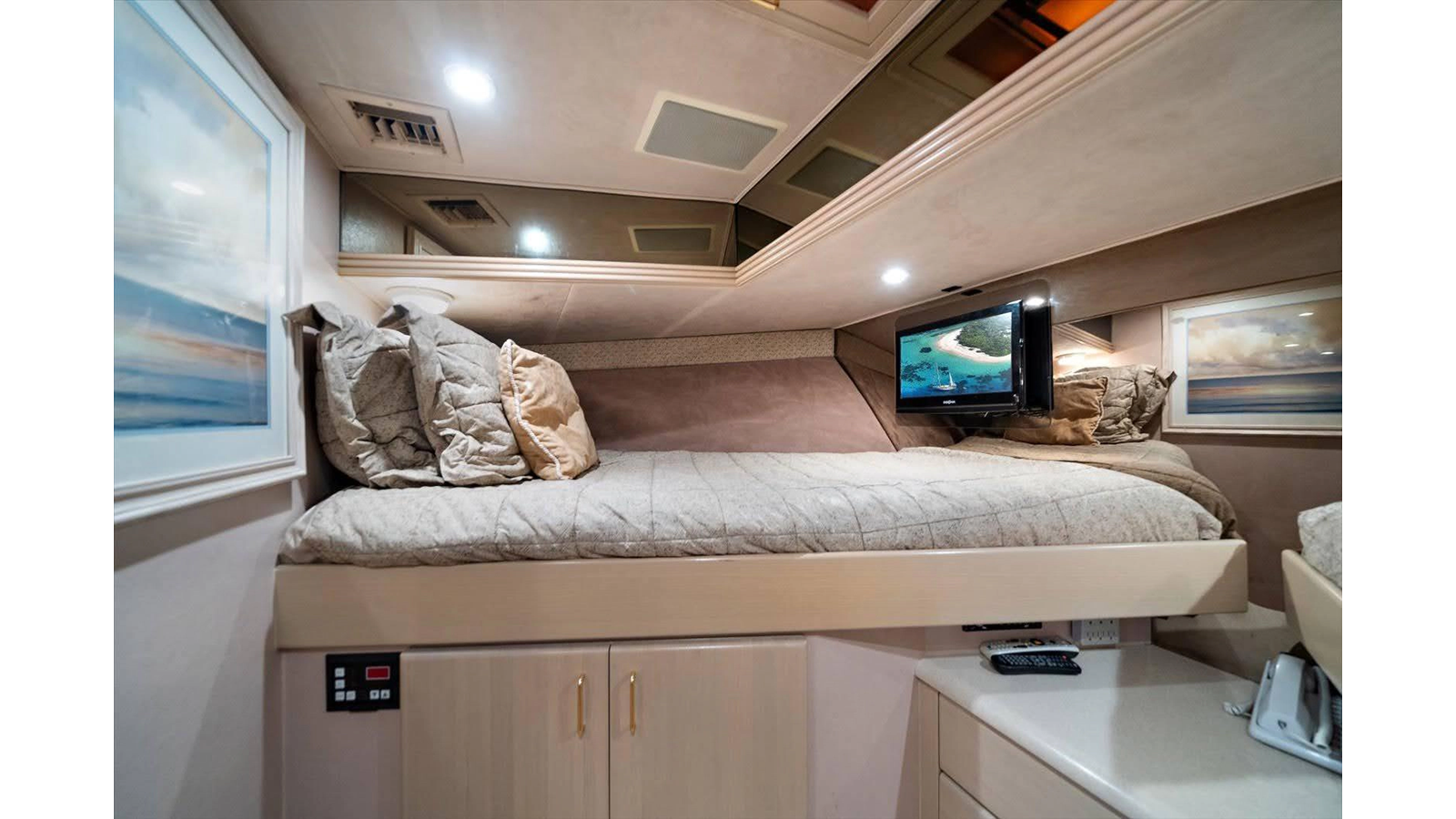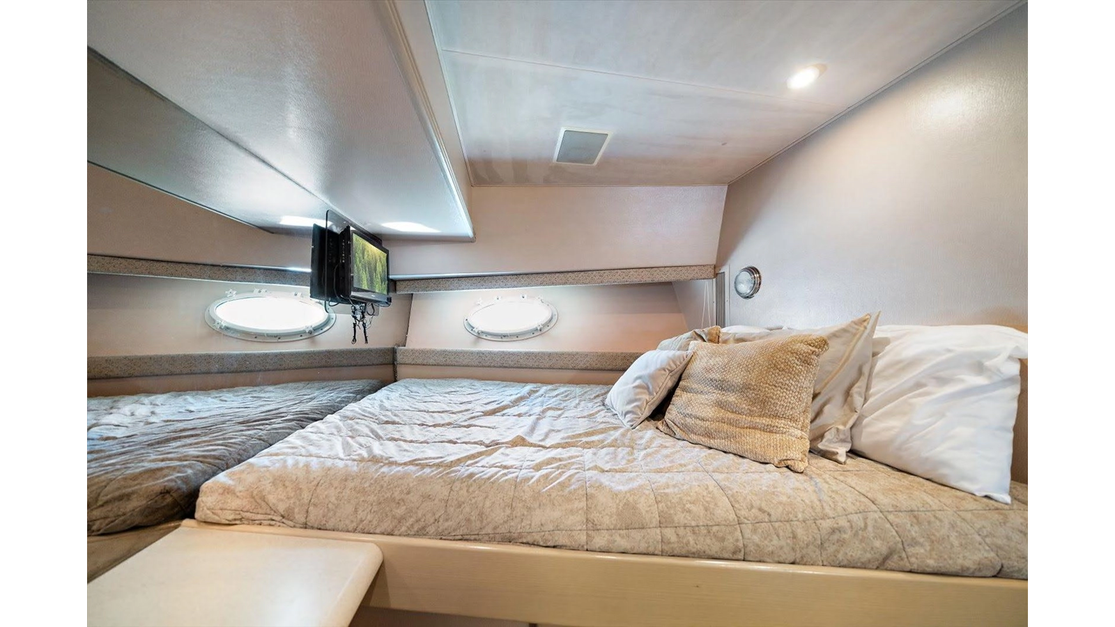 To starboard, there is a double birth (2 twin beds), to port there is a single birth (1 queen bed) and then there is a beautiful full beam king master suite, with sitting area with a large shower separating twin heads and vanities. All, of the guest staterooms have TV's and audio equipment, large closets for plenty of storage and open space.