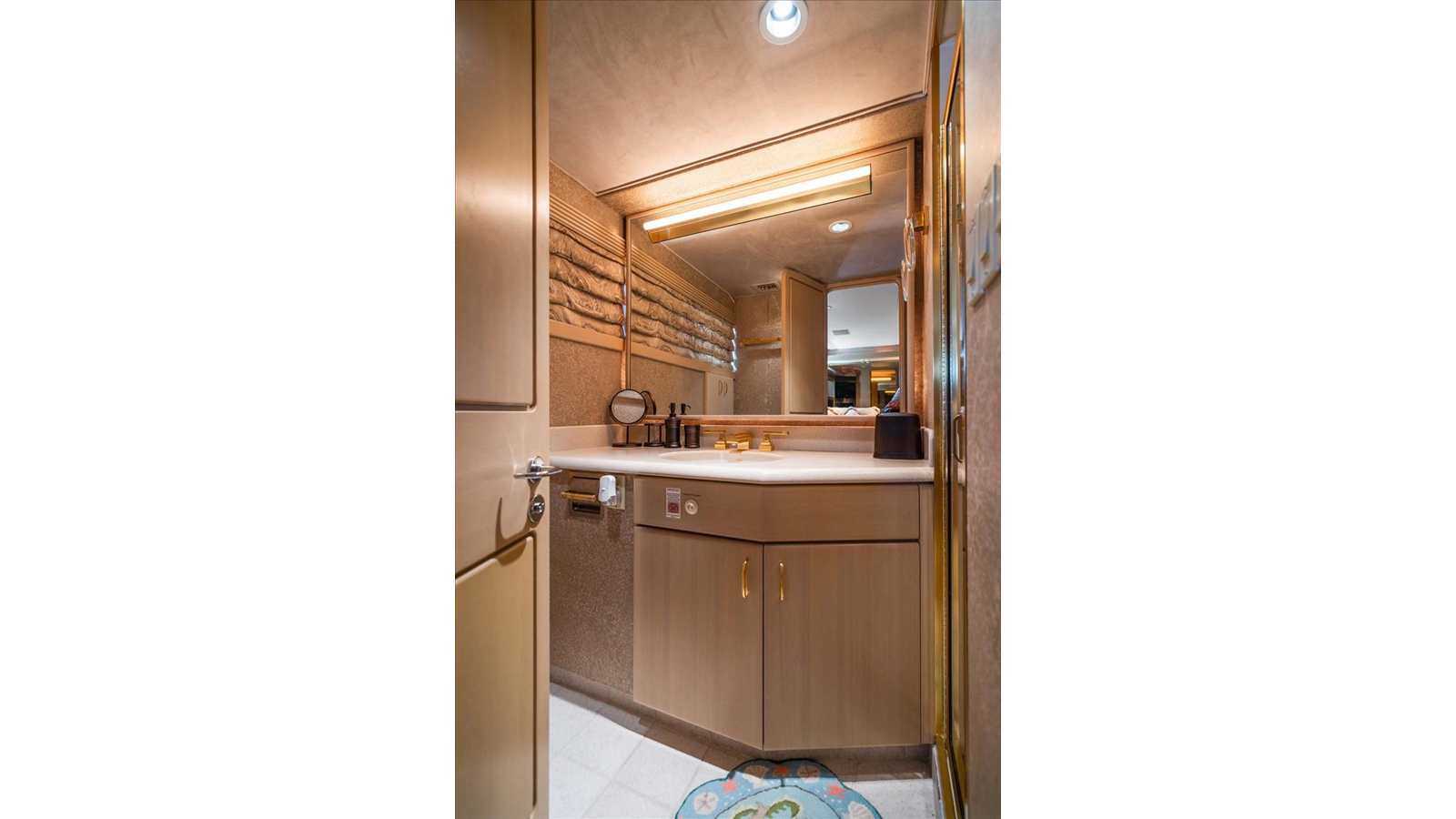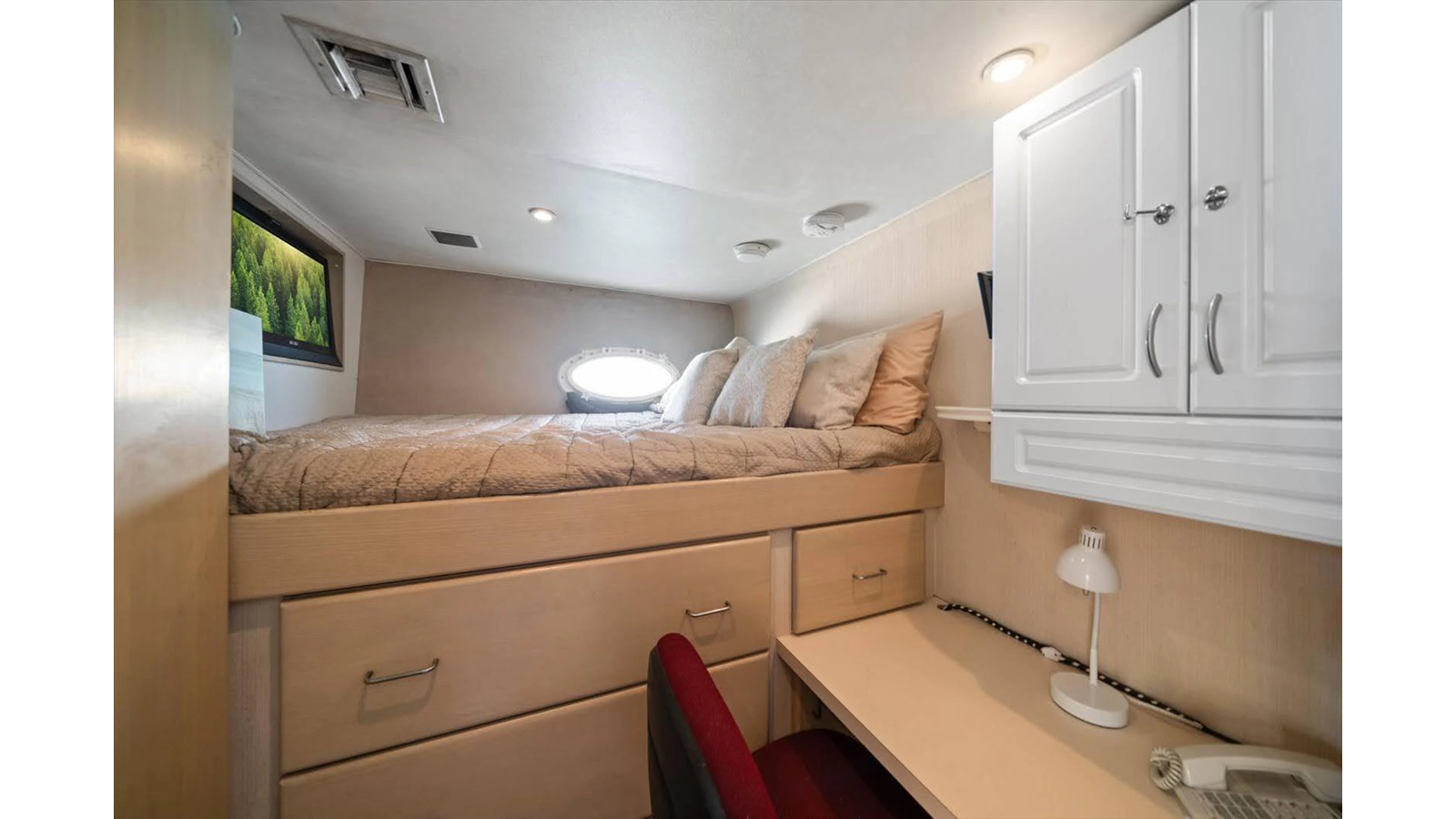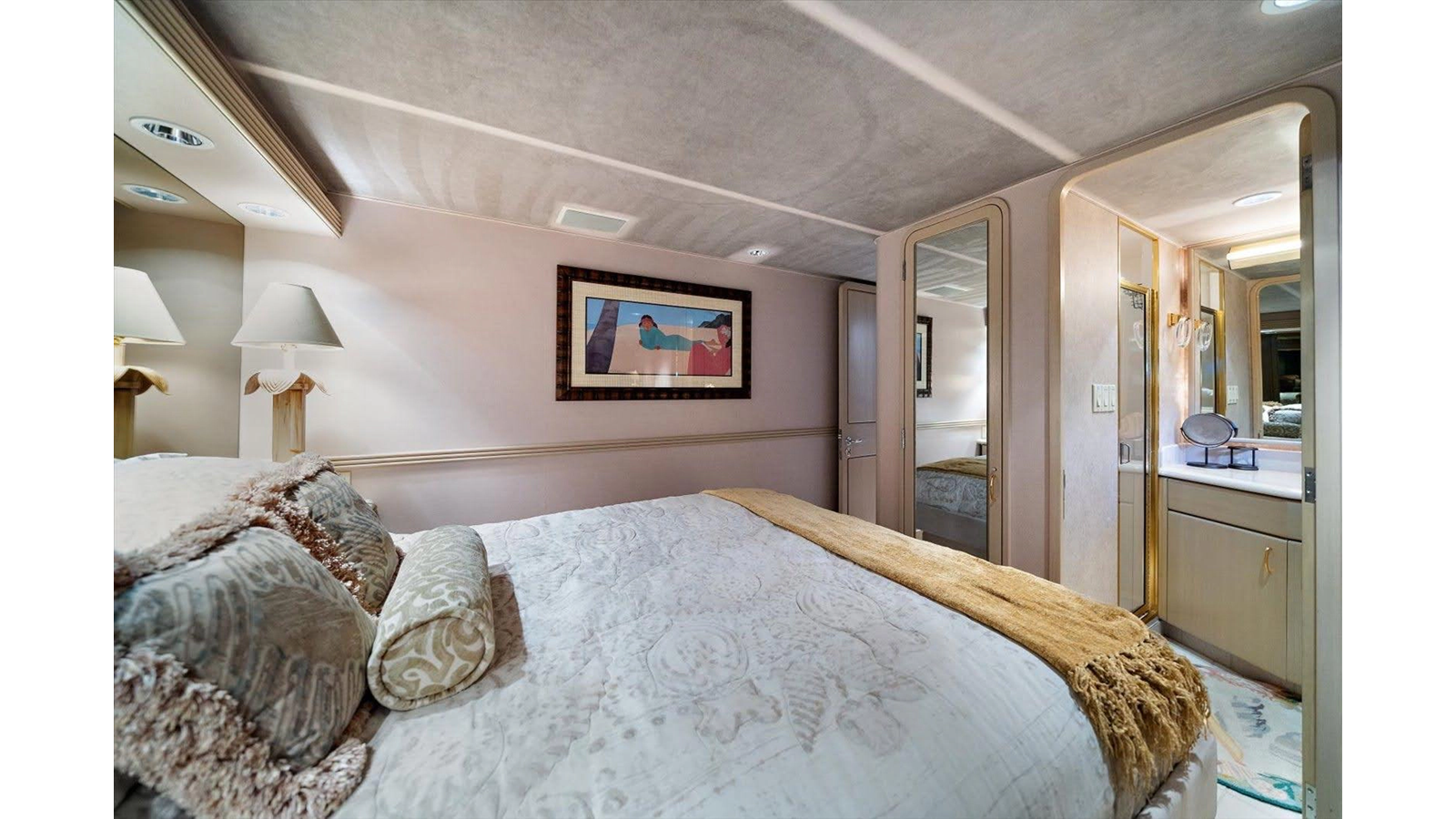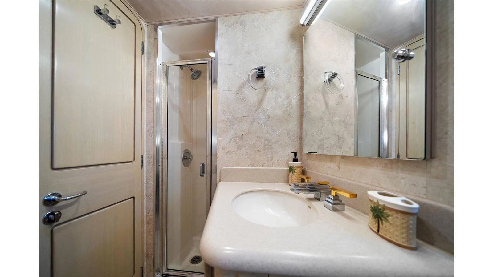 To starboard, there is a double birth (2 twin beds), to port there is a single birth (1 queen bed) and then there is a beautiful full beam king master suite, with sitting area with a large shower separating twin heads and vanities. All, of the guest staterooms have TV's and audio equipment, large closets for plenty of storage and open space.