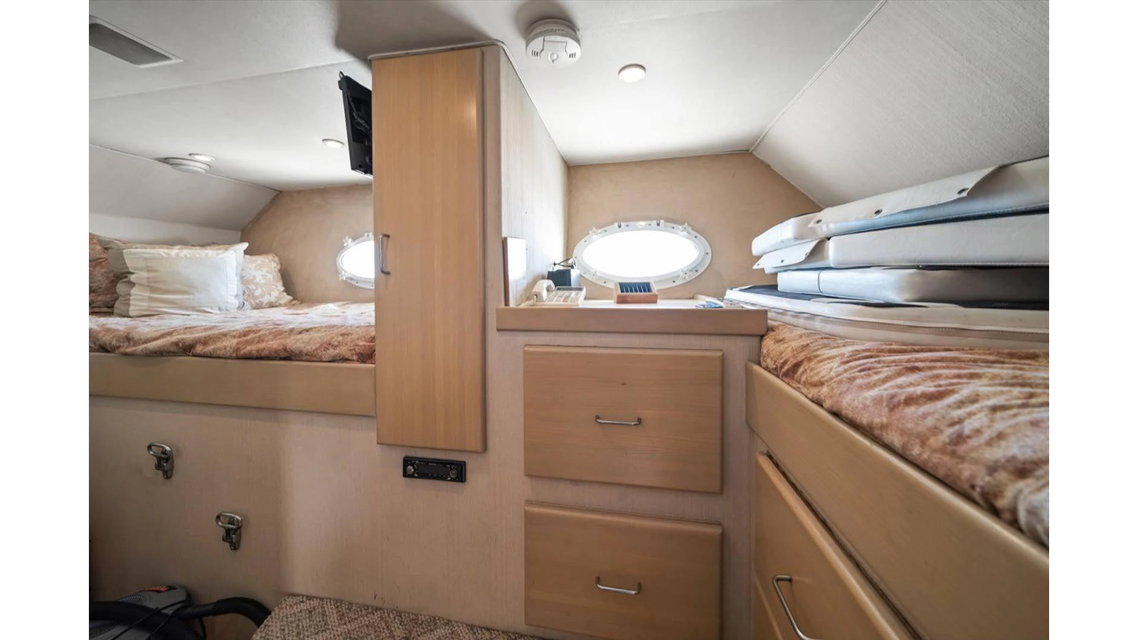 2 Guest staterooms are forward, accessible from the starboard side stairway with an ensuite single head and shower, starboard side. Forward, is a twin double berth (2 twin beds), and to port is a single double birth (1 full bed).