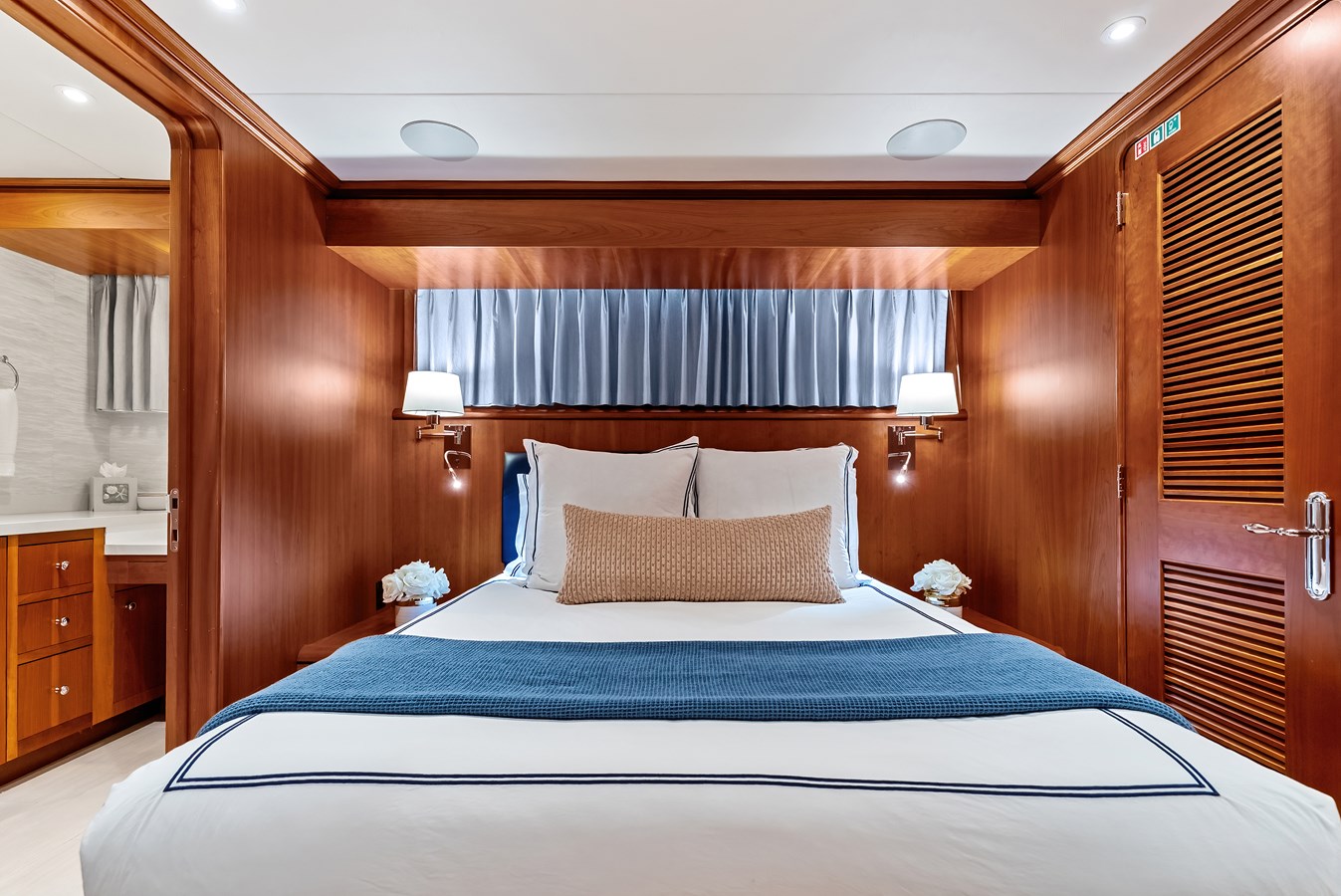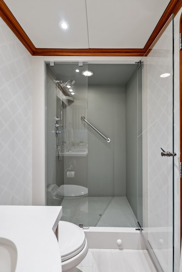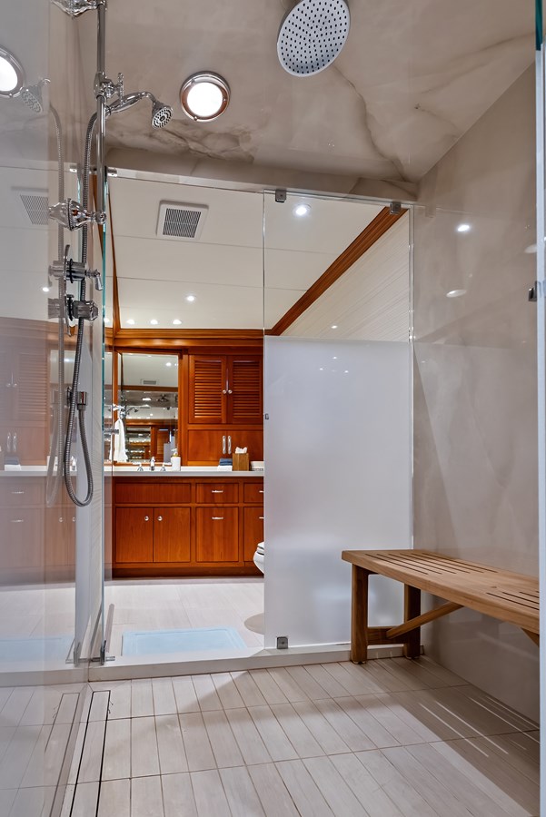 SILVER SEAS offers a rare, highly sought after four guest stateroom layout which comfortably accommodates eight in four ensuite staterooms. The guest accommodation is accessed from the main salon, starboard side foyer. A staircase, in a gently curving radius, descends to the foyer that provides access to all four staterooms. In addition to the staterooms, a linen closet and laundry center can be accessed from the foyer.