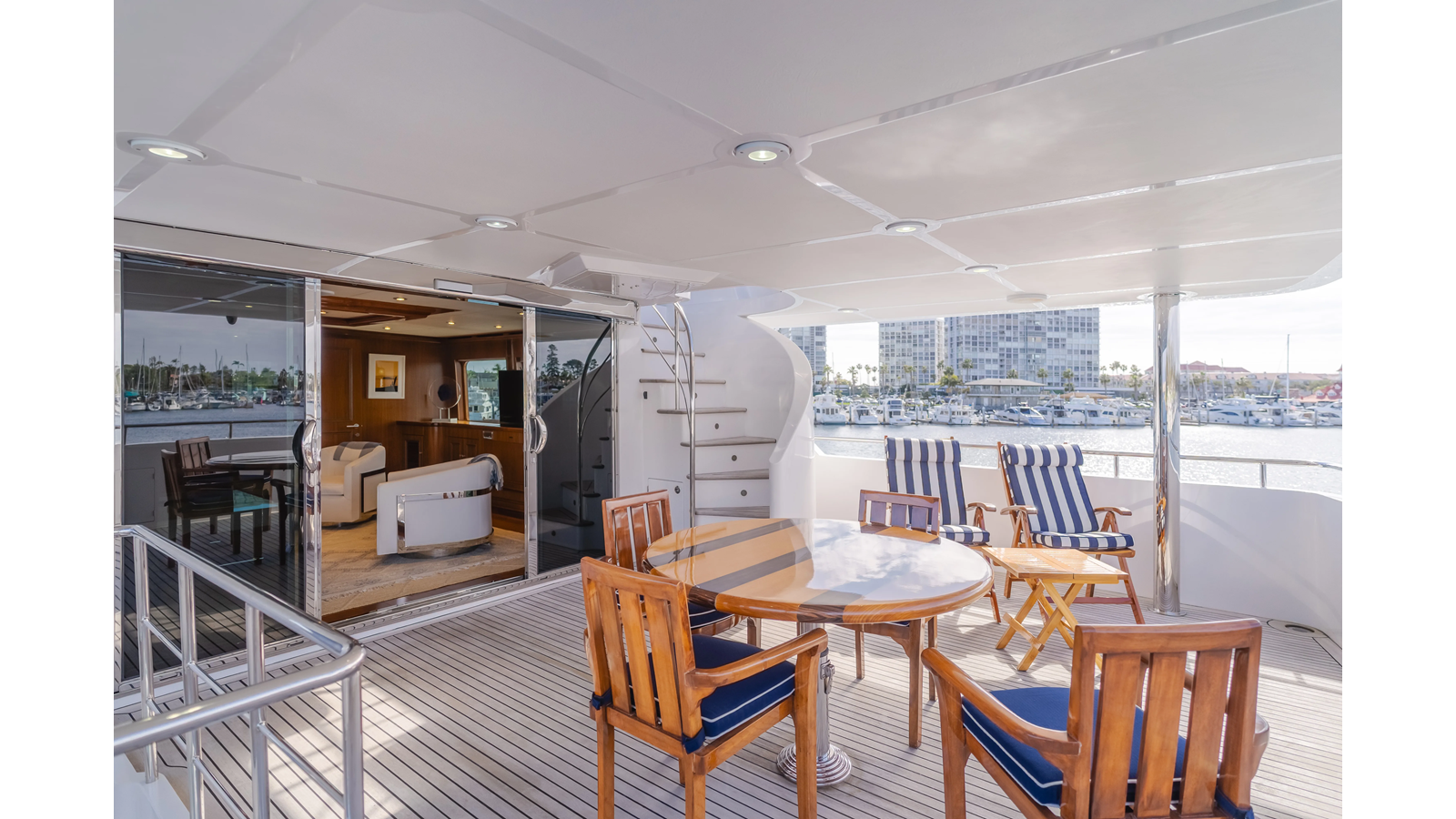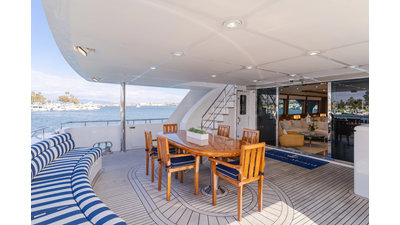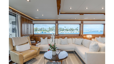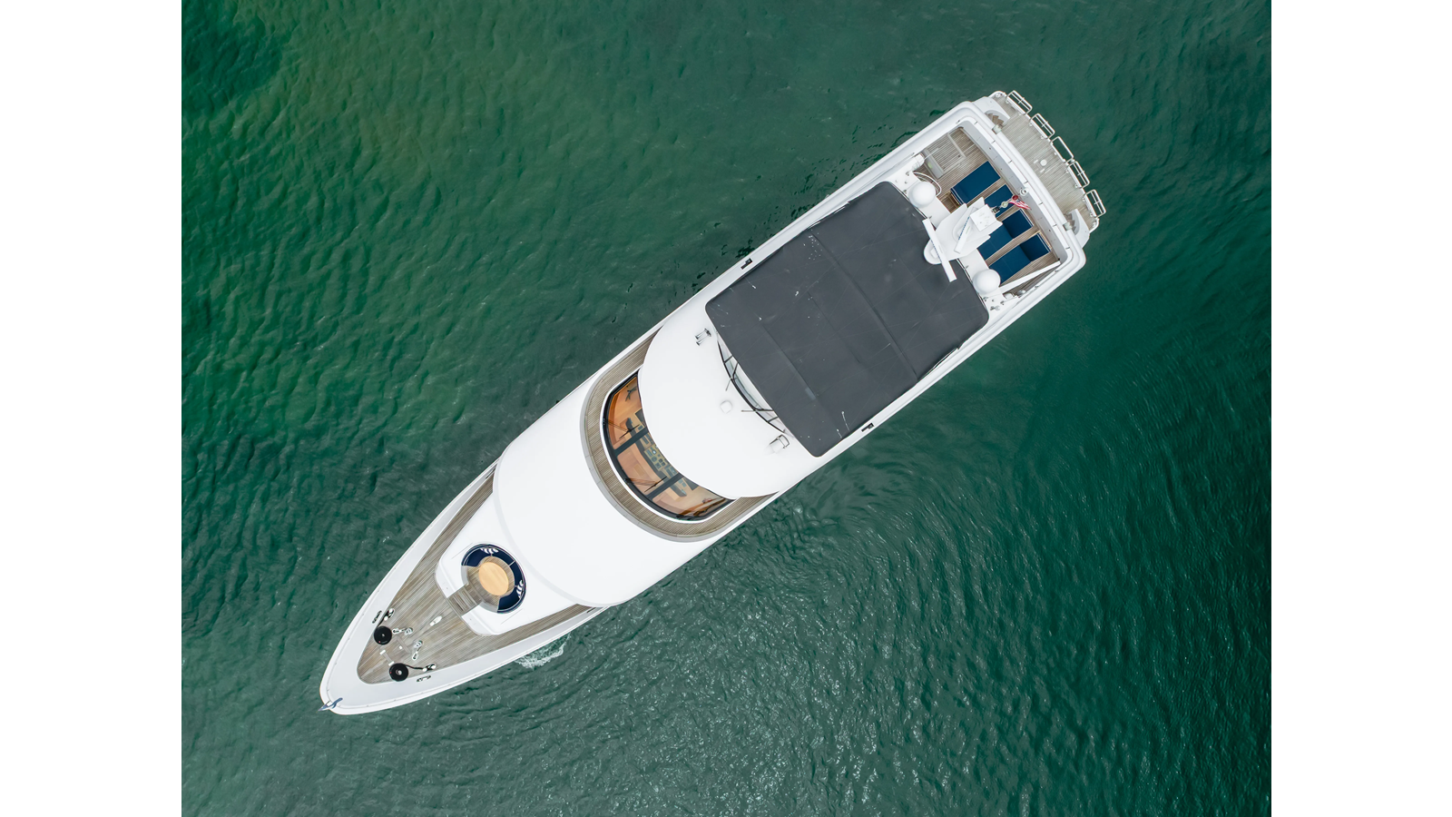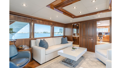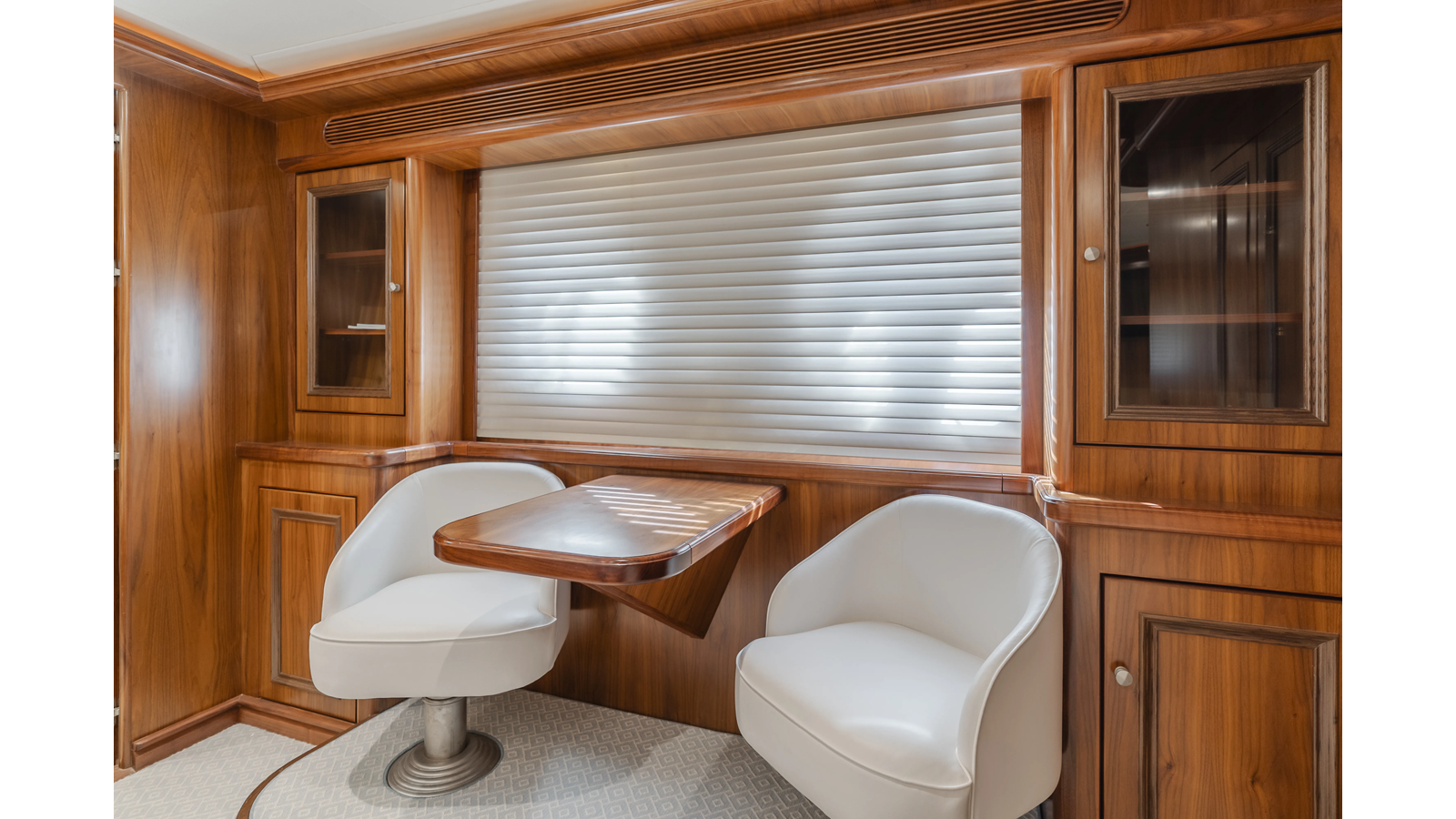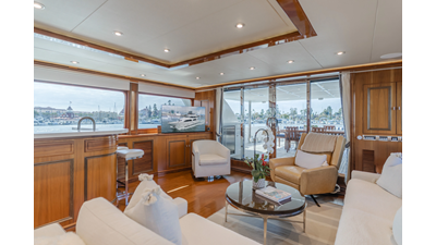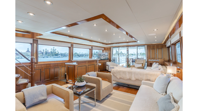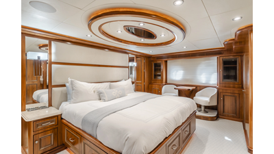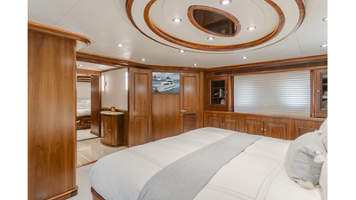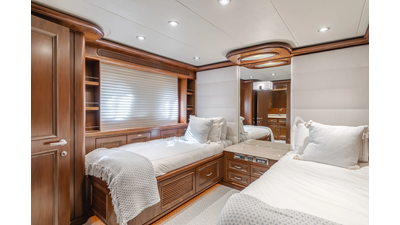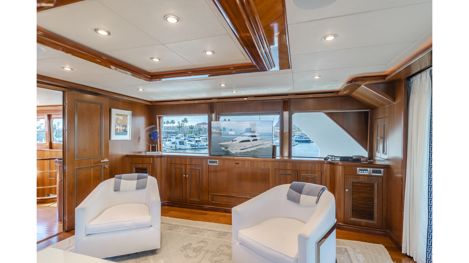 Accommodations: 4 staterooms and 6 heads. To create a 5th stateroom use the convertible king-size bed on the sun deck which has private deck access, and a full en-suite bathroom. Flexible Layout: Convertible coffee tables in the salon transform into dining tables seating 8-10 guests. Navigation & Stability: Fin stabilizers, bow and stern thrusters, and advanced Furuno navigation suite with night vision. Performance: Twin Caterpillar C-32 Acert engines with only 1,775 hours, cruising at 17 knots and a top speed of 22 knots. Recent service includes new bottom paint, hydraulic maintenance, and new freshwater pumps. Entertainment: Complete Sonos sound system, new TVs in master, VIP, guest cabins, salon, and flybridge. The flybridge is enclosed with Eisenglass and features new custom furniture. Interior: Custom furnishings, walnut paneling, Hunter Douglas electric blinds, upgraded lighting, and modernized HVAC. Outdoor Spaces: Teak decks, new flybridge Stidd seating, wet bar with refrigeration, customized bow seating, and a 2018 Walker Bay tender. Mechanical: Fully serviced hydraulics, new battery chargers, updated air conditioning units, and new life rafts.