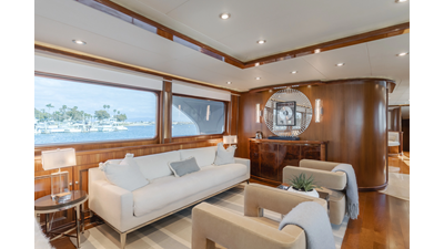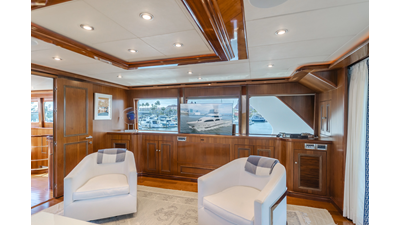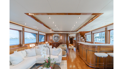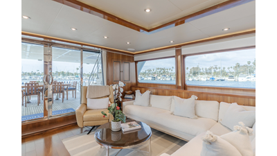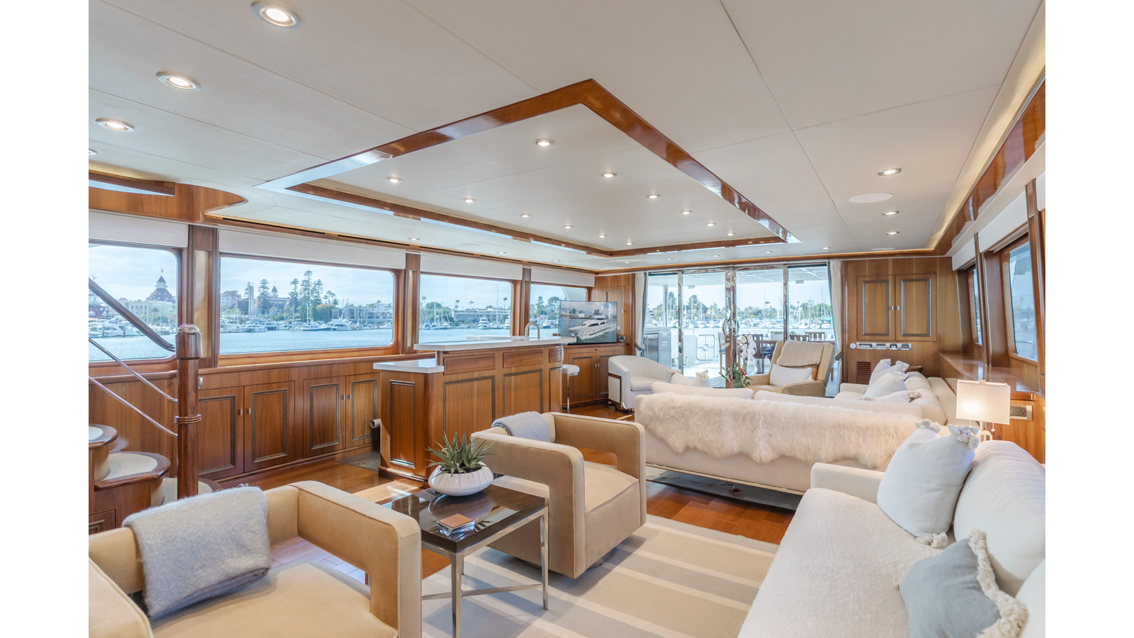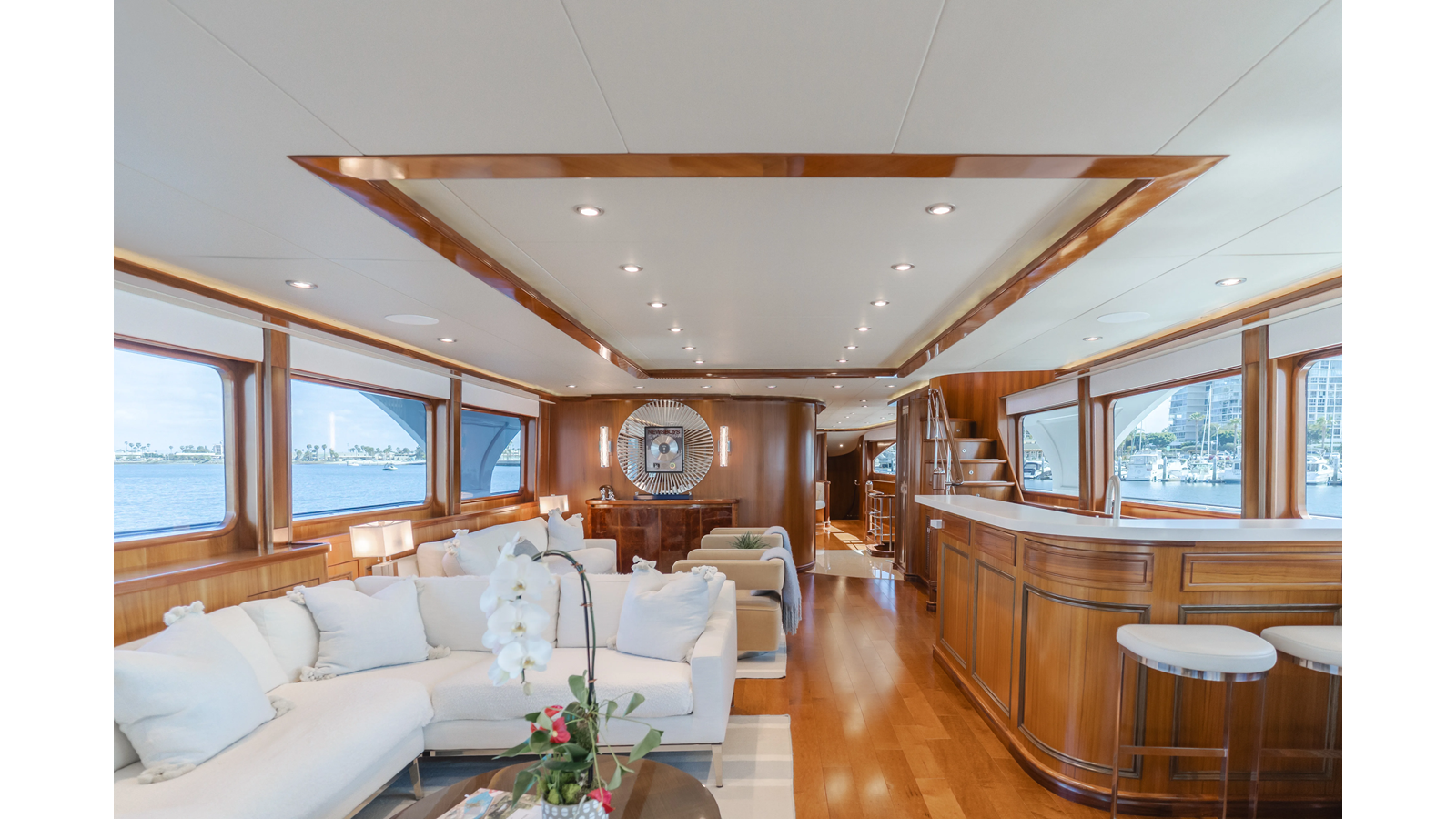 New hardwood floors in salon and Galley 50” Plasma TV with remote lifter Stereo and DVD player 24VDC or 120VAC lights 120VAC receptacles (4) Salon L shape settees w/a lamp counter & table (1) Arm chair (1) Dinette table with chairs (8) Art cabinet in fwd side w/storage underneath Double granite counter wet bar with ice maker/refrigerator Automatic stainless steel frame salon access sliding door Air conditioning 32,000 BTU President 107’ Triple Deck Mega Yacht