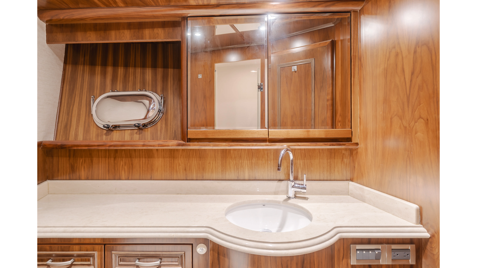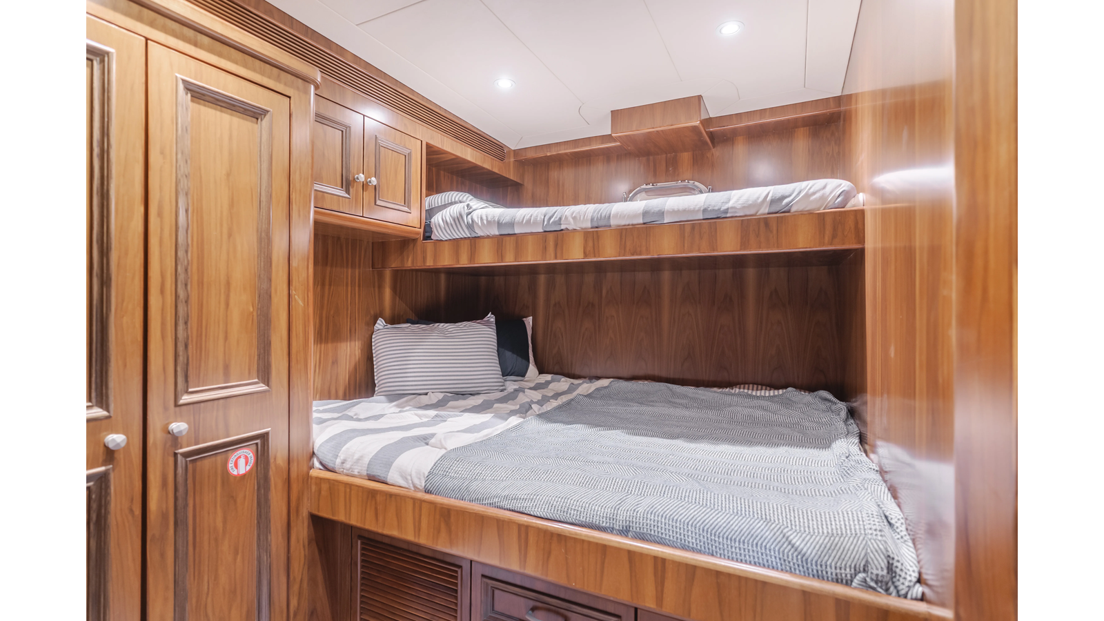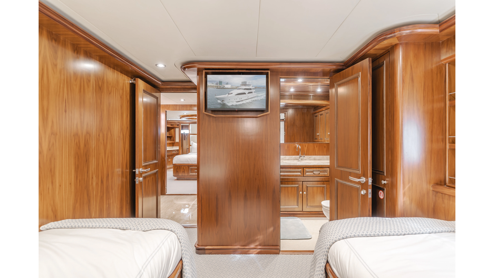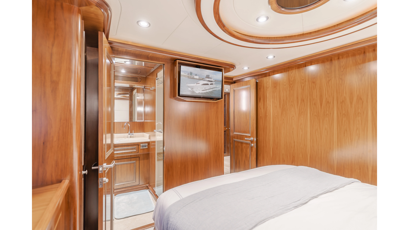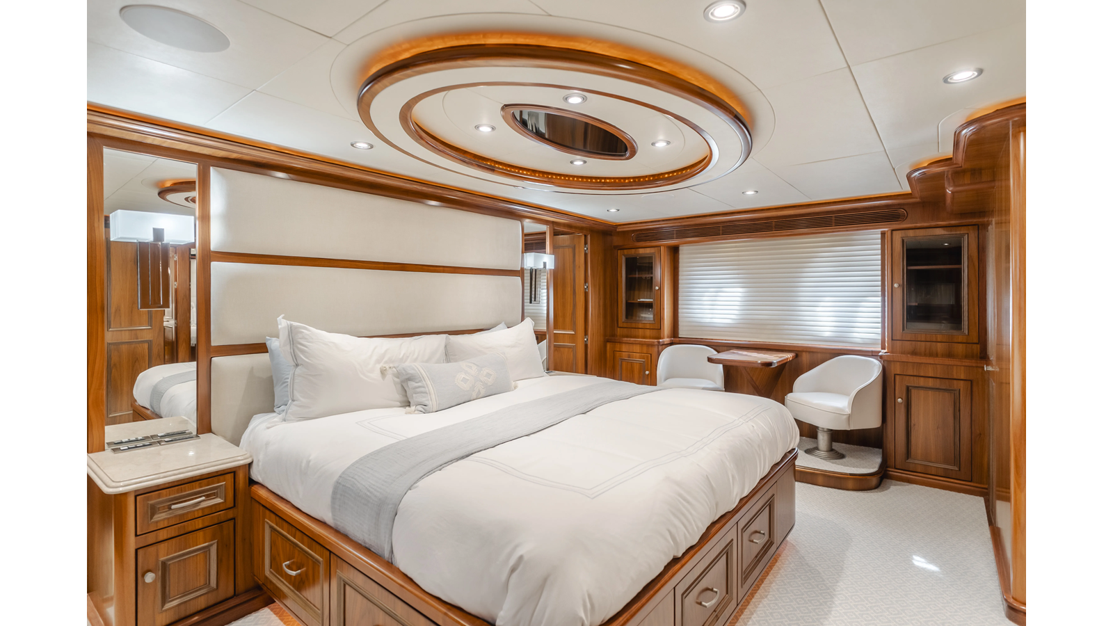 Master Suite: Full-beam with king-size bed, private en-suite with Jacuzzi, 50" TV, and Sonos sound system. VIP Stateroom: Queen berth, private en-suite, granite finishes, and 26" TV. Guest Staterooms: One double and one twin cabin, each with ensuite heads and updated AV systems. Convertible Fifth Stateroom (Sun Deck): King-size sofa-bed, private deck access, full bathroom for an elevated guest experience. Crew Quarters: Captain’s cabin with double berth, private head, and a fully equipped crew galley.