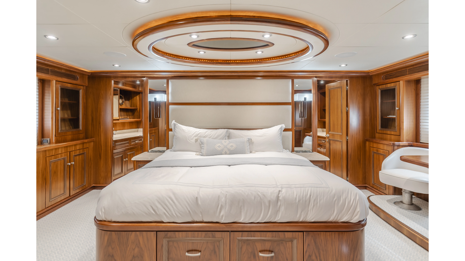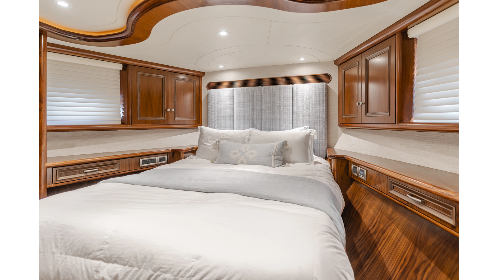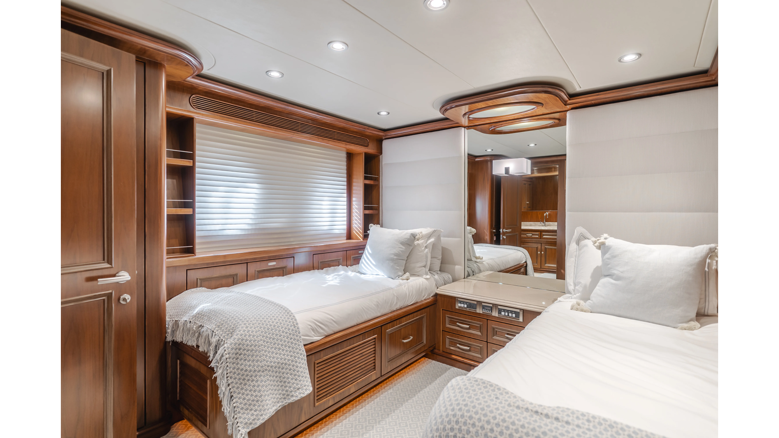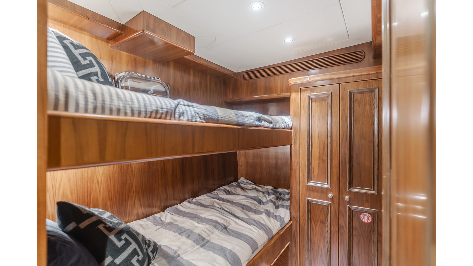Master Suite: Full-beam with king-size bed, private en-suite with Jacuzzi, 50" TV, and Sonos sound system. VIP Stateroom: Queen berth, private en-suite, granite finishes, and 26" TV. Guest Staterooms: One double and one twin cabin, each with ensuite heads and updated AV systems. Convertible Fifth Stateroom (Sun Deck): King-size sofa-bed, private deck access, full bathroom for an elevated guest experience. Crew Quarters: Captain’s cabin with double berth, private head, and a fully equipped crew galley.