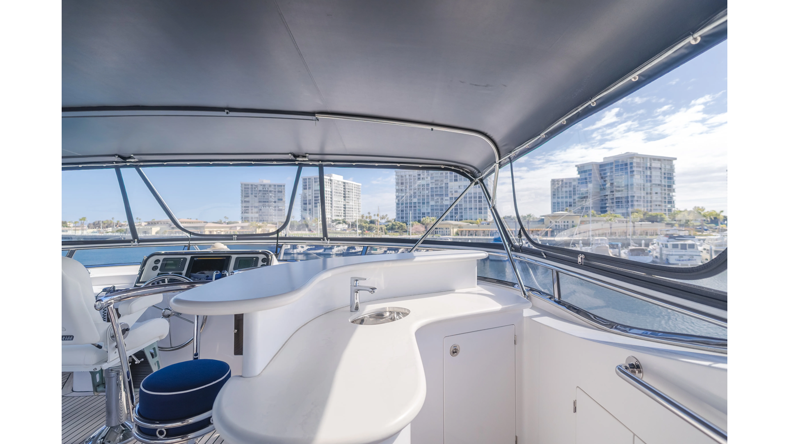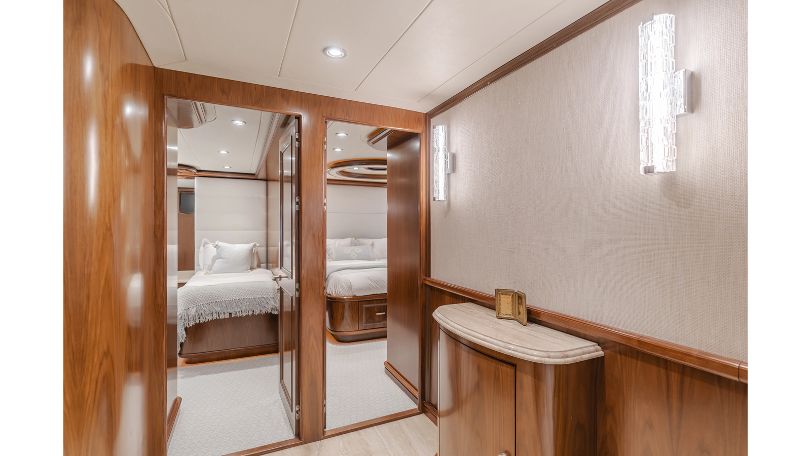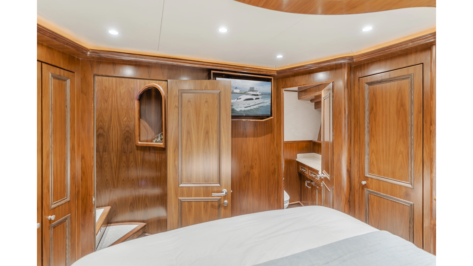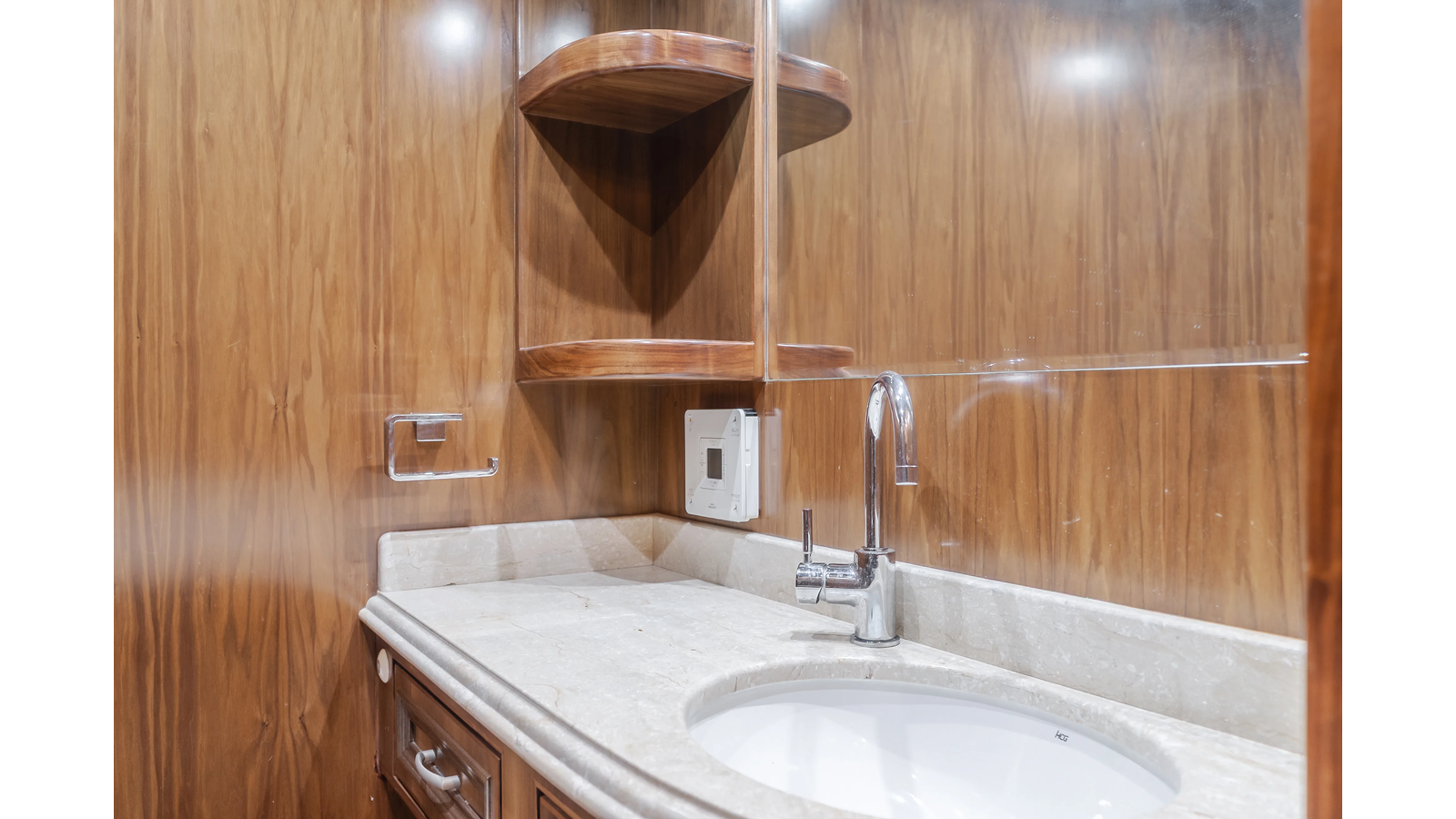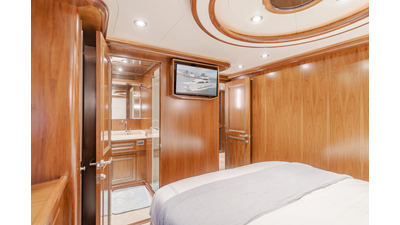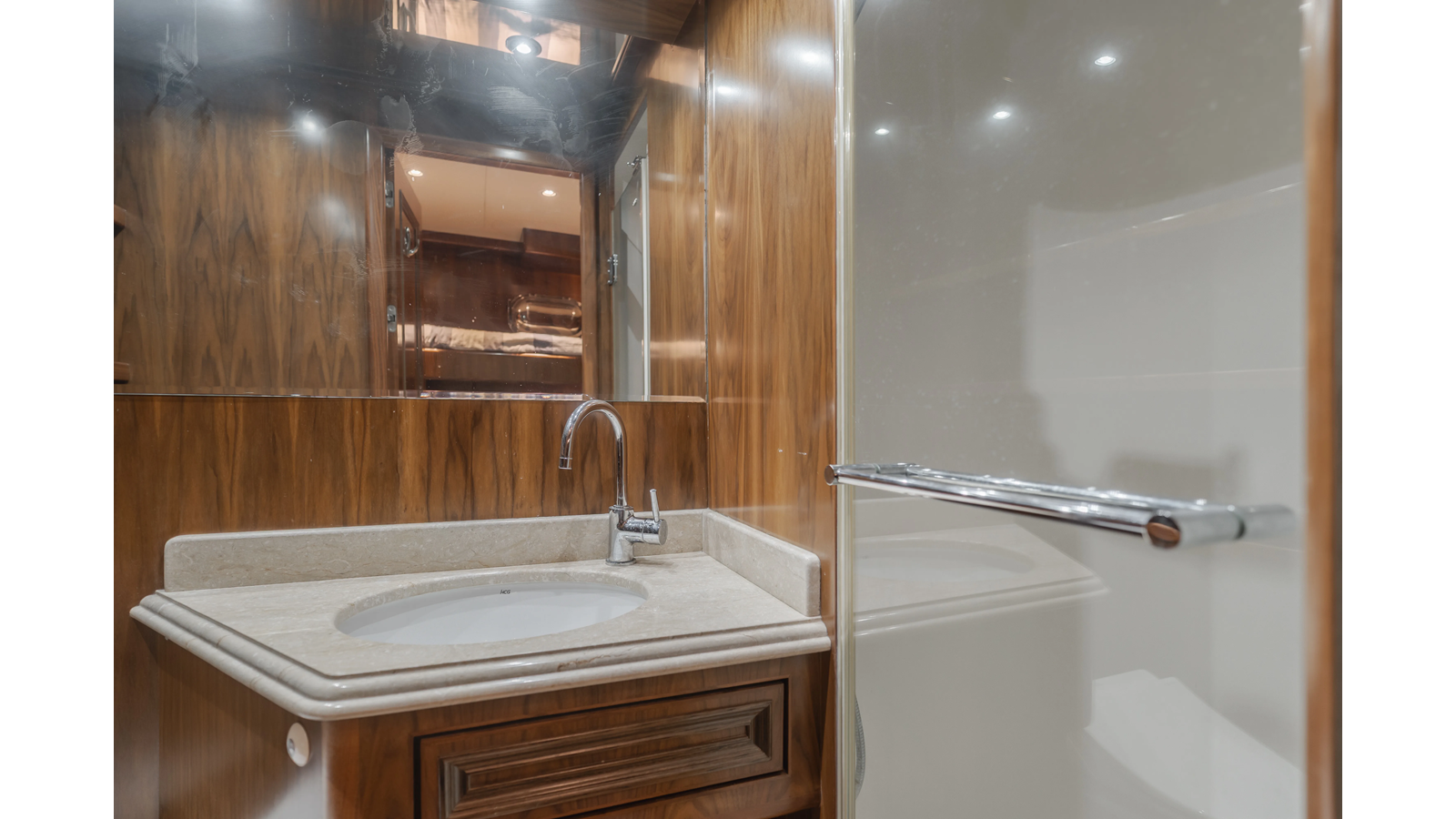 Master Suite: Full-beam with king-size bed, private en-suite with Jacuzzi, 50" TV, and Sonos sound system. VIP Stateroom: Queen berth, private en-suite, granite finishes, and 26" TV. Guest Staterooms: One double and one twin cabin, each with ensuite heads and updated AV systems. Convertible Fifth Stateroom (Sun Deck): King-size sofa-bed, private deck access, full bathroom for an elevated guest experience. Crew Quarters: Captain’s cabin with double berth, private head, and a fully equipped crew galley.