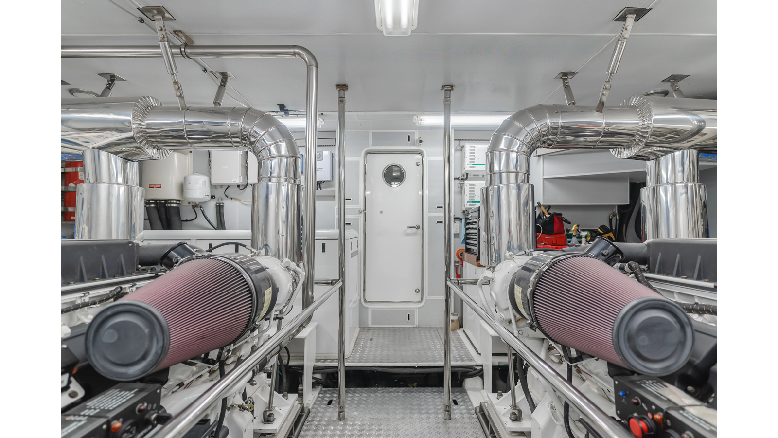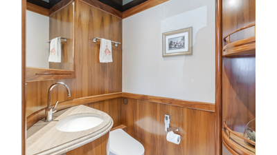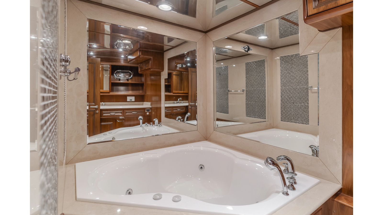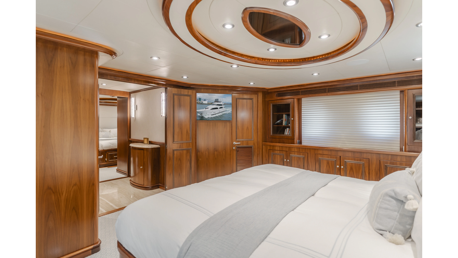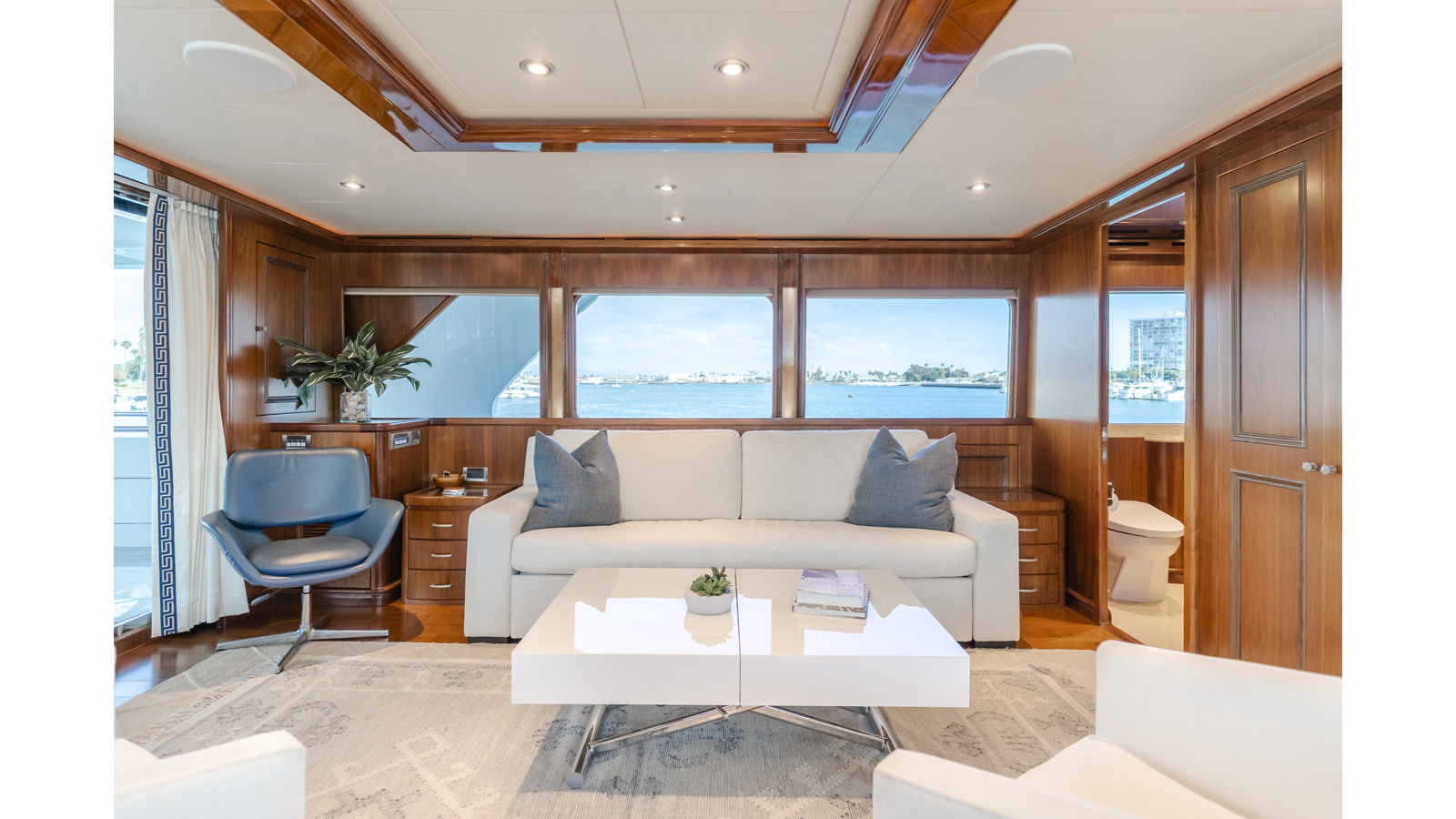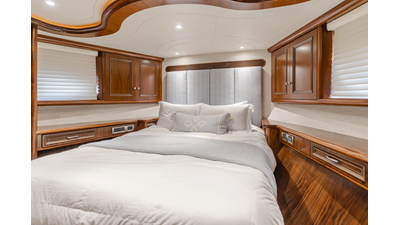 Master Suite: Full-beam with king-size bed, private en-suite with Jacuzzi, 50" TV, and Sonos sound system. VIP Stateroom: Queen berth, private en-suite, granite finishes, and 26" TV. Guest Staterooms: One double and one twin cabin, each with ensuite heads and updated AV systems. Convertible Fifth Stateroom (Sun Deck): King-size sofa-bed, private deck access, full bathroom for an elevated guest experience. Crew Quarters: Captain’s cabin with double berth, private head, and a fully equipped crew galley.