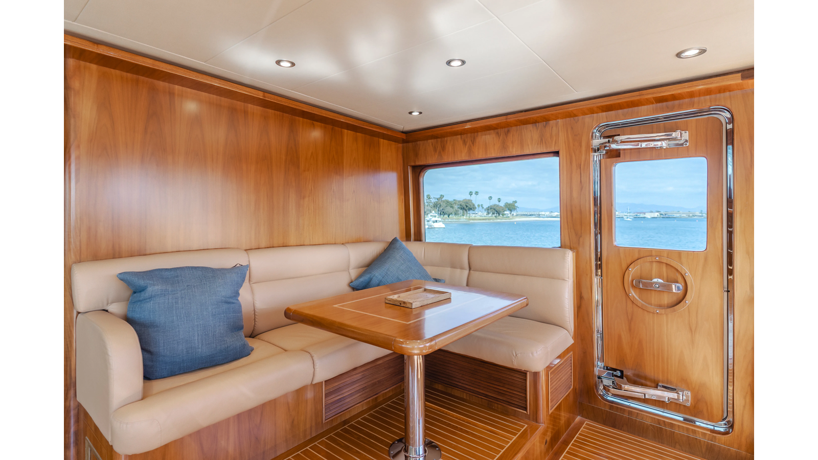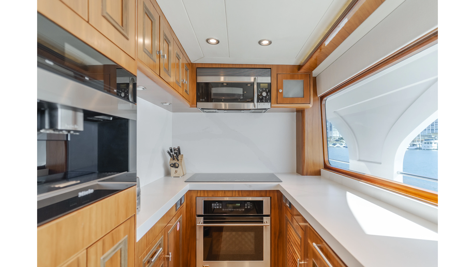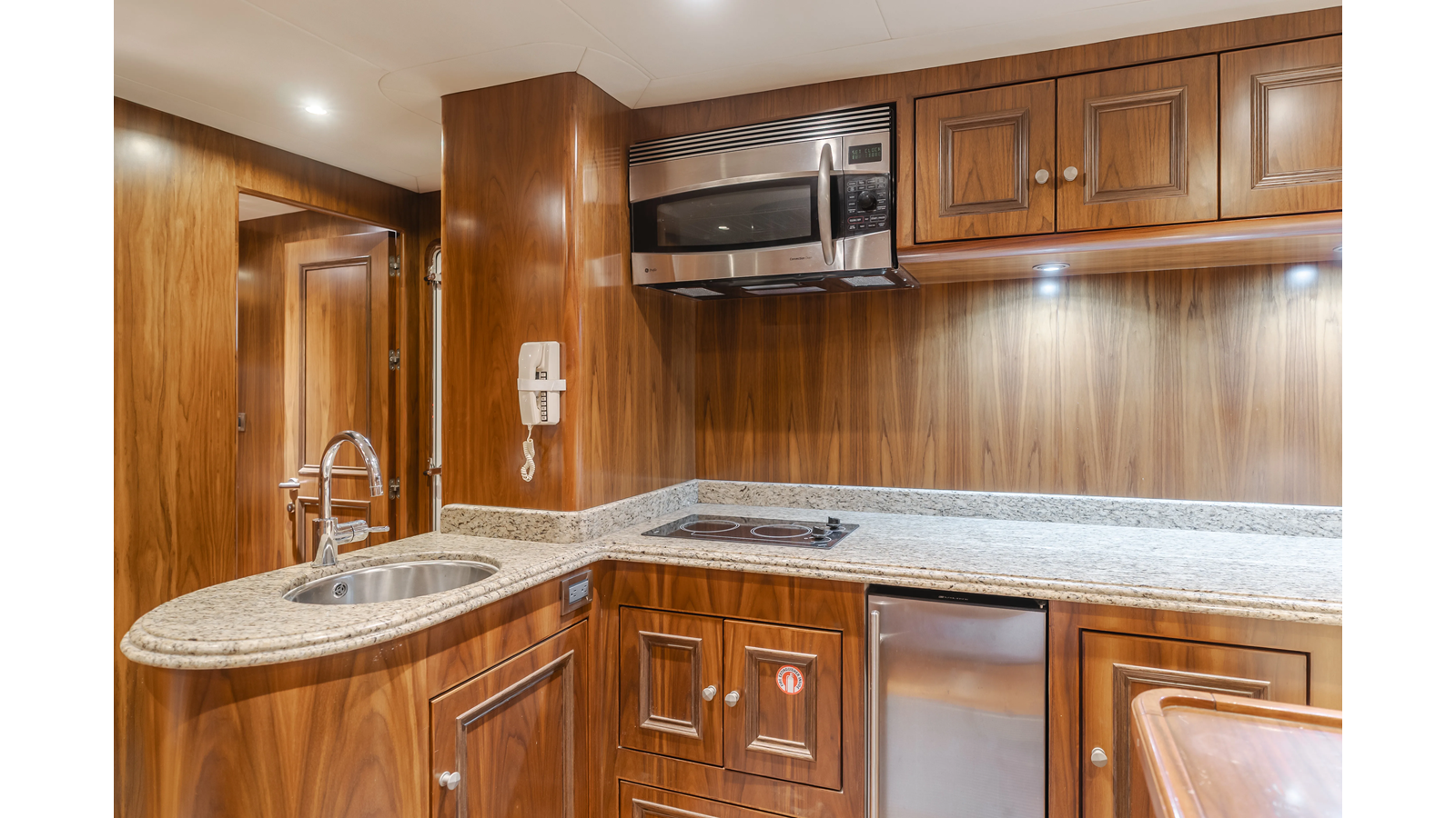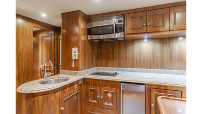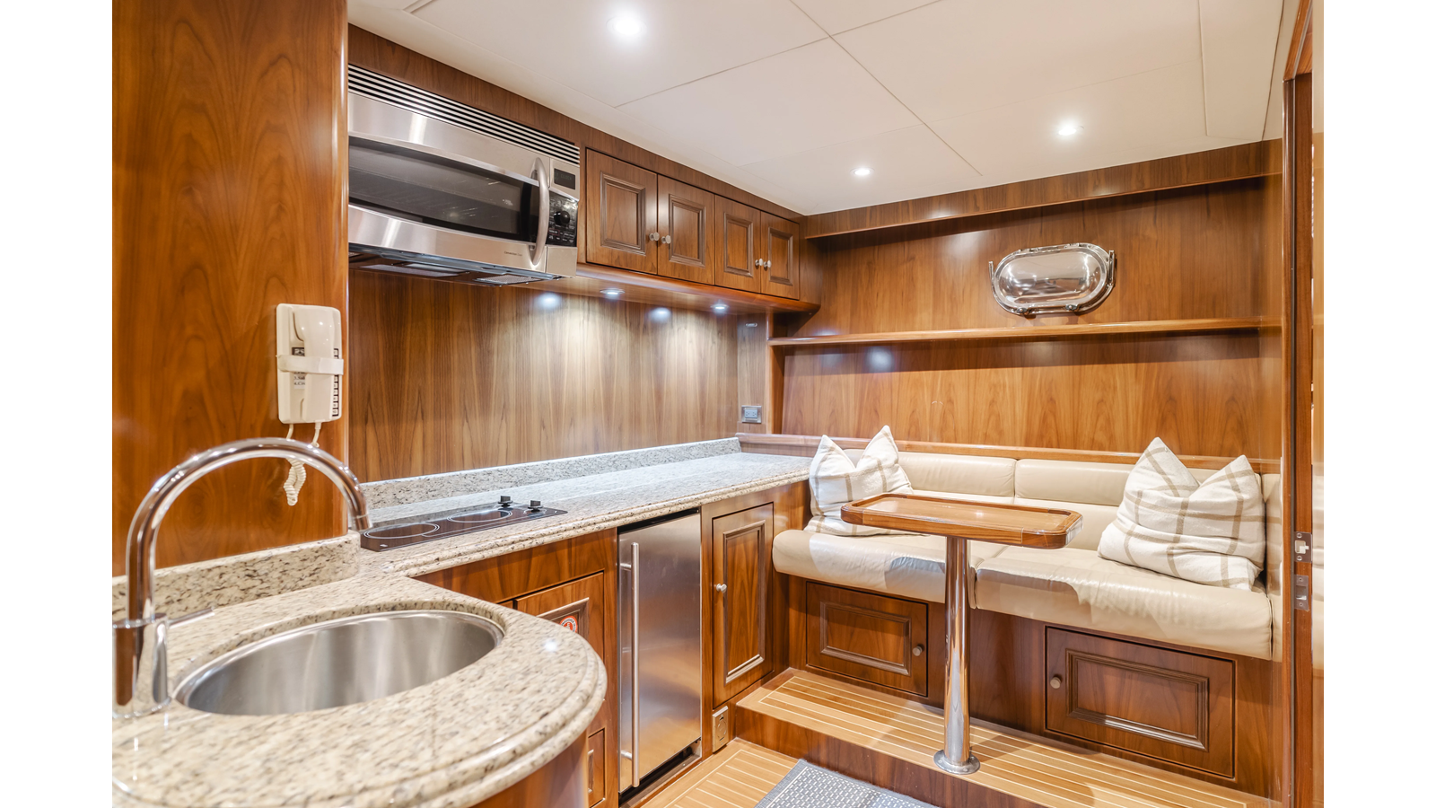 Teak veneer wall covering Teak floor S/S frame opening portlight (1) 120VAC receptacle (2) Granite counter top S/S sink with faucet Lockers Dinette seat w/cushion and a fixed teak table Pantograph access door to swim platform S/S frame watertight engine room access door Air conditioning, 8,000 BTU Refrigerator Cook top Microwave
