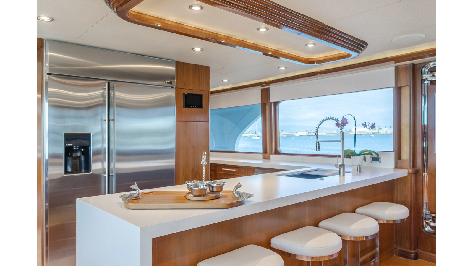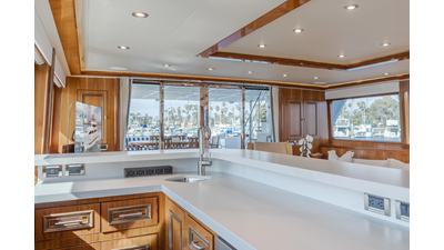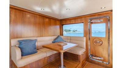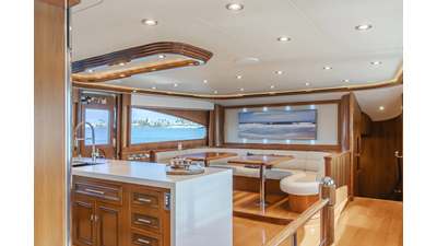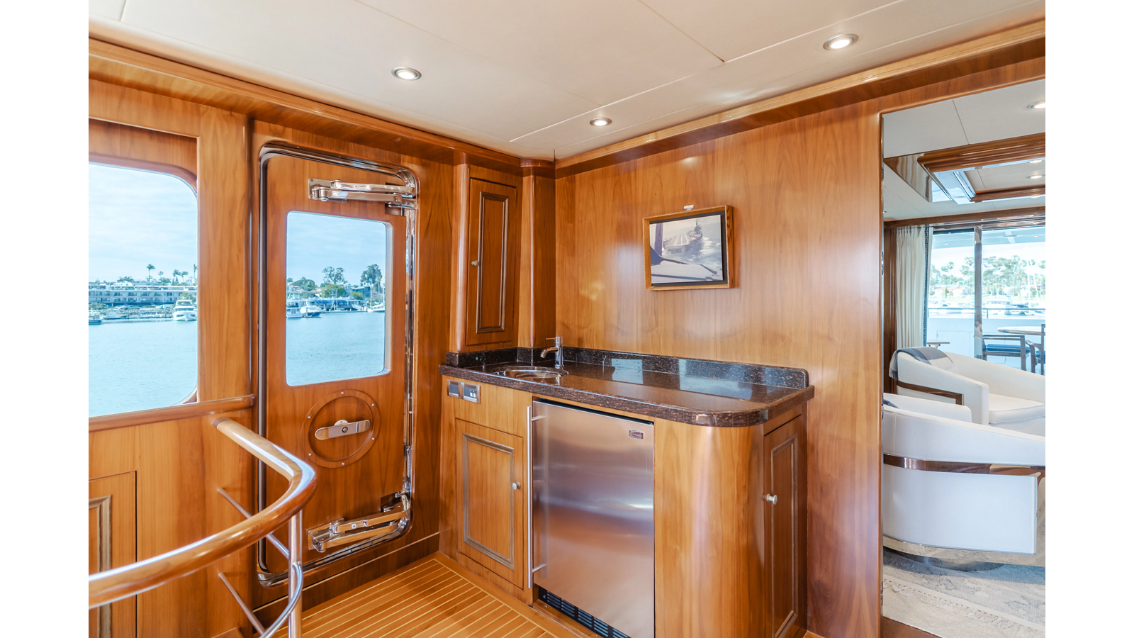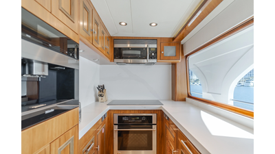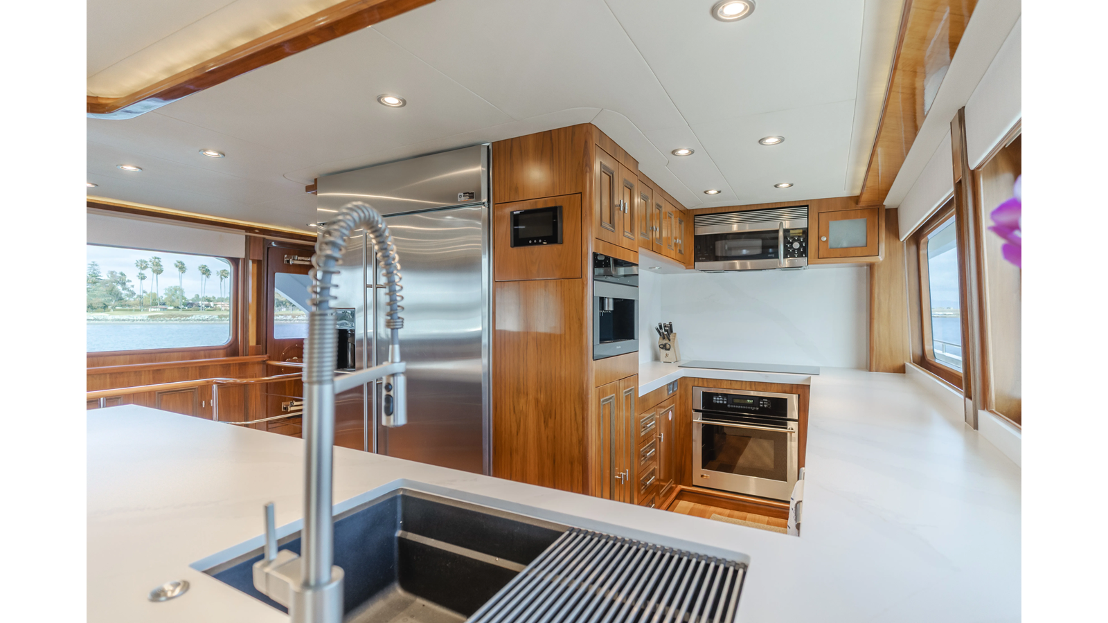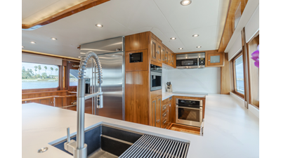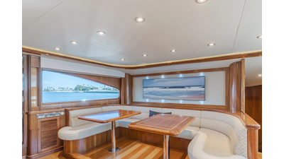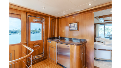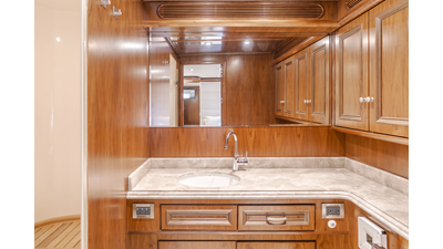 Teak veneer wall covering Teak floor S/S frame opening portlight (1) 120VAC receptacle (2) Granite counter top S/S sink with faucet Lockers Dinette seat w/cushion and a fixed teak table Pantograph access door to swim platform S/S frame watertight engine room access door Air conditioning, 8,000 BTU Refrigerator Cook top Microwave