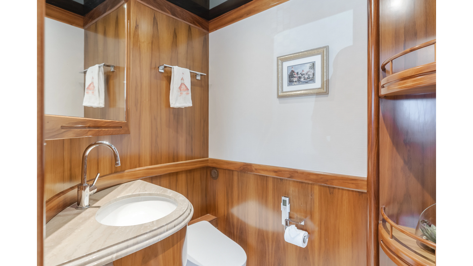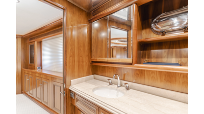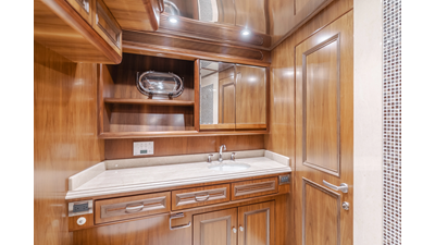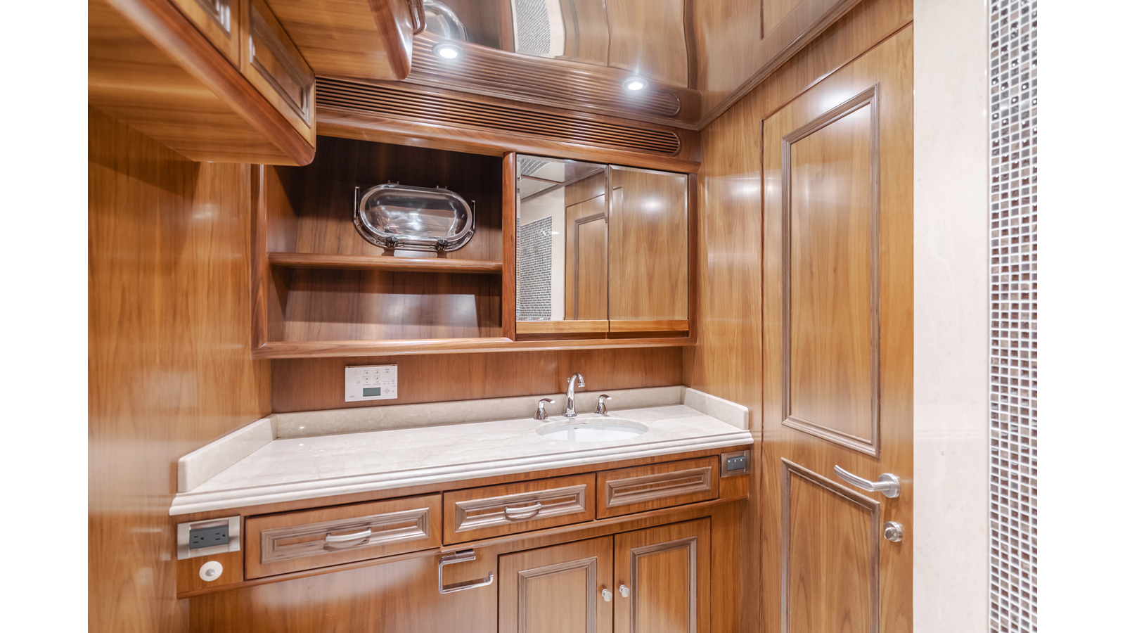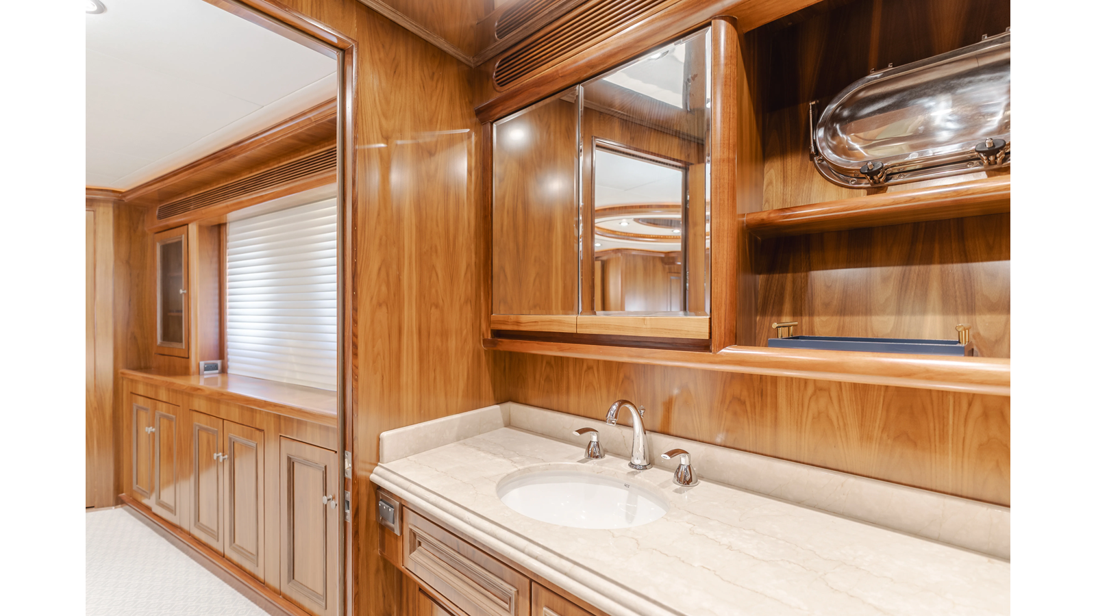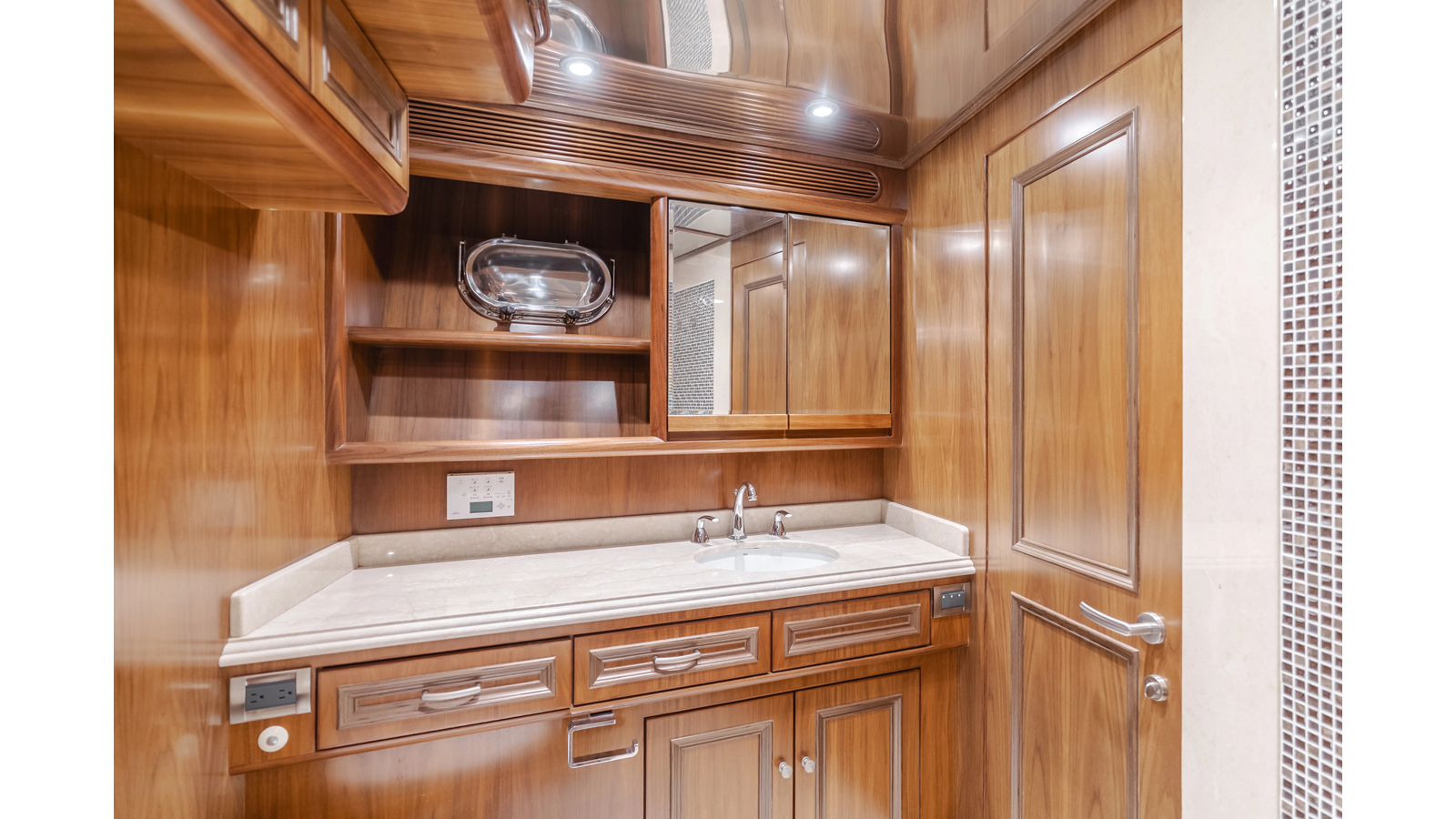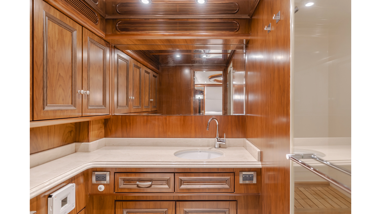 Medicine cabinet w/mirror (1) Headhunter®royal flush toilets Stall shower, fiberglass non-skid floor 24VDC or 120VAC lights 120VAC receptacle (1) Granite counter top Basin and faucet