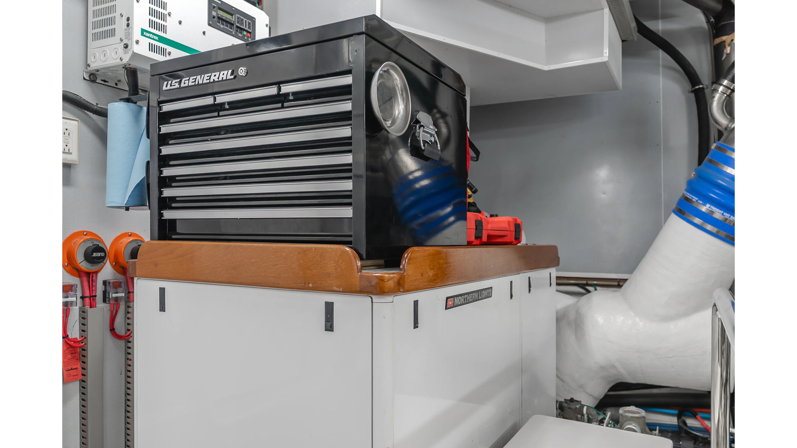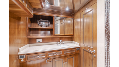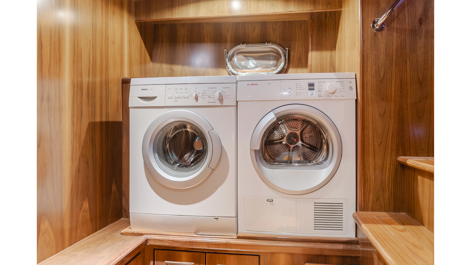 Teak stairs up to aft deck Teak floor Washer/dryer on port side Electric panel locker 120VAC receptacle (2) Lower counter locker