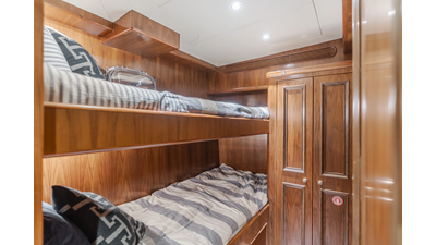 Upper and lower berths Hanging locker (1). Drawer storage under lower berth Private door to head S/S frame opening portlight (1) 24VDC or 120VAC lights 120VAC outlet (1) Air conditioning, 8,000 BTU