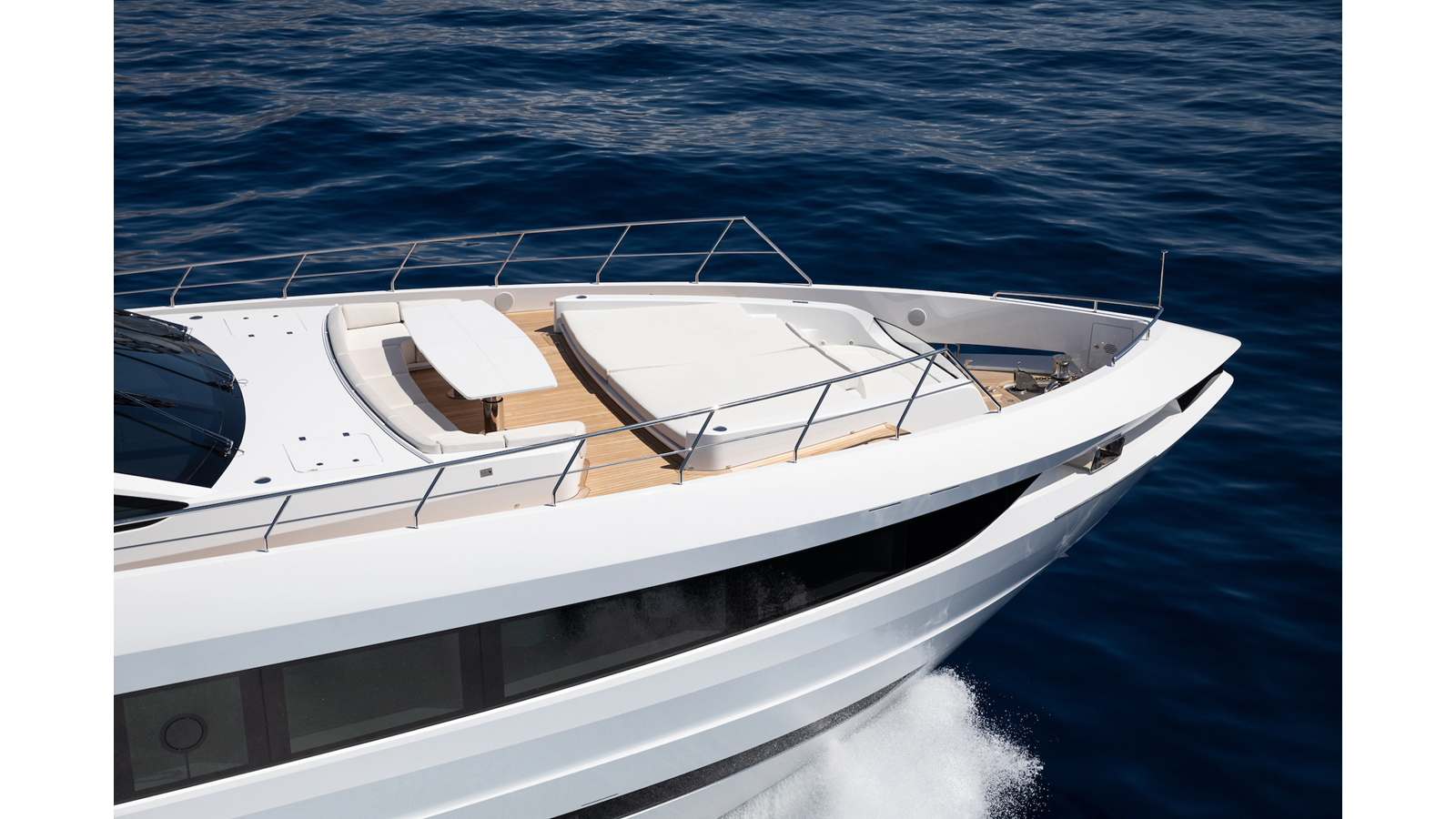The final areas to discuss is the sundeck which flows forward to the bow area connected from the port side door combining both spaces into one. The sundeck has a large hardtop with glass skylights, formal dining area, bar, upper helm station and lounge area located back aft covered with a sunshade. The bow area also has sunshades and a large bunny pad, sitting area with table and one of my favorite features onboard is the jacuzzi. When not in use sunpads cover the space leaving a fantastic area to enjoy when blasting around at 26 knots. Love this upper deck - if entertaining a large party you can use the area as if onboard a 50m so it is very well thought out.