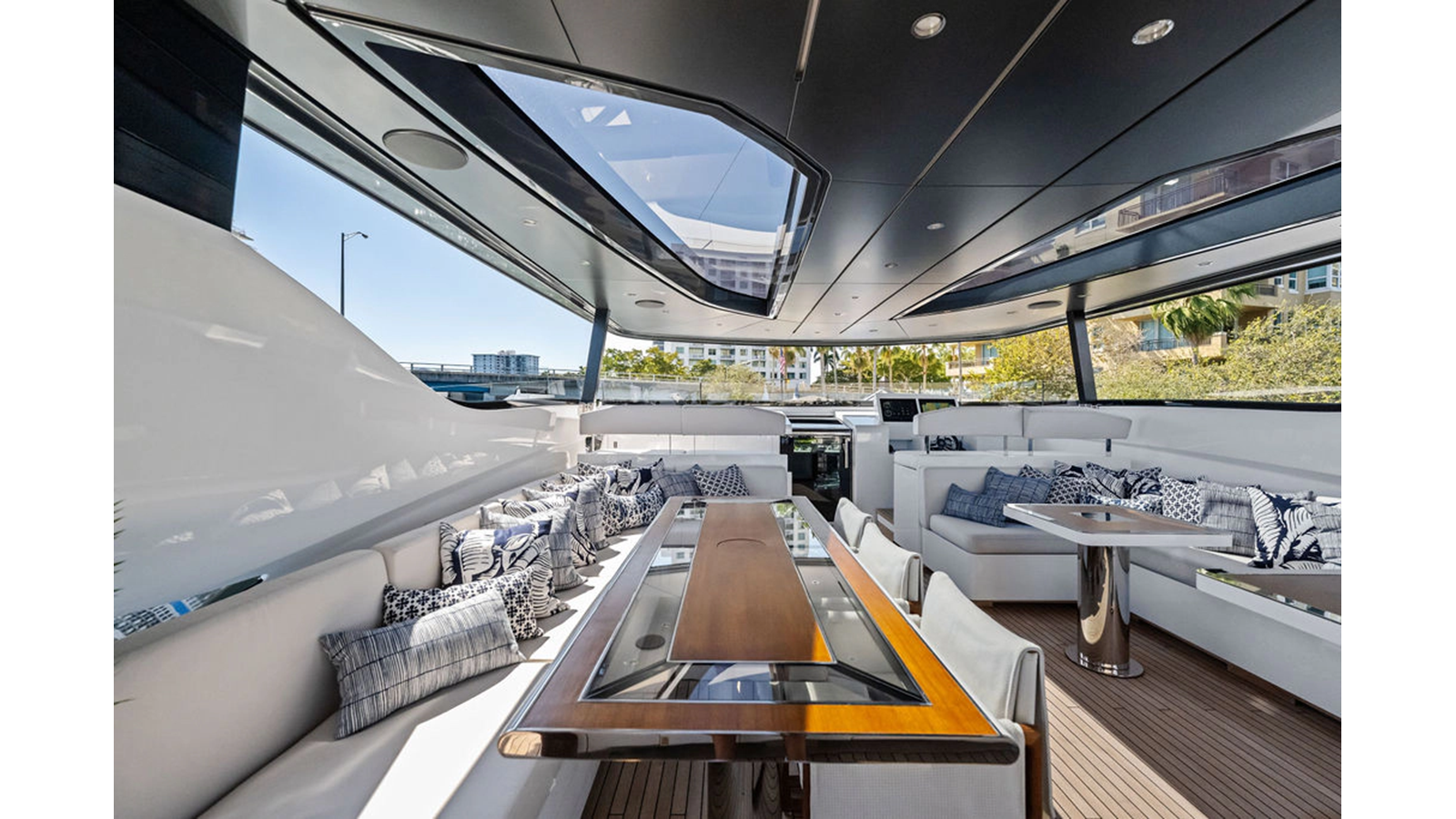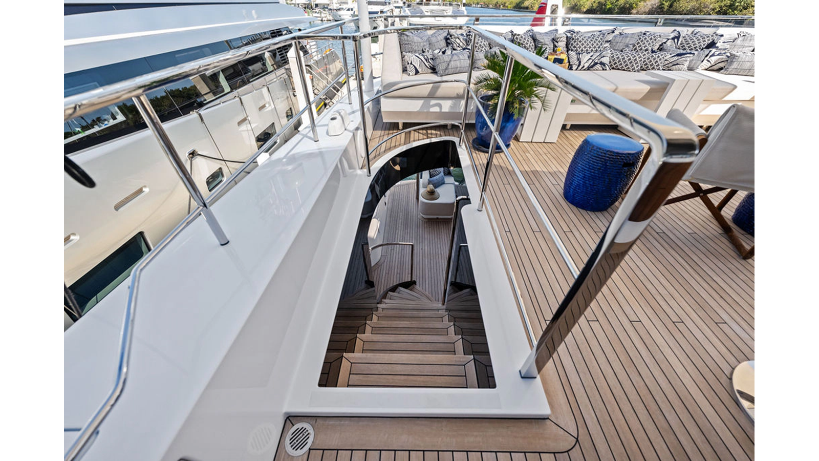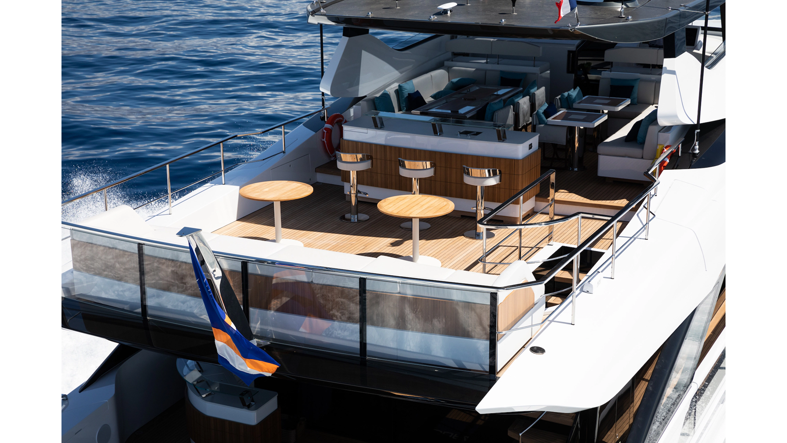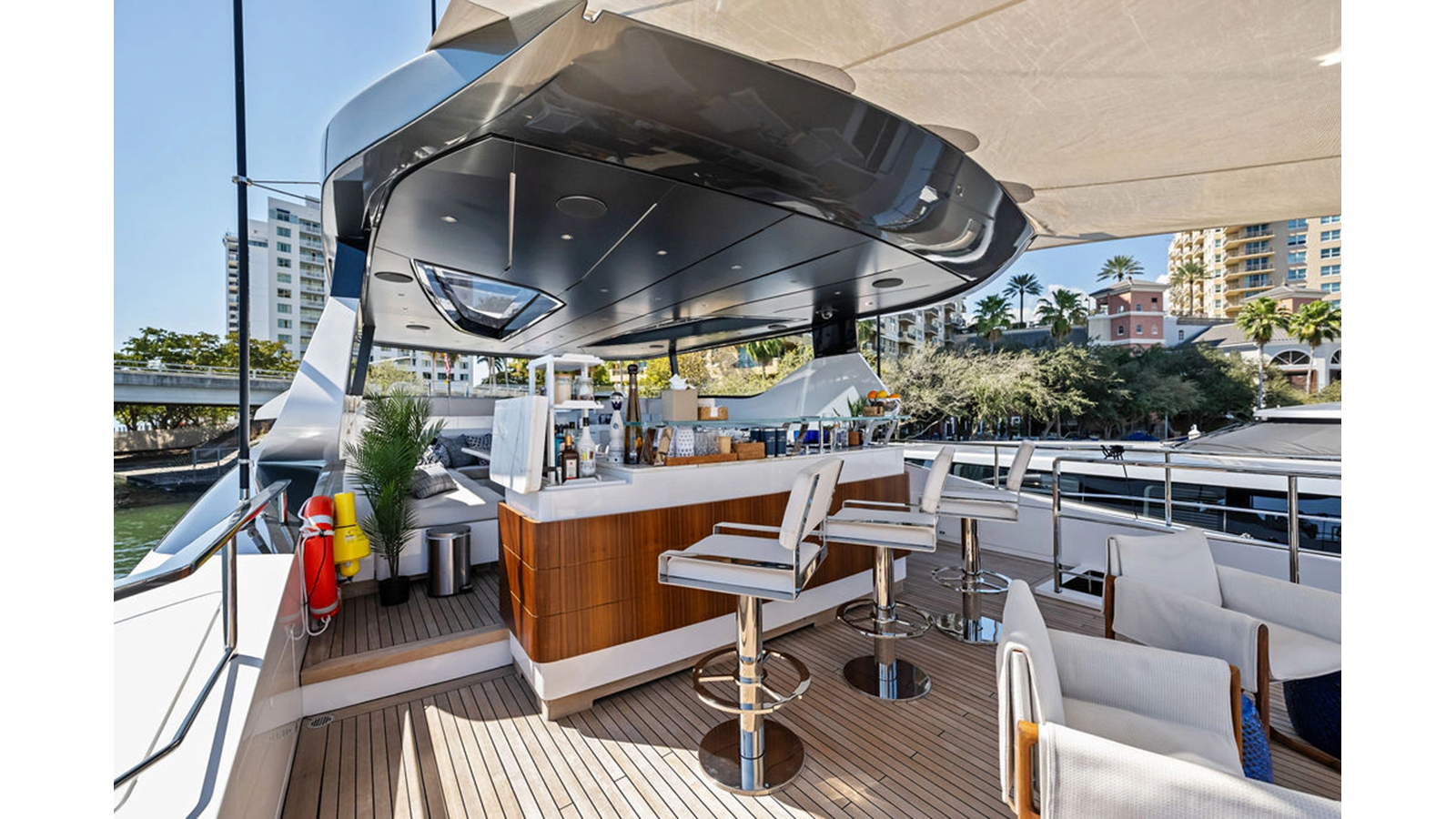 Walking up the passarelle you arrive at the aft deck which has a centerline U-shaped settee, table and chairs great for dining or lounging. Forward to port is a full service bar, to starboard stairs that lead up the sundeck. Both to port and starboard you have full walk arounds great for the crew when docking or maneuvering the vessel.