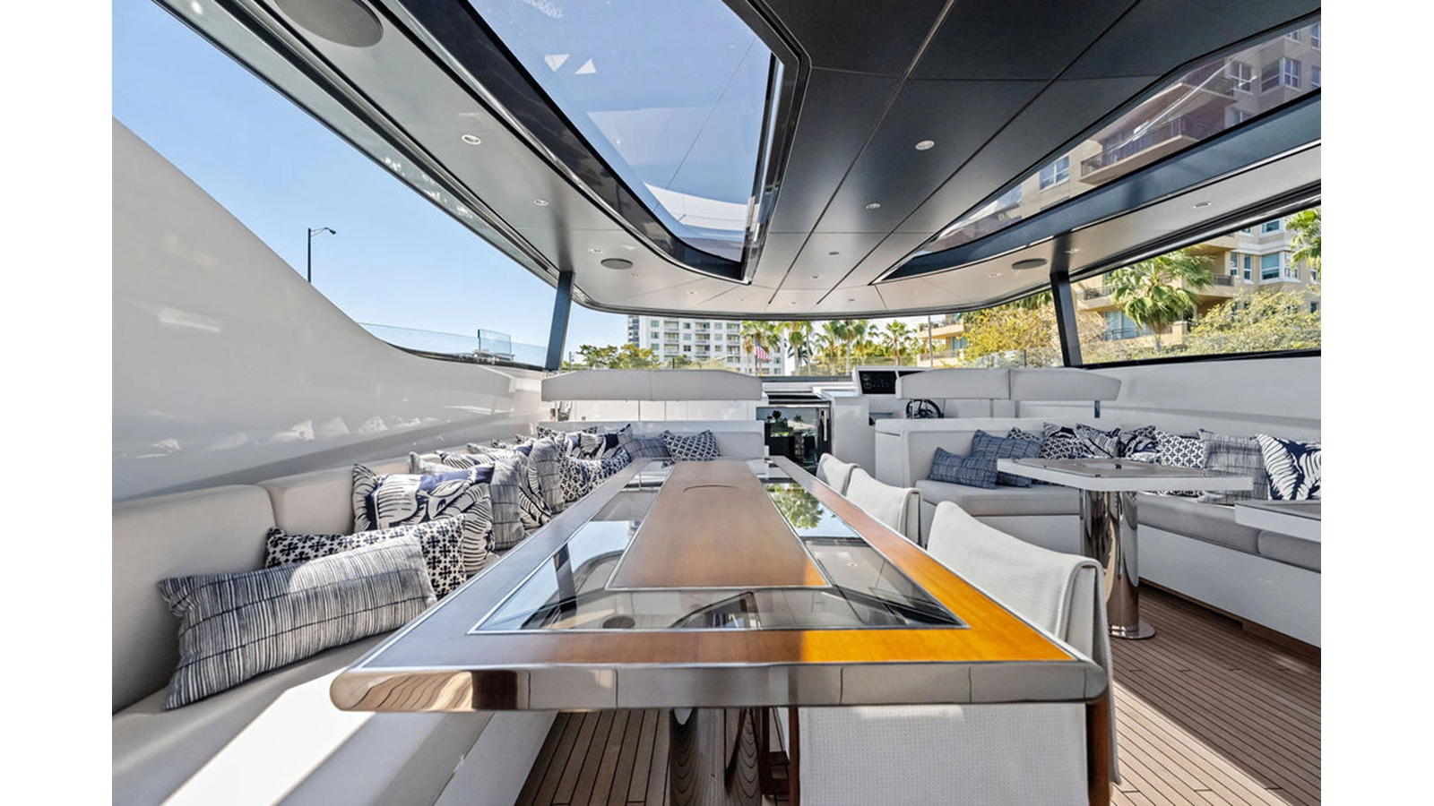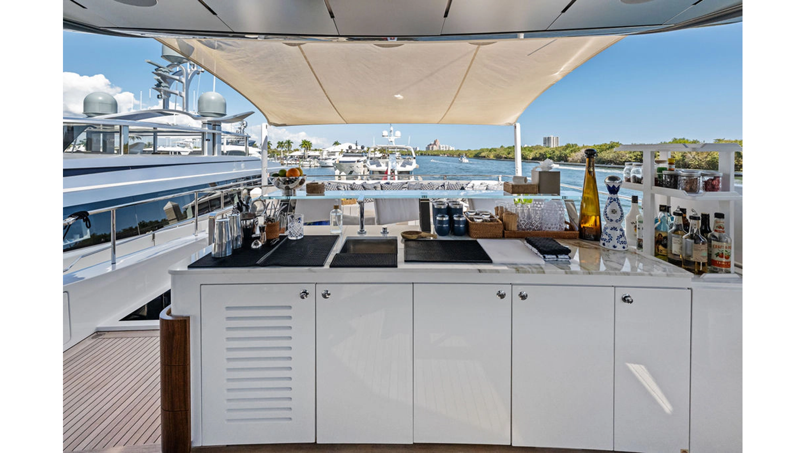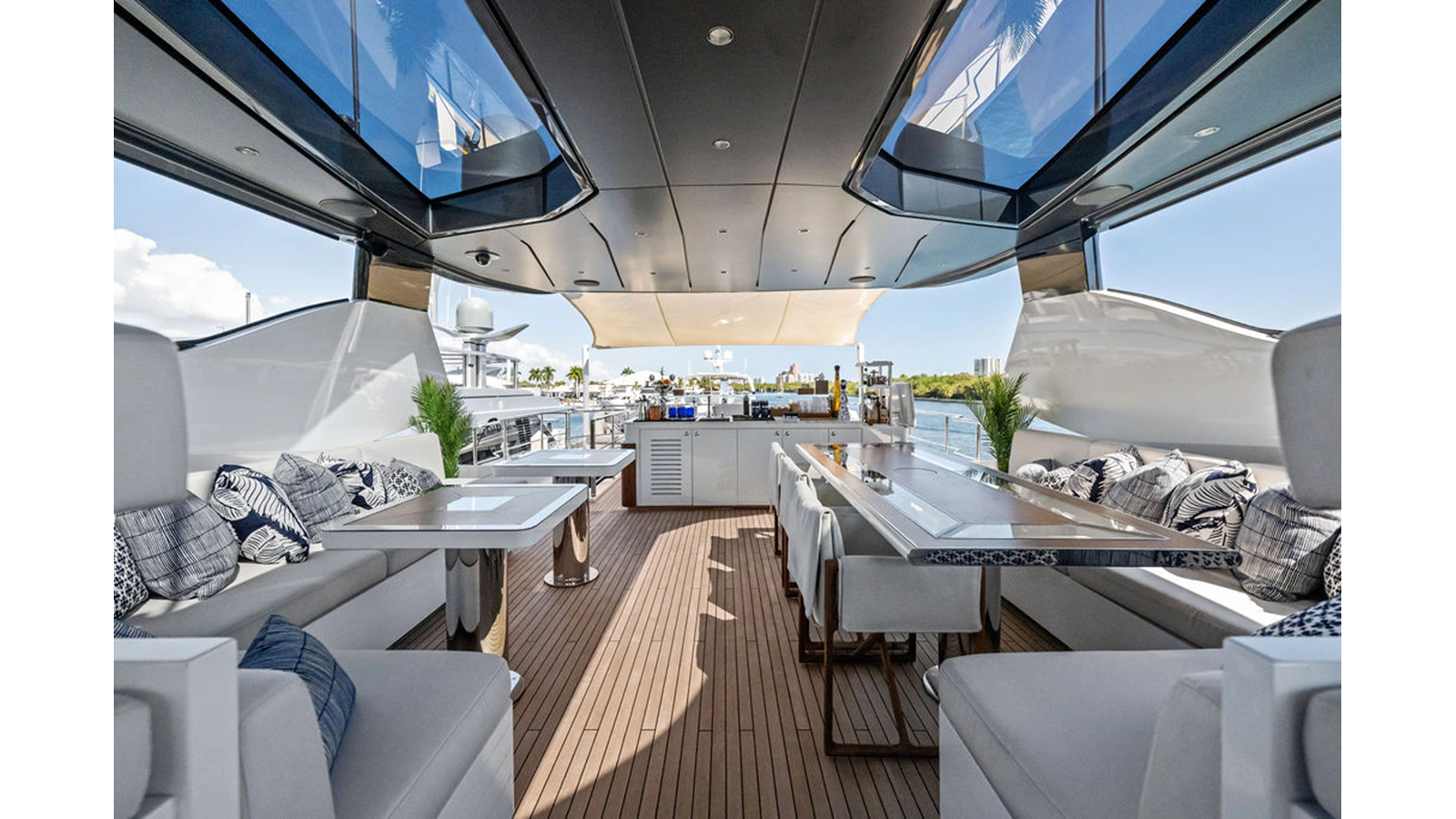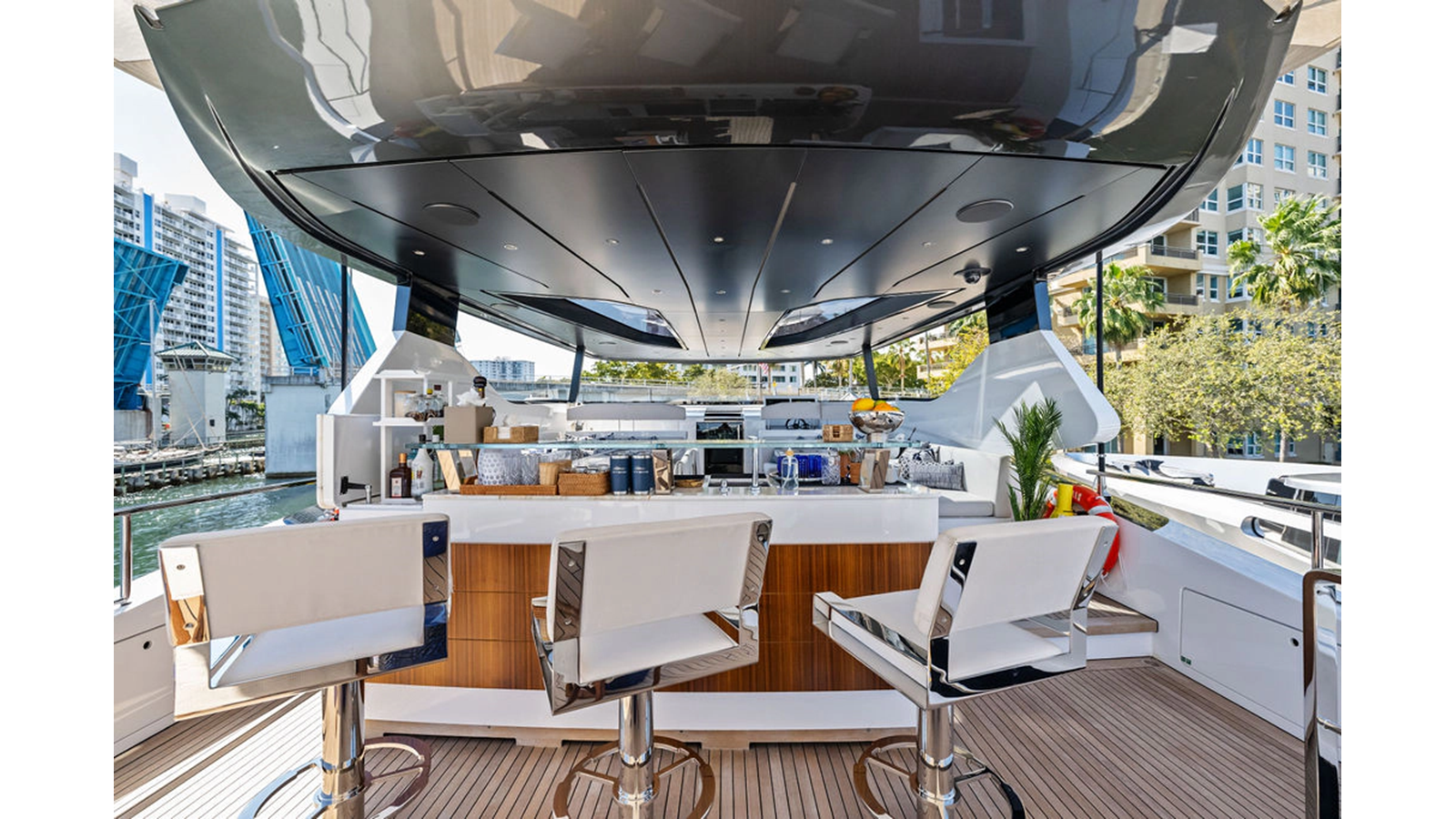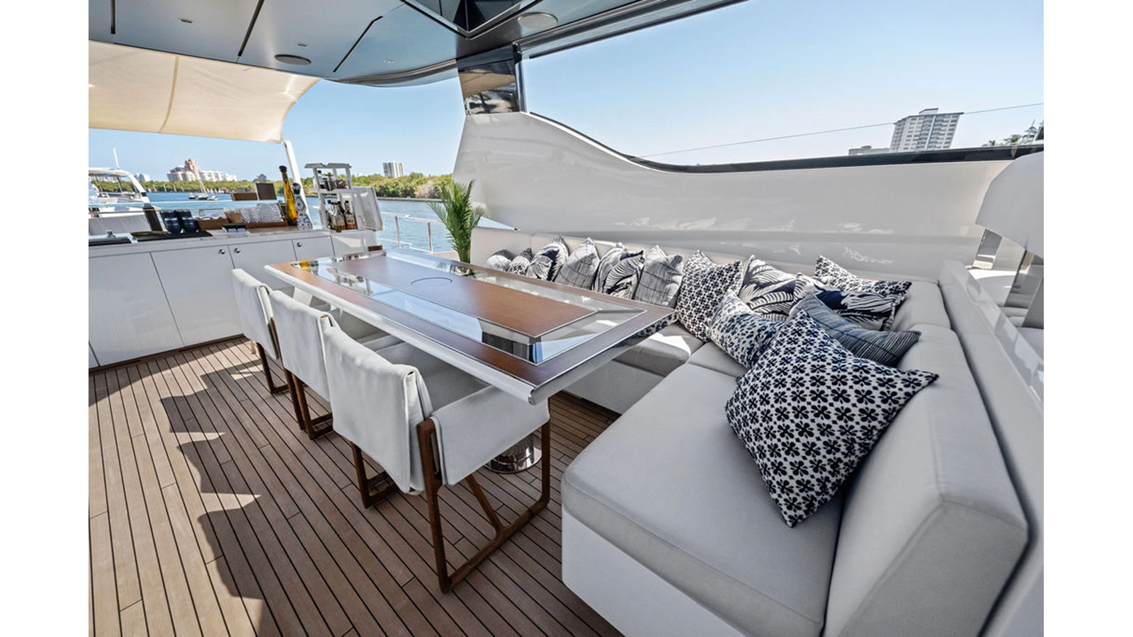 Walking up the passarelle you arrive at the aft deck which has a centerline U-shaped settee, table and chairs great for dining or lounging. Forward to port is a full service bar, to starboard stairs that lead up the sundeck. Both to port and starboard you have full walk arounds great for the crew when docking or maneuvering the vessel.