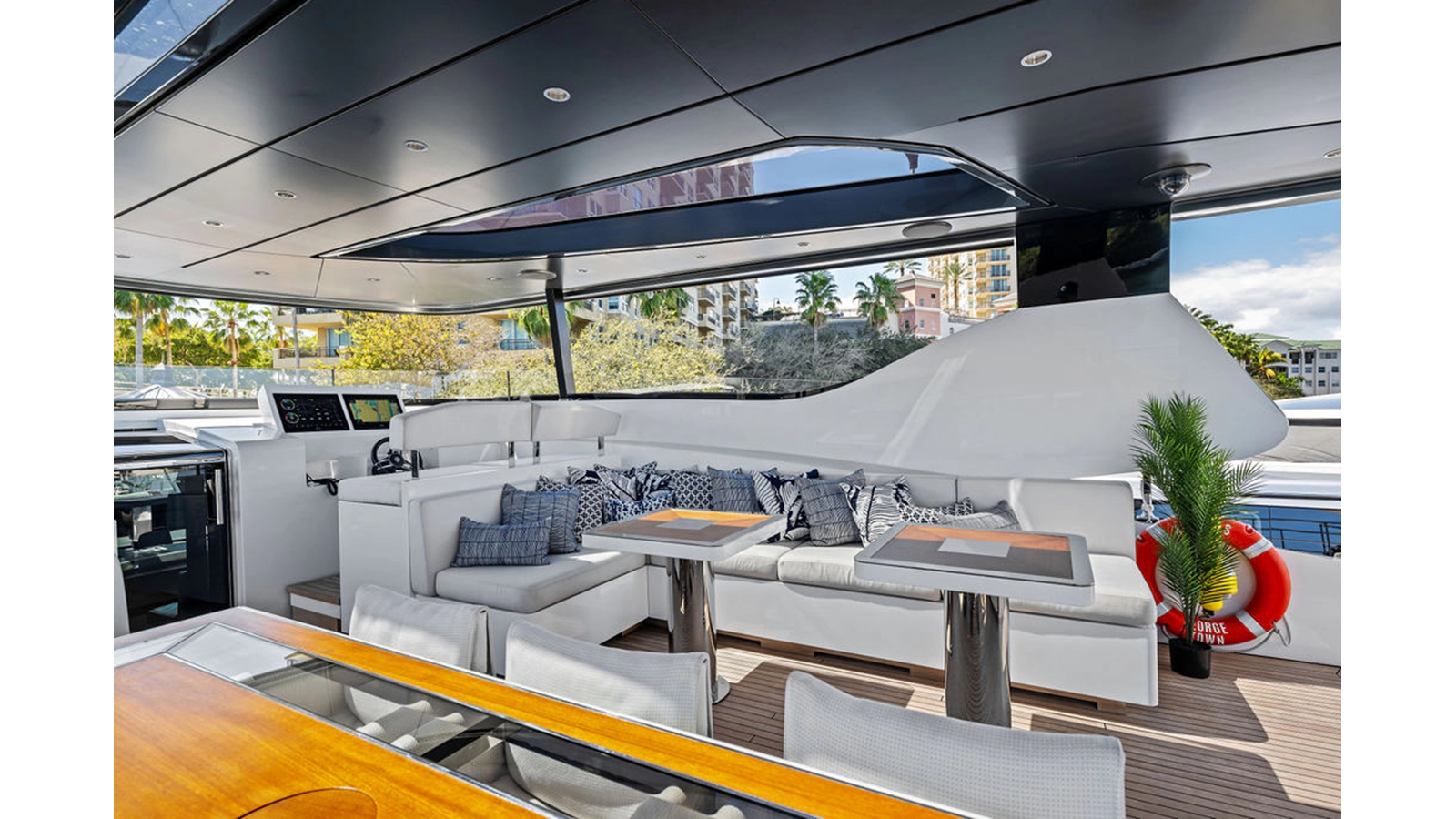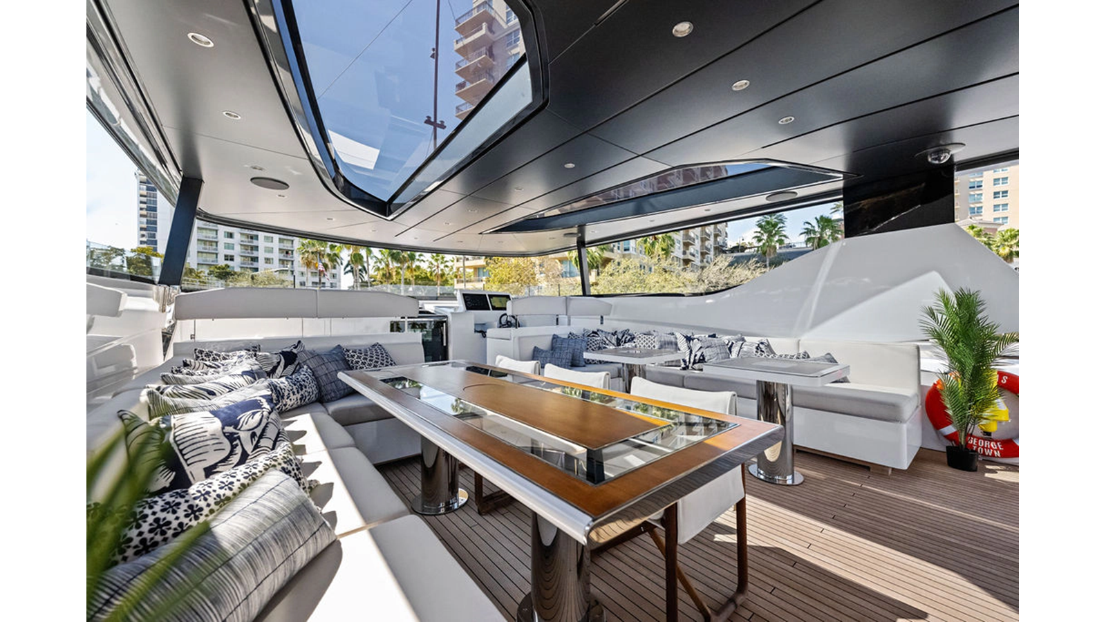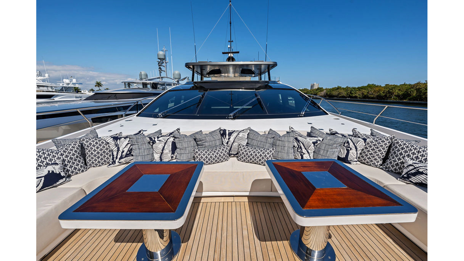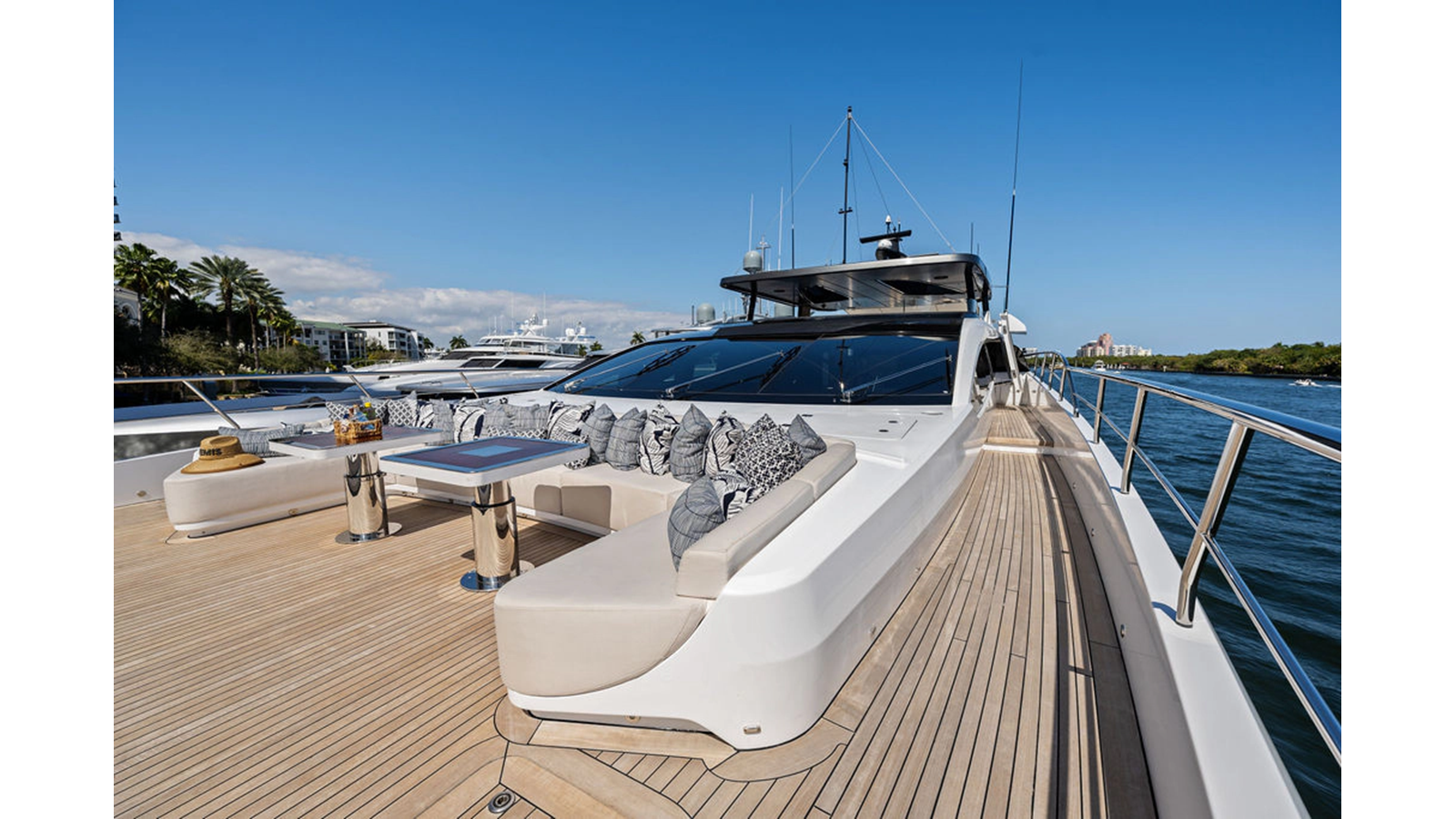 Walking up the passarelle you arrive at the aft deck which has a centerline U-shaped settee, table and chairs great for dining or lounging. Forward to port is a full service bar, to starboard stairs that lead up the sundeck. Both to port and starboard you have full walk arounds great for the crew when docking or maneuvering the vessel.