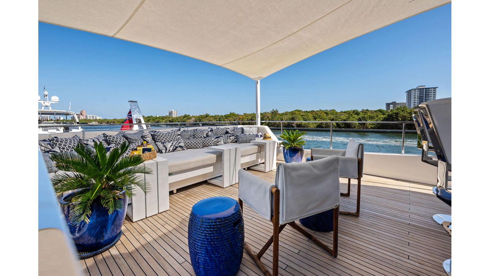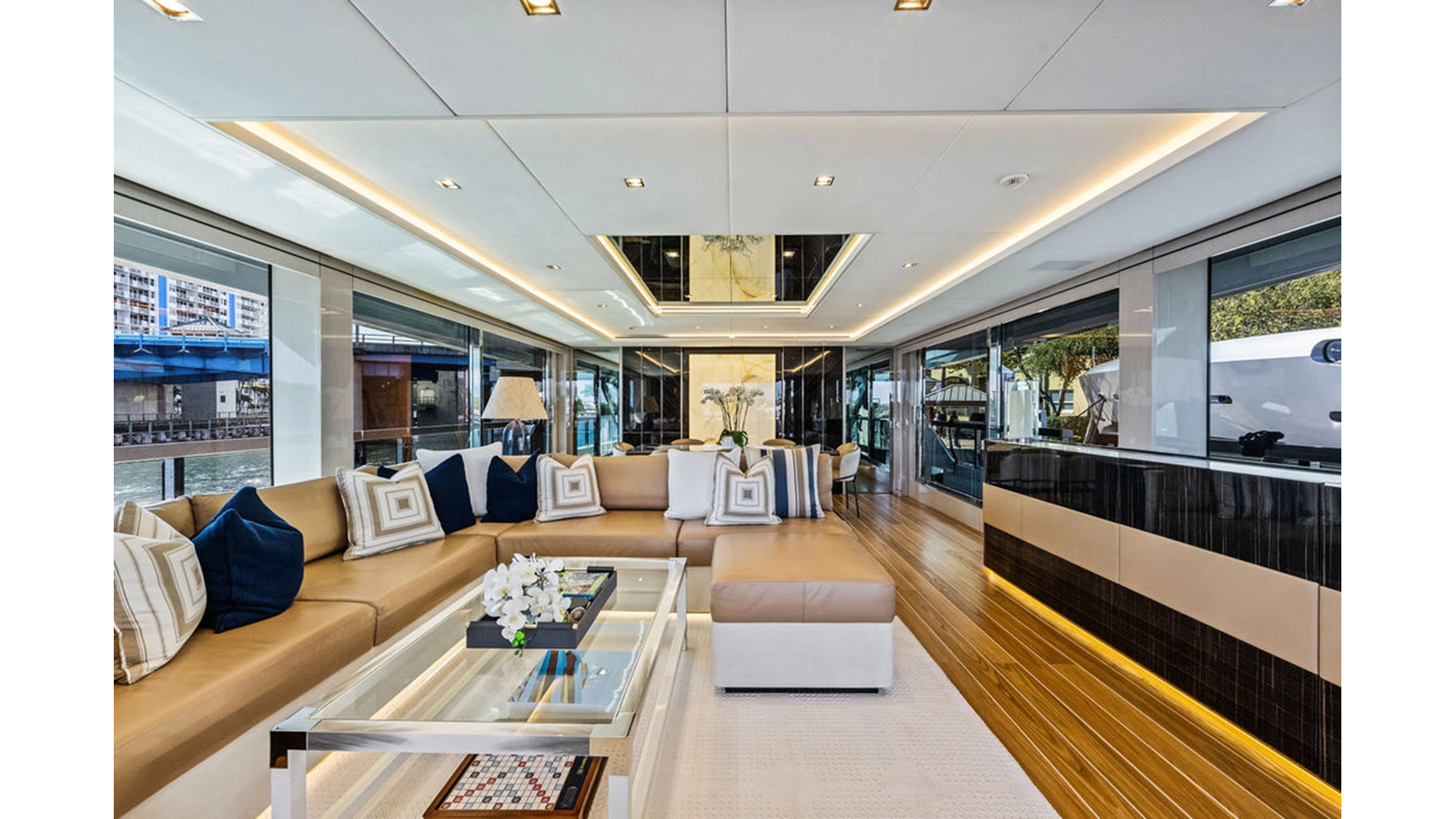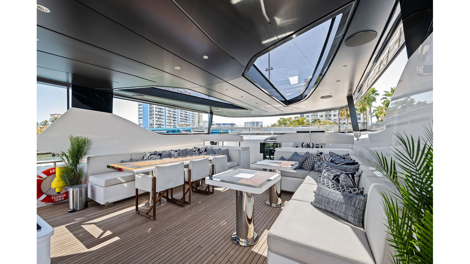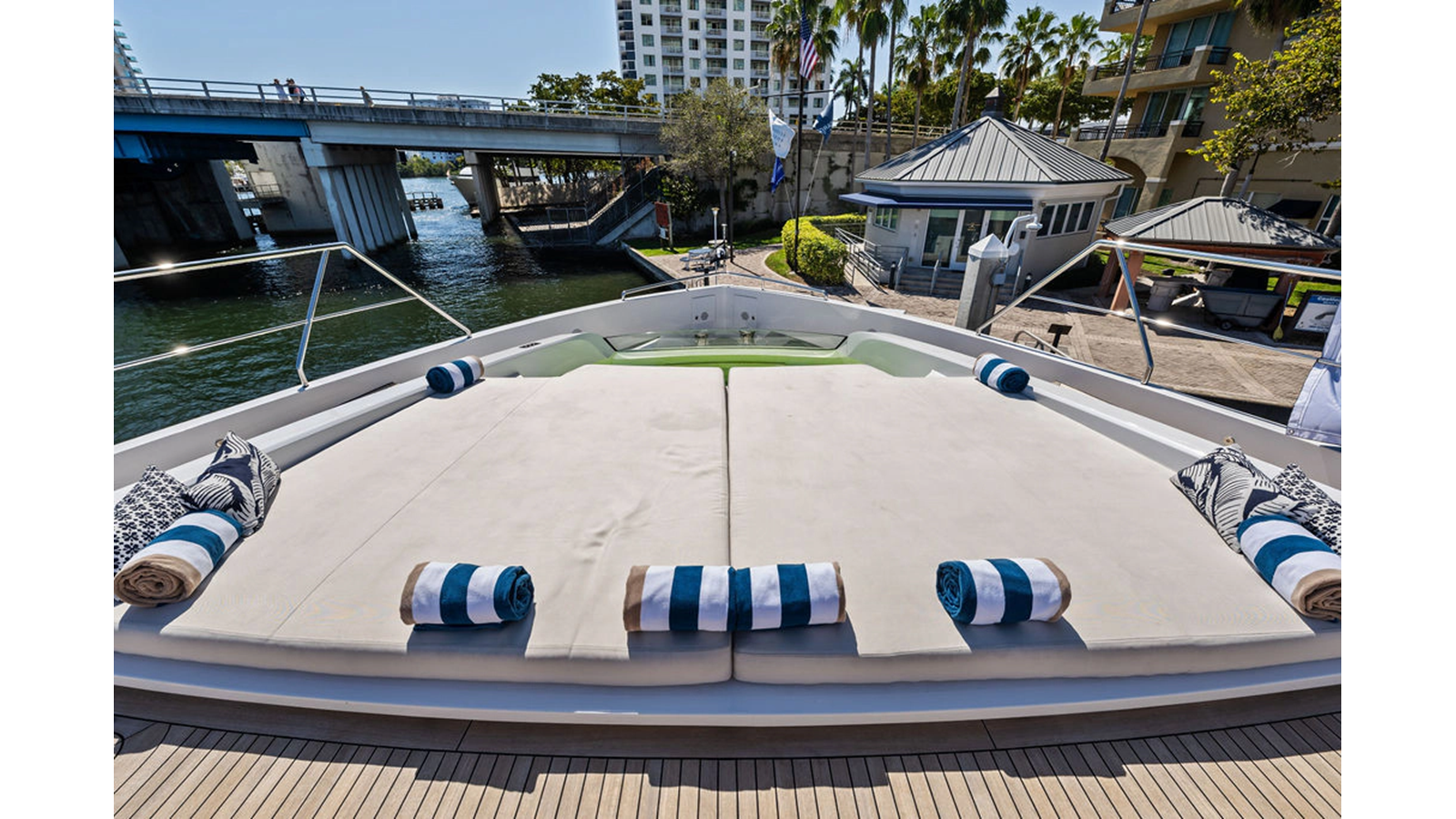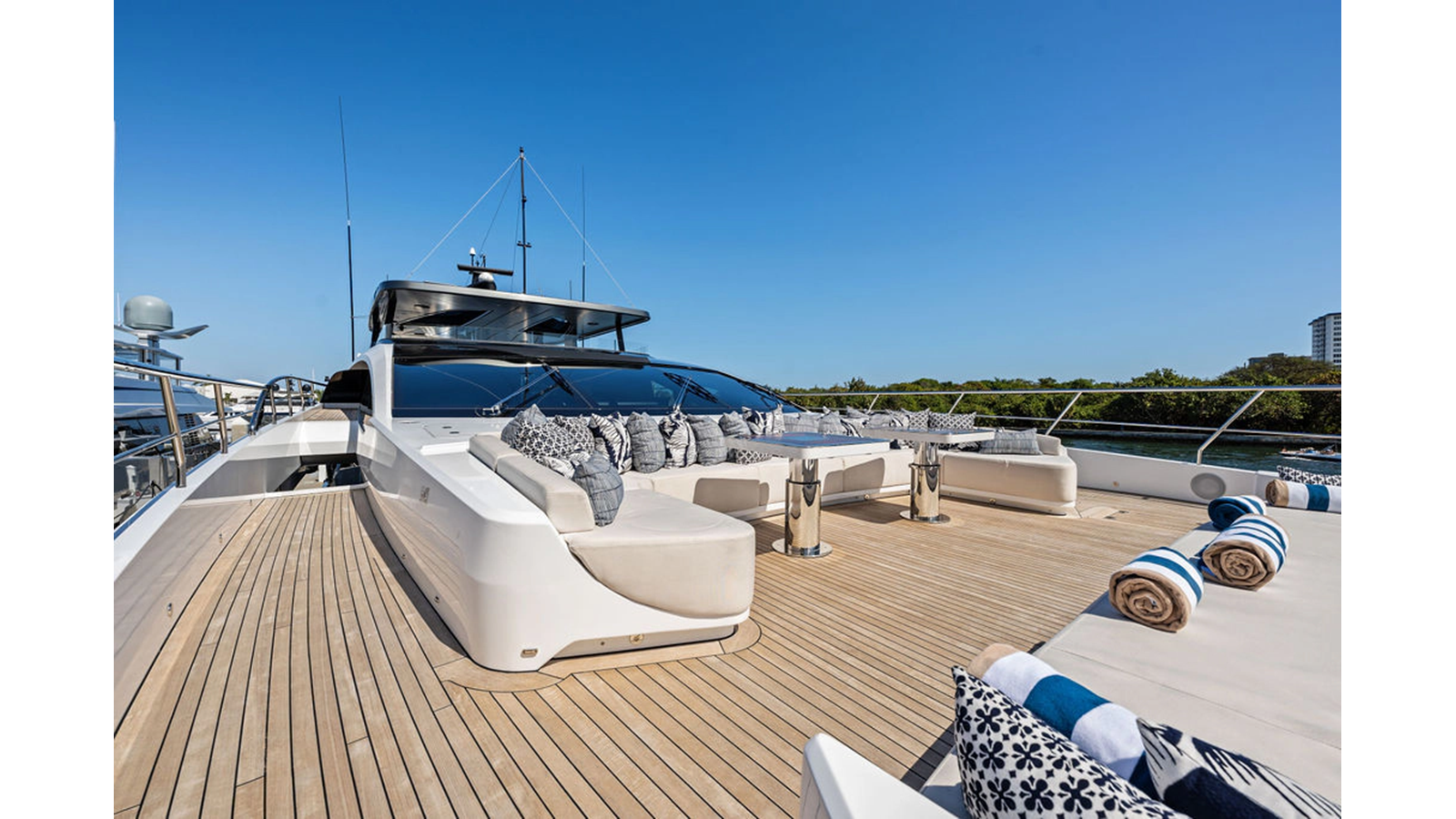 Walking up the passarelle you arrive at the aft deck which has a centerline U-shaped settee, table and chairs great for dining or lounging. Forward to port is a full service bar, to starboard stairs that lead up the sundeck. Both to port and starboard you have full walk arounds great for the crew when docking or maneuvering the vessel.
