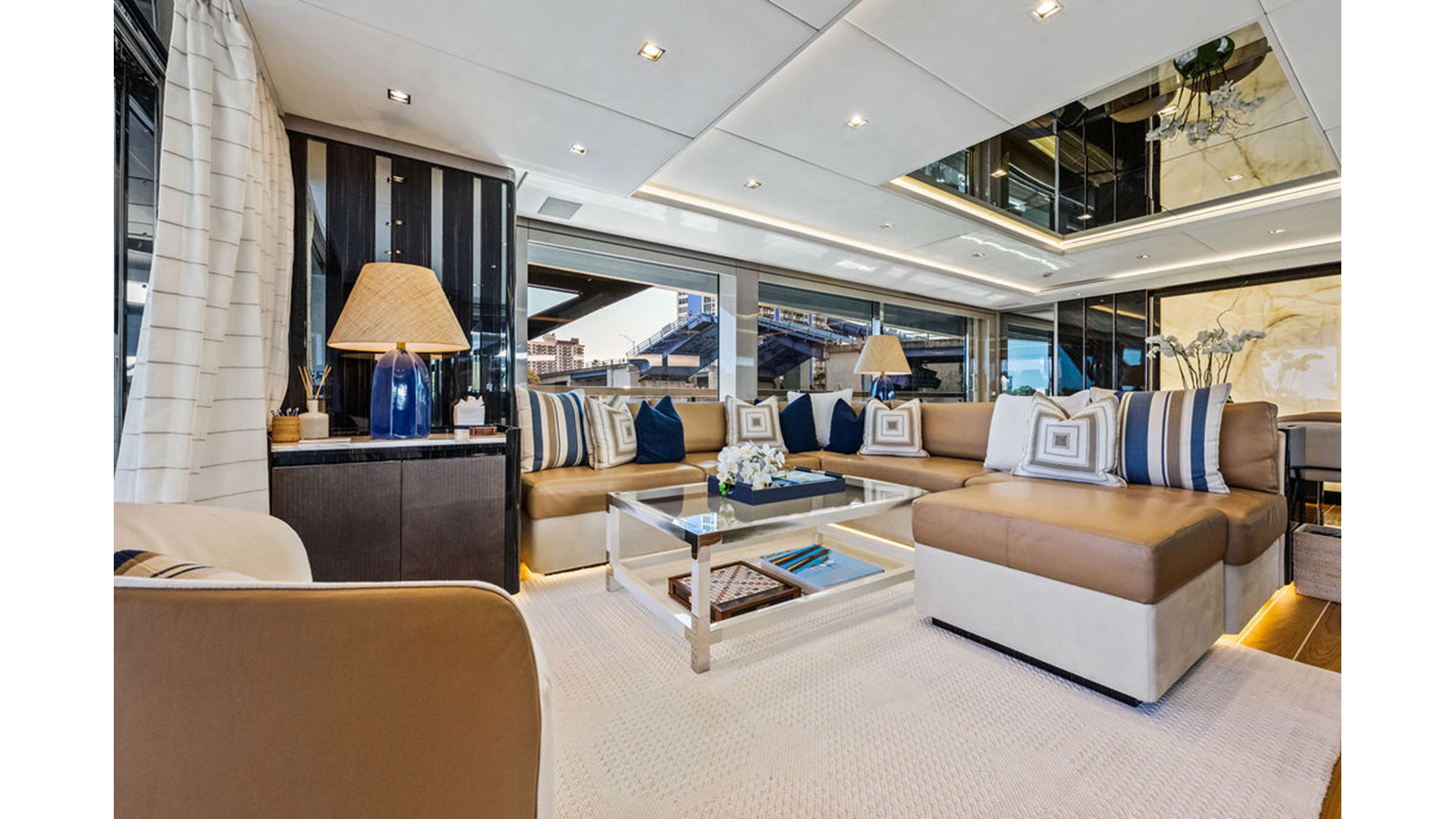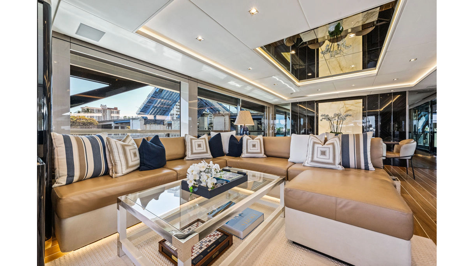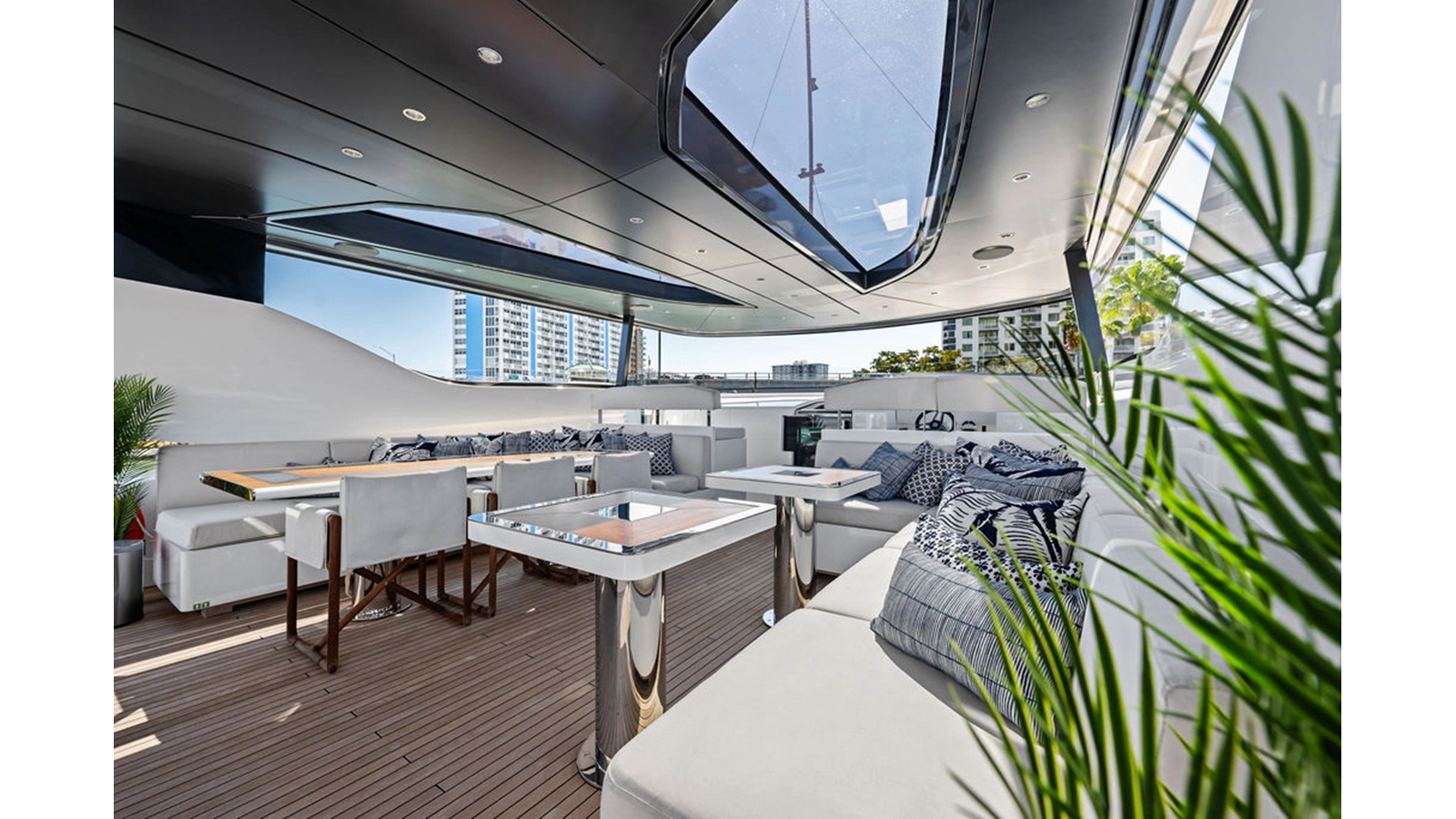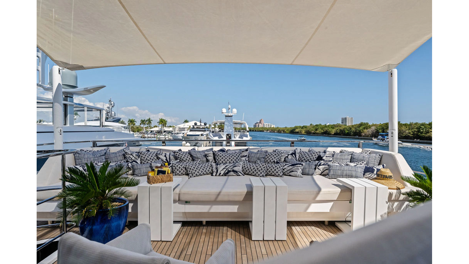 Walking up the passarelle you arrive at the aft deck which has a centerline U-shaped settee, table and chairs great for dining or lounging. Forward to port is a full service bar, to starboard stairs that lead up the sundeck. Both to port and starboard you have full walk arounds great for the crew when docking or maneuvering the vessel.