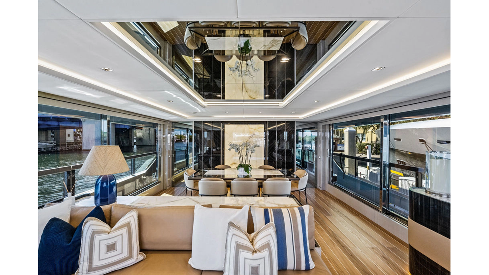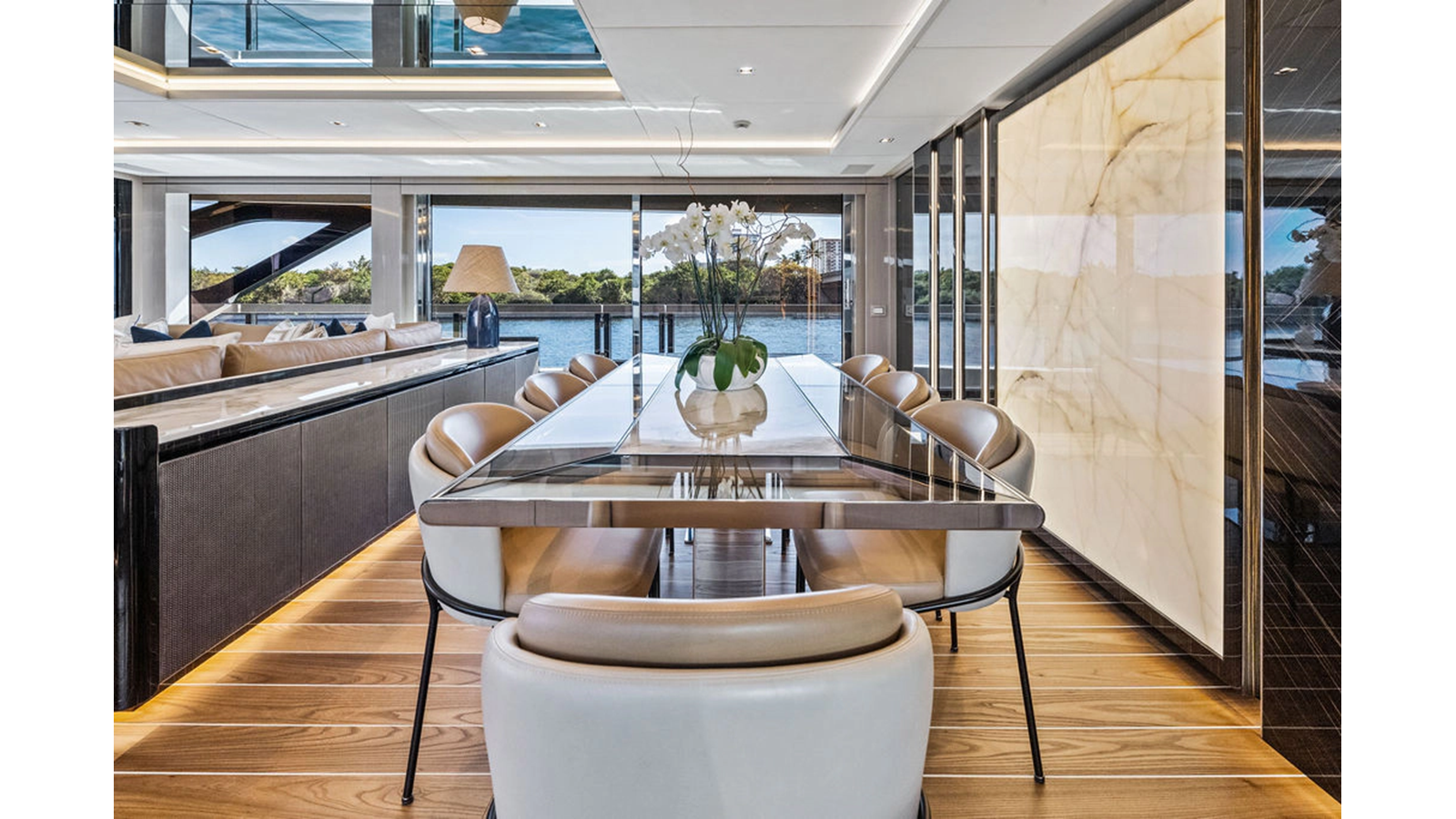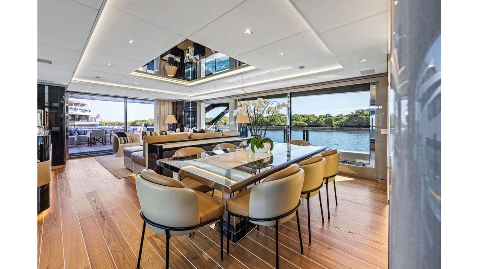 Stepping into the main salon you immediately notice the 7' headroom (found on both the main and lower decks). The sliding doors have very little threshold so easy to step over. Custom hardwood floors highlight the space which is separate into an aft lounge area with L-shaped settee and forward of that the formal dining which is complemented by sliding doors both to port & starboard so when opened create a refreshing cross breeze while dining (or leave them open when at anchor to enjoy the fresh air).