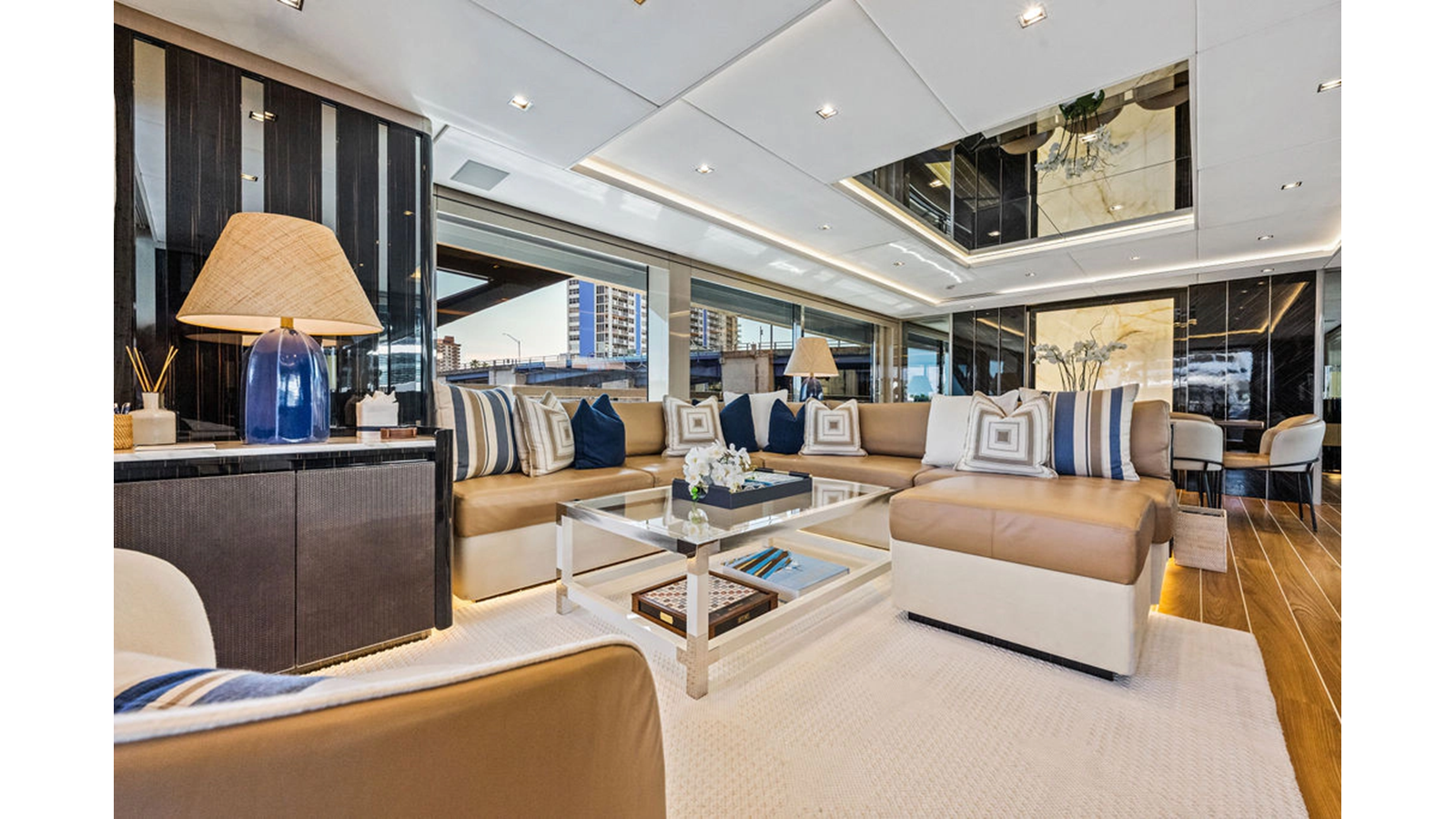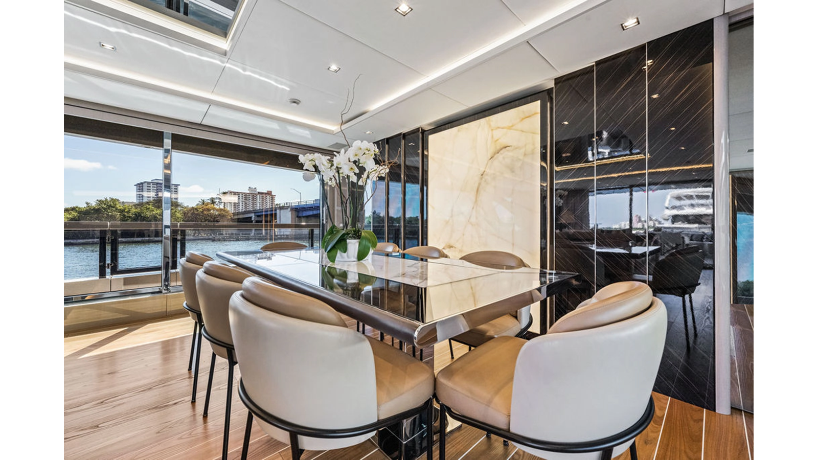 As stated above the engines have right around 950 hours (as of March 2026) with warranty still in place. Generator hours are right at 7,700 with all services current. The upgraded decor is absolutely noticeable when compared to other 33 Gran Sports - from the hard wood floors, the marble & onyx stone that was specifically chosen by the client, the leathers, suede wall coverings - it is all intricately laid together with soft blues and earth tones giving a warm & inviting feel.