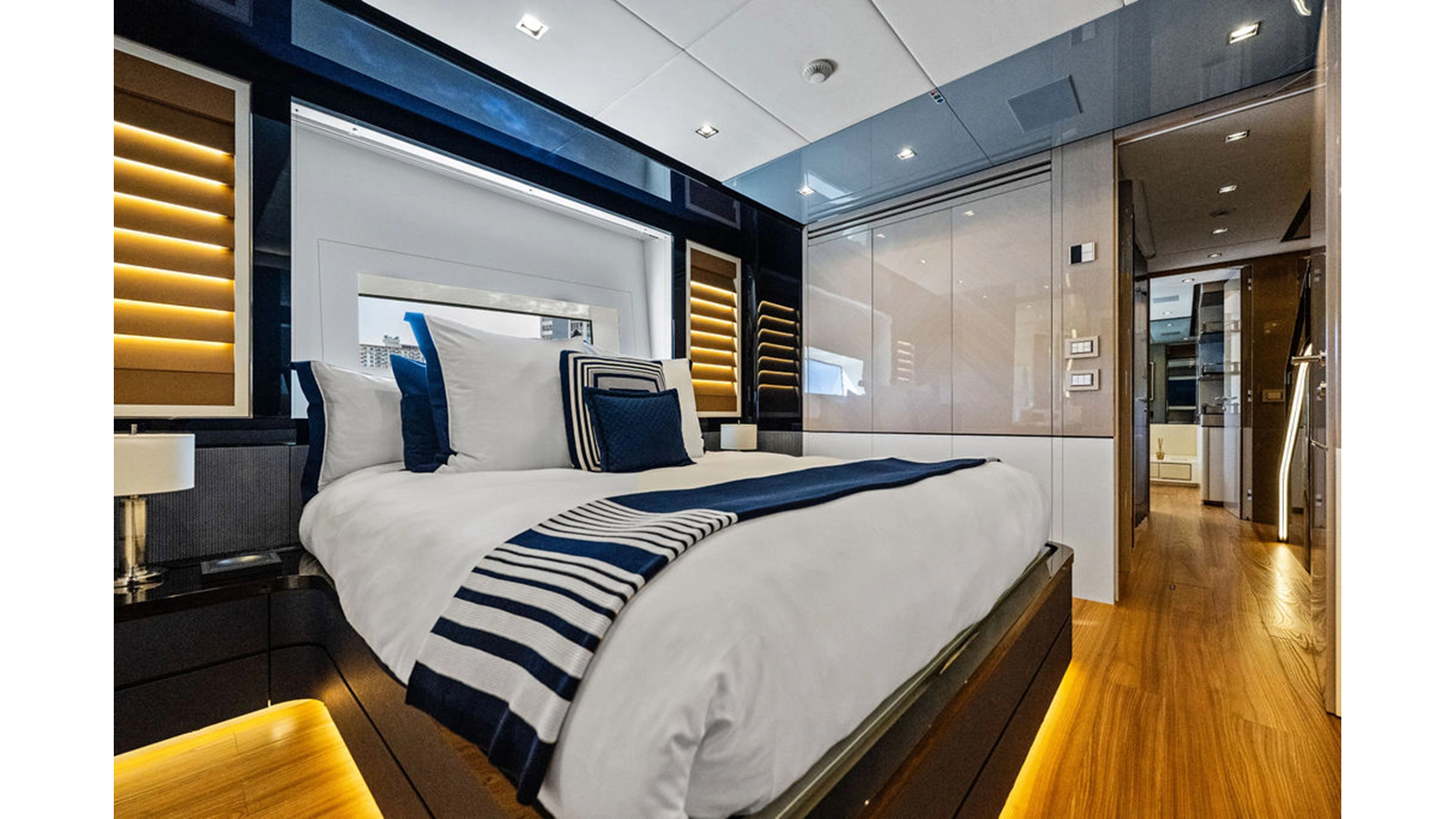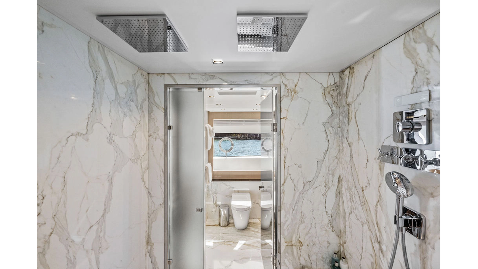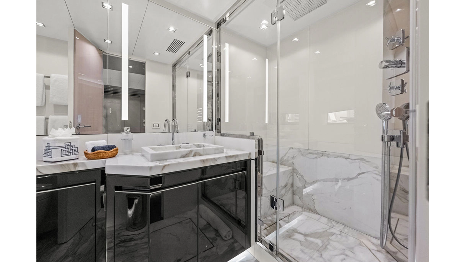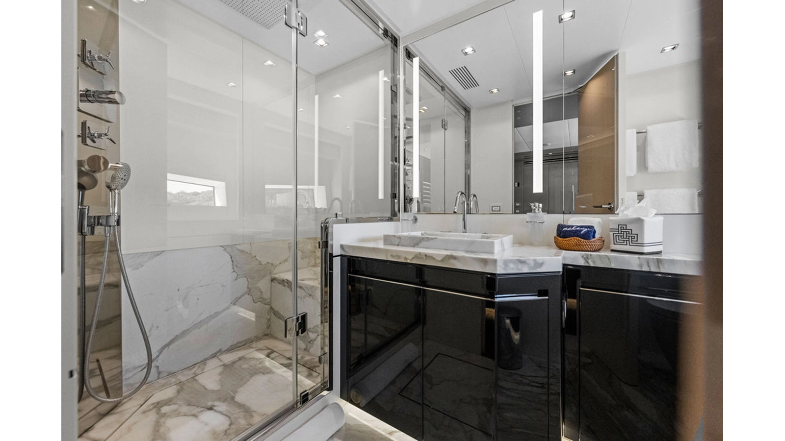Moving forward on the main deck to starboard you pass the day-head and end at an extremely spacious full beam master cabin complete with massive windows, large wardrobe, shower that was enlarged to fit 2 people and incorporates a steam shower feature, and his & hers heads. The lower deck consists of 4 cabins with the 2 aft cabins mirroring one another with king-size beds, and the forward 2 are identical both with queen berths that can separate to forward 2 single beds. This option assures you have the proper sleeping arrangement depending on the guests staying onboard.