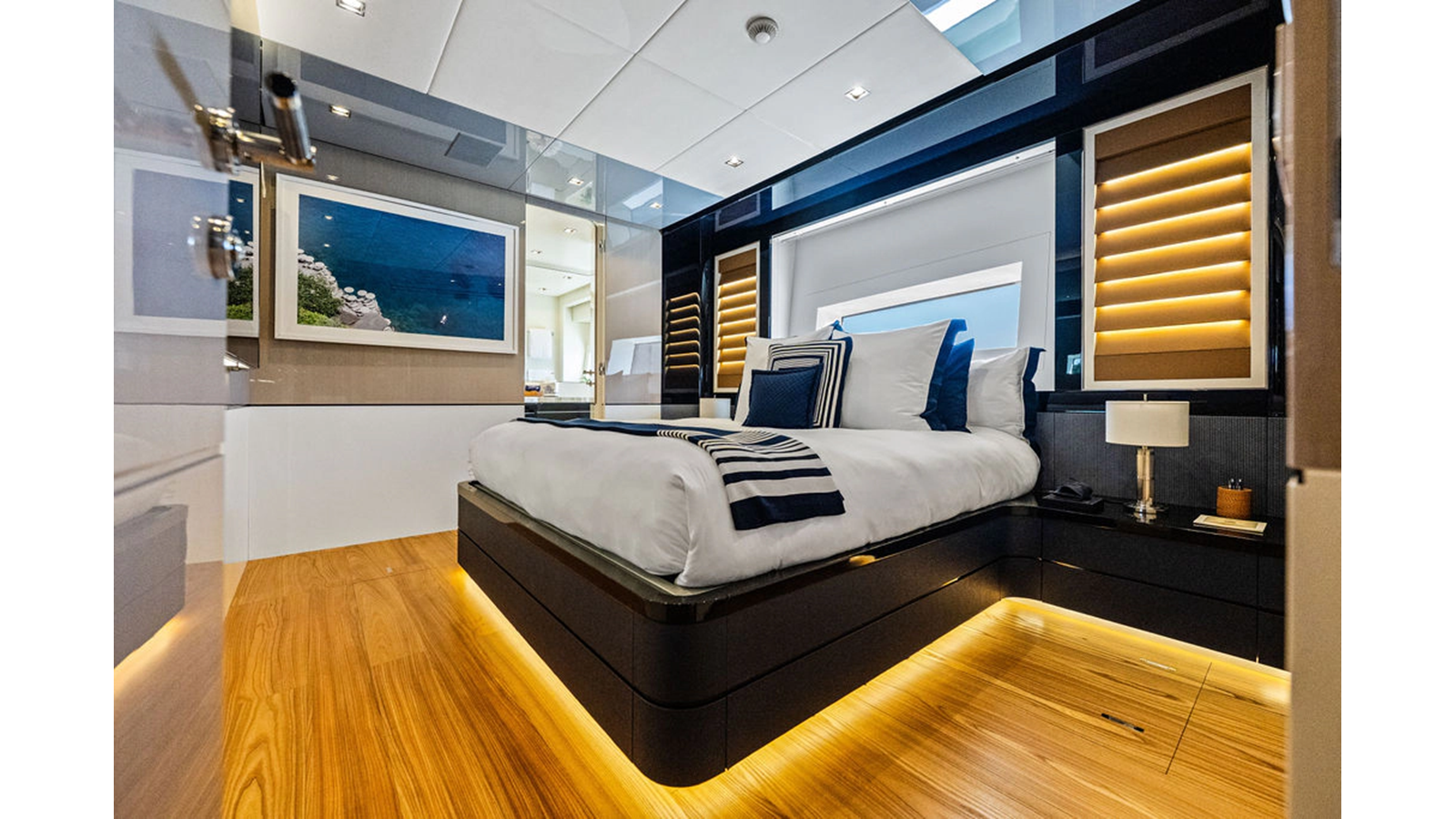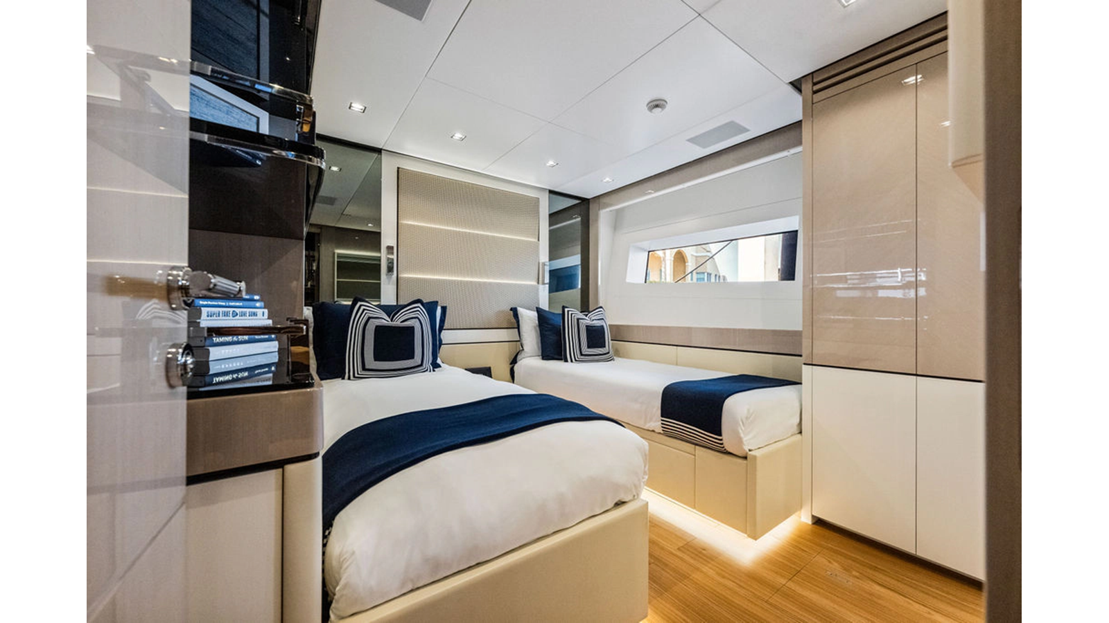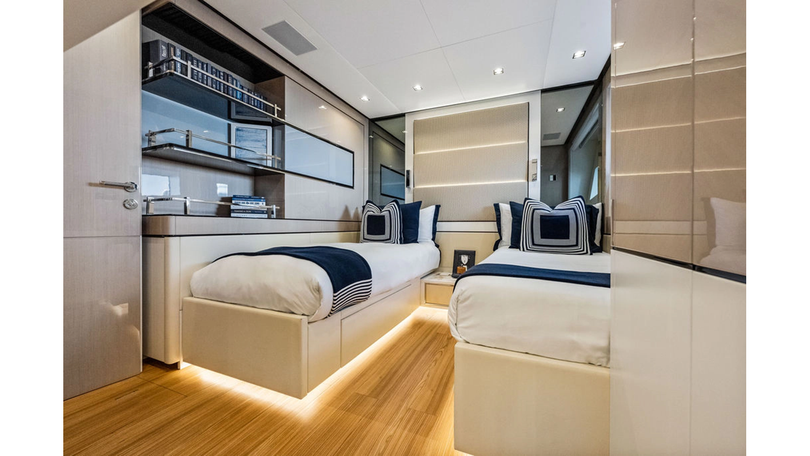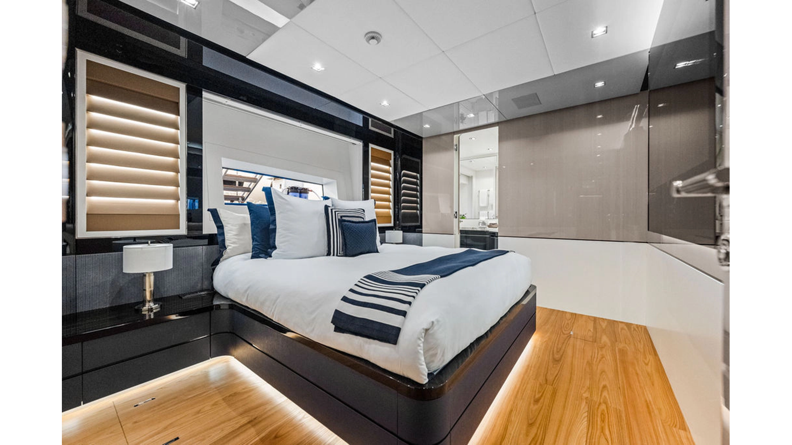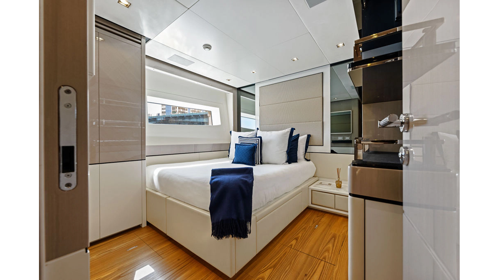 Moving forward on the main deck to starboard you pass the day-head and end at an extremely spacious full beam master cabin complete with massive windows, large wardrobe, shower that was enlarged to fit 2 people and incorporates a steam shower feature, and his & hers heads. The lower deck consists of 4 cabins with the 2 aft cabins mirroring one another with king-size beds, and the forward 2 are identical both with queen berths that can separate to forward 2 single beds. This option assures you have the proper sleeping arrangement depending on the guests staying onboard.