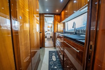 The main salon is a showcase of refined luxury and modern design. Large panoramic windows flood the space with natural light, highlighting the yacht’s rich American walnut cabinetry, high-gloss finishes, and carefully selected soft furnishings. Plush lounge seating creates an inviting atmosphere for guests to relax, socialize, or enjoy the yacht’s premium entertainment system. Forward of the salon, the formal dining area provides seating for up to ten guests in an elegant setting, perfect for hosting intimate dinners or sophisticated gatherings while underway.