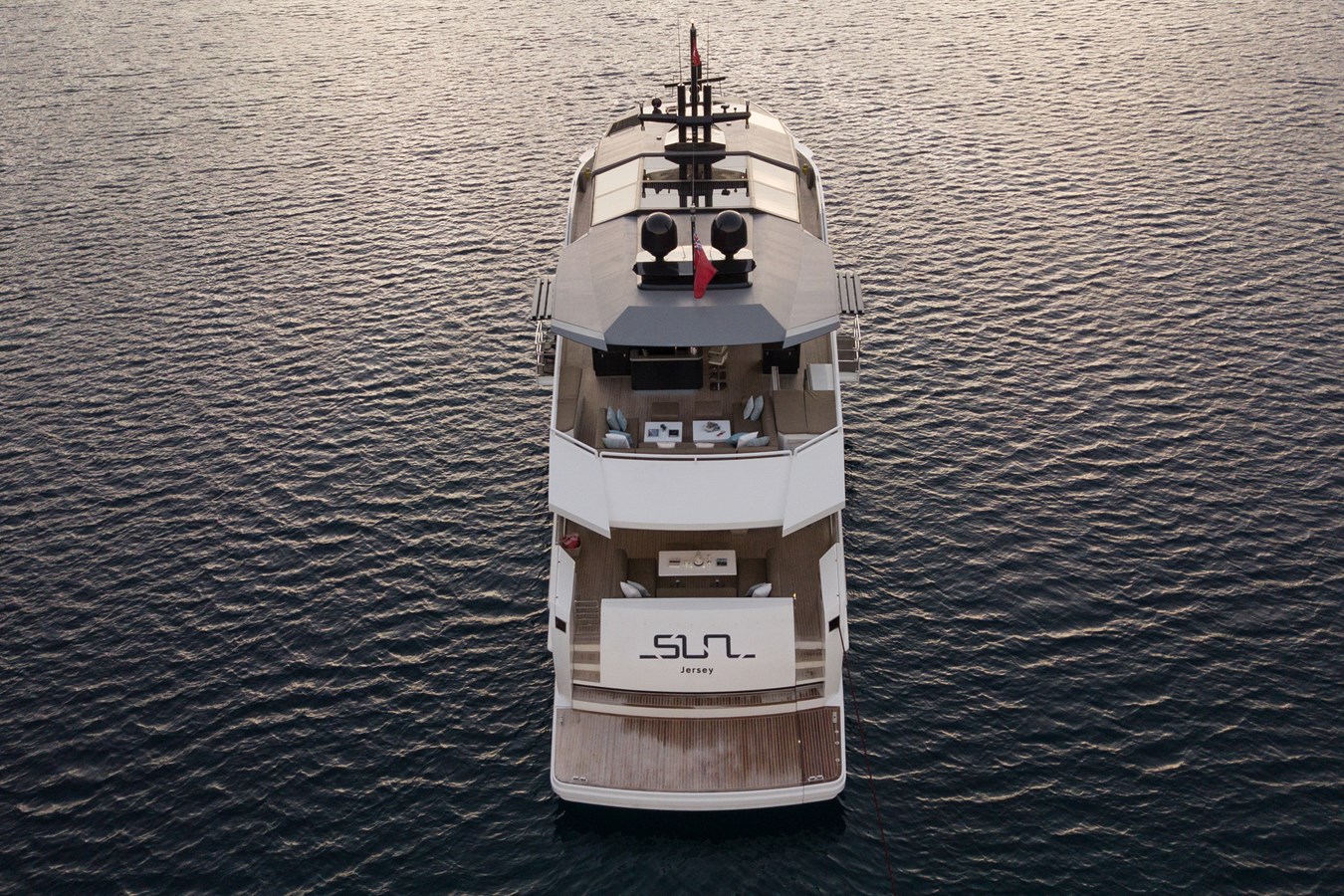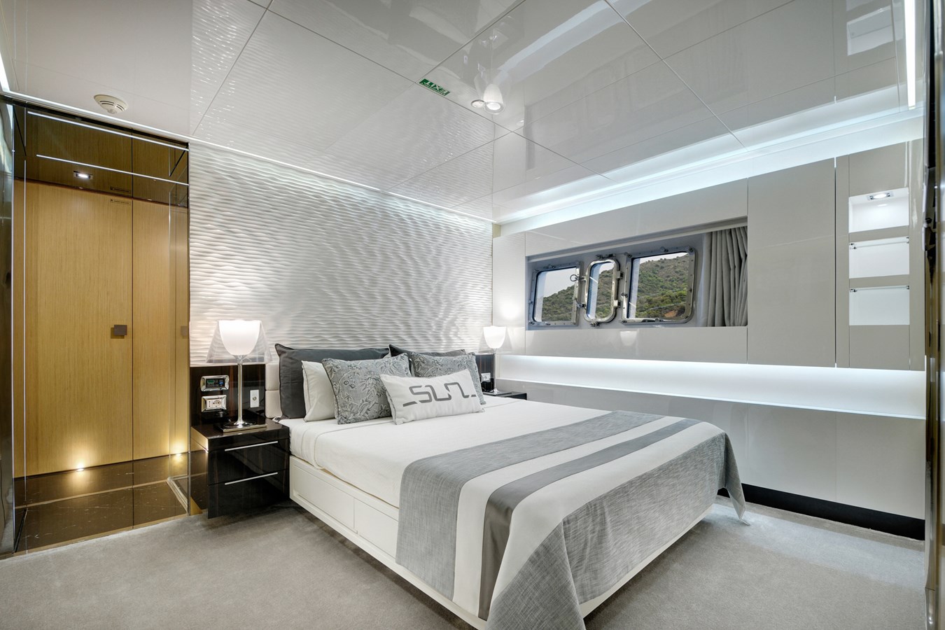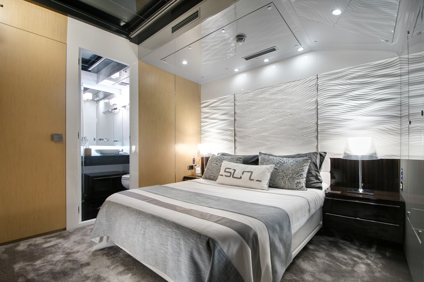 SUN's interior layout sleeps up to 12 guests in 6 staterooms, including a full beam master suite on the main deck with vanity area, owners study, large bathroom with Jacuzzi, his and her wash basins and walk-in dressing area, 2 double cabins and 2 twin cabins plus 1 cabin behind the bridge.