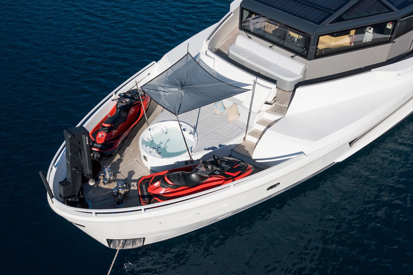 The fore deck boasts a large sunbathing area with Jacuzzi as well as seating in front of the bridge.
