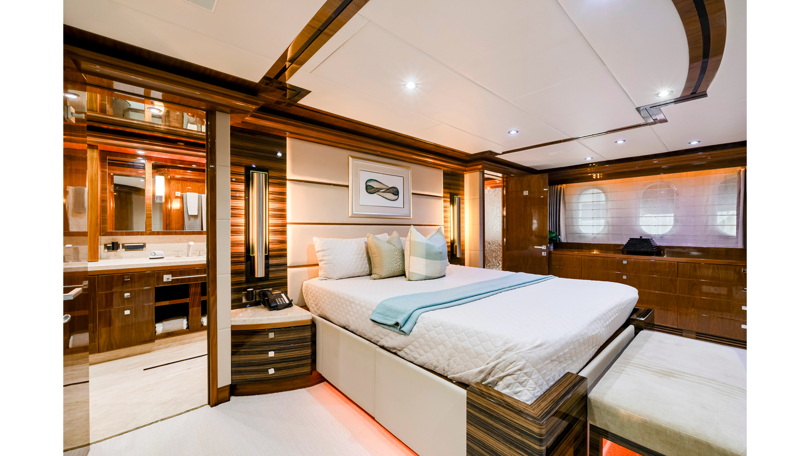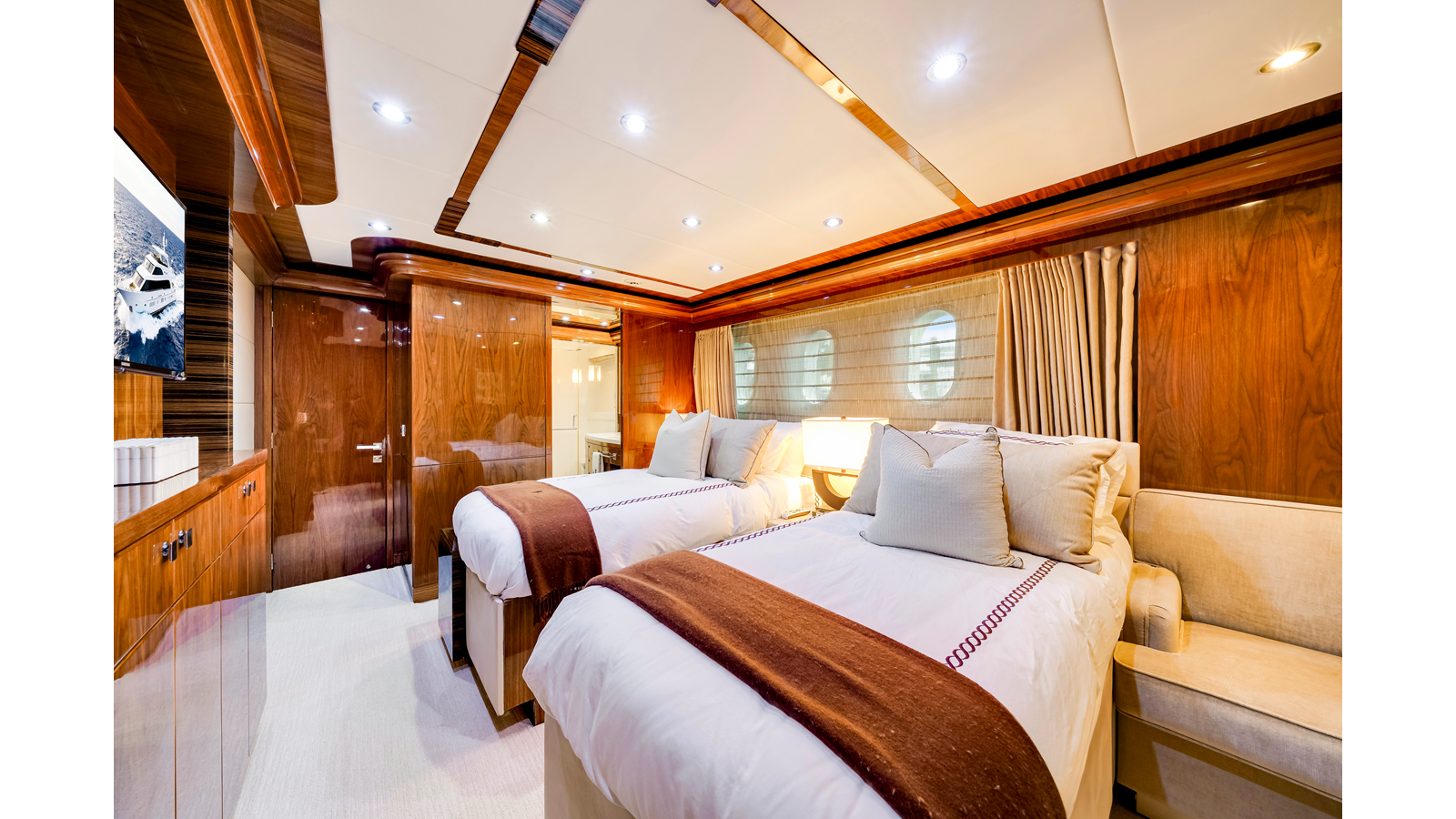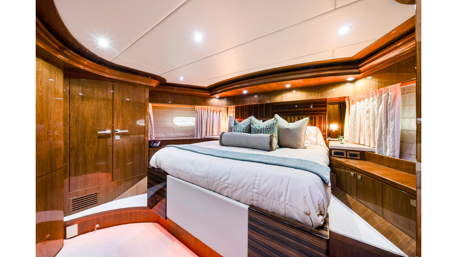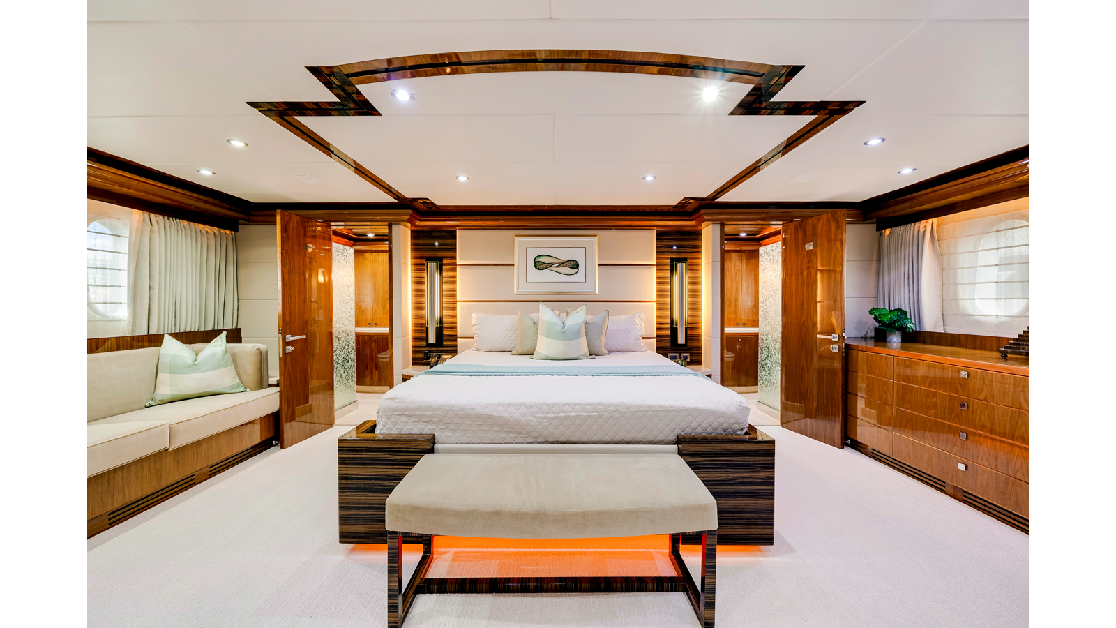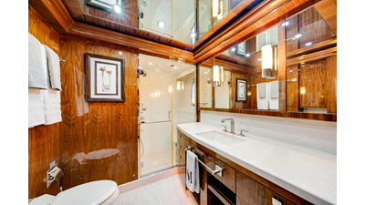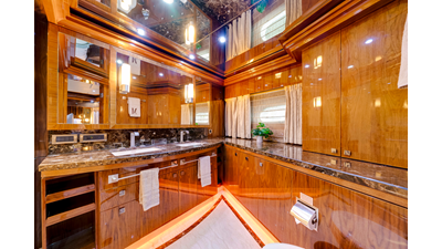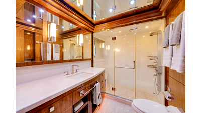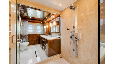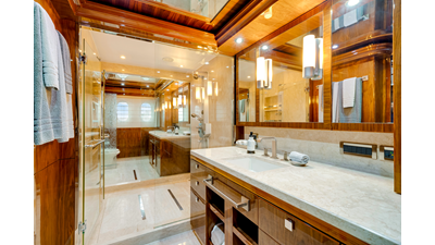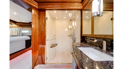 The full-beam master suite takes full advantage of the yacht’s 25-foot beam , creating a spacious and inviting owner’s retreat . The suite features mirrored his-and-hers en-suite bathrooms , separated by a generous walk-in shower. Two walk-in closets provide ample wardrobe storage , making the space ideal for extended stays and long-range cruising.