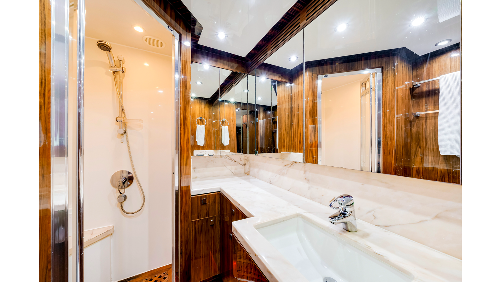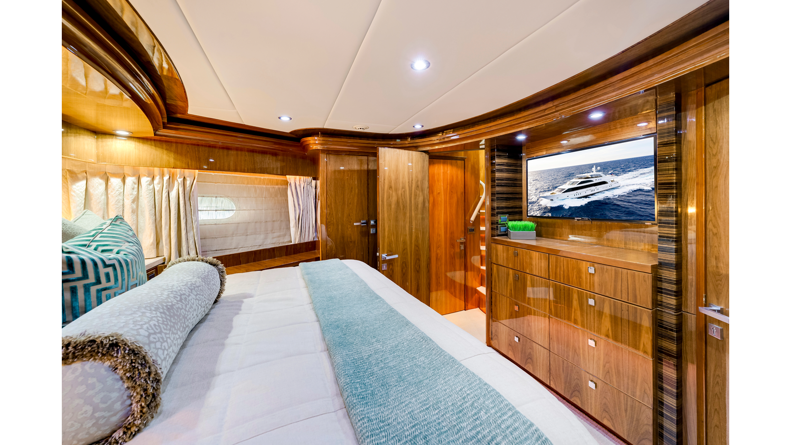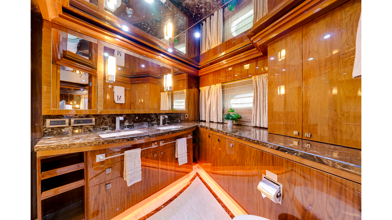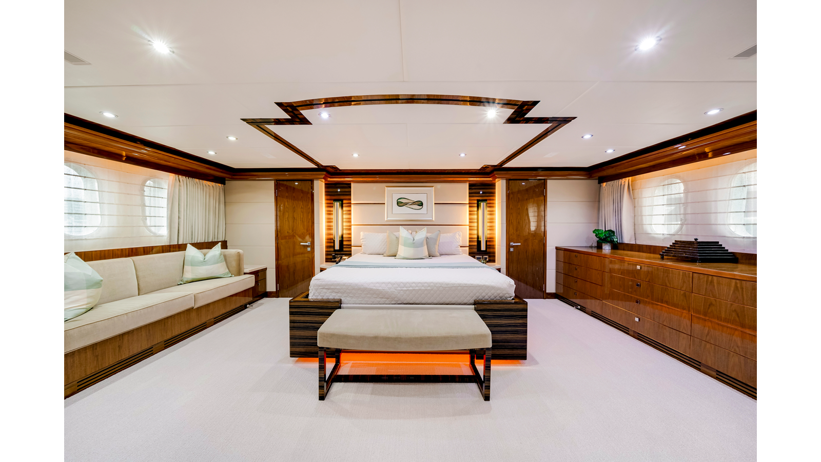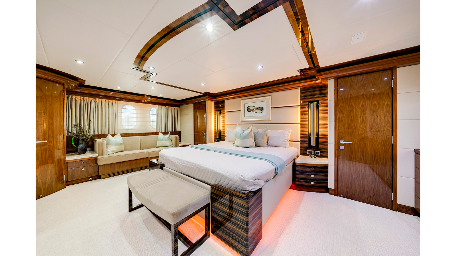 The full-beam master suite takes full advantage of the yacht’s 25-foot beam , creating a spacious and inviting owner’s retreat . The suite features mirrored his-and-hers en-suite bathrooms , separated by a generous walk-in shower. Two walk-in closets provide ample wardrobe storage , making the space ideal for extended stays and long-range cruising.