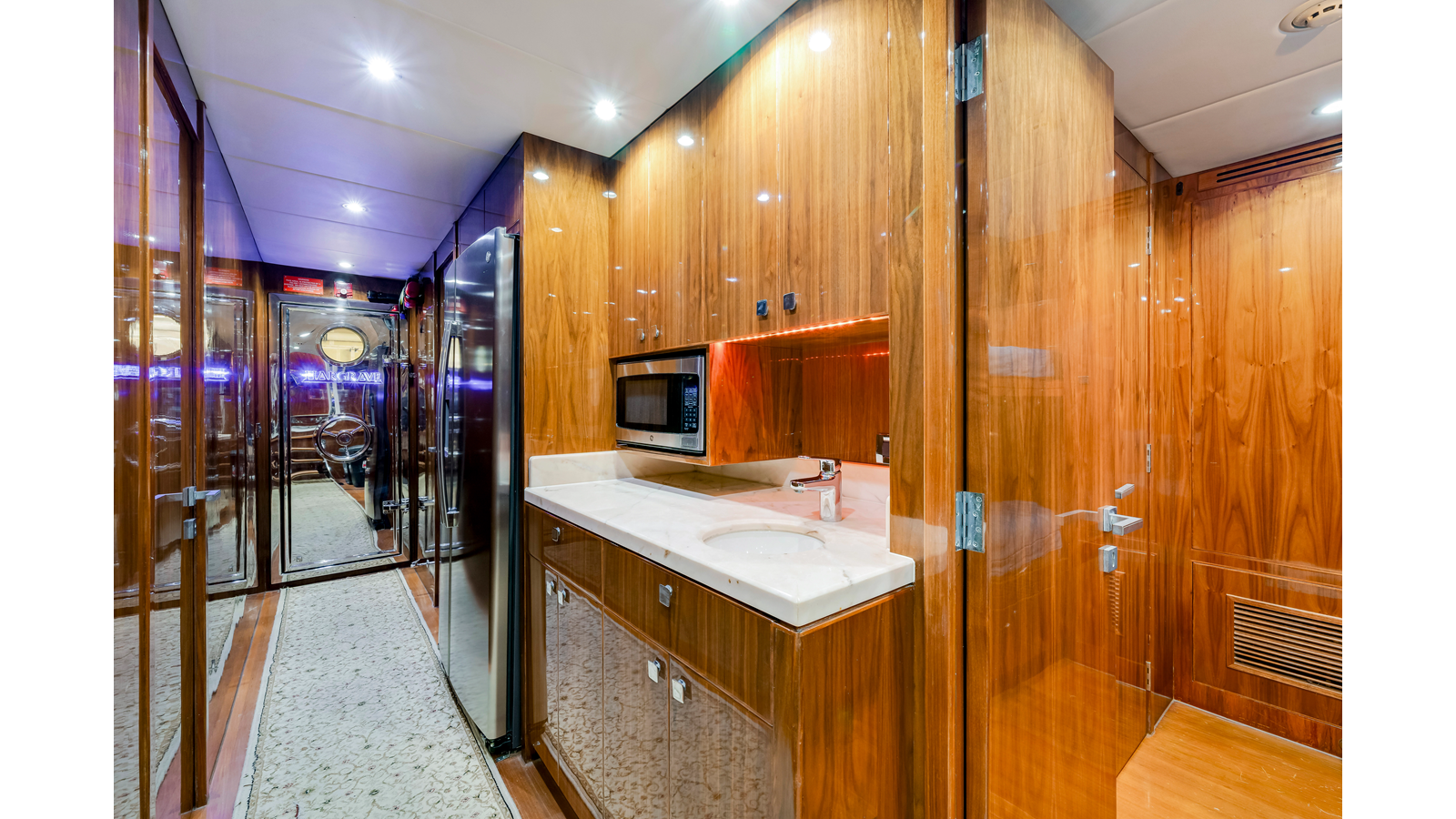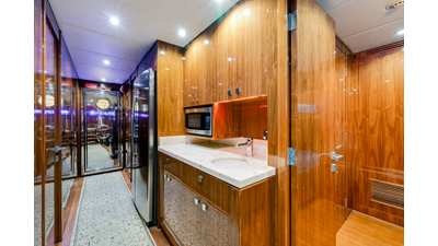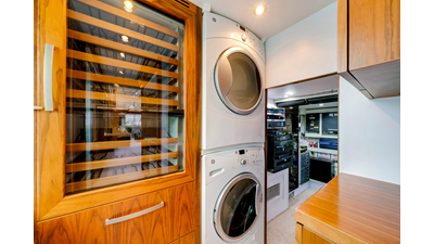 The Starboard hallway is the passage to the day head, galley, pilot house and VIP. The hallway floor is visually a piece of abstract art. The main color is Cream Kaduna marble and the liner inlays are Pearlato Suevo. The Port side is the same floor design as this is the entrance to the guest stairs and forward to the on deck Stewardess walk in pantry and laundry facility. Here, there is an additional wine cooler with storage for 132 bottles. The dog house/laundry also has its own dedicated AC unit and lots of preparation and folding area for the Stew.