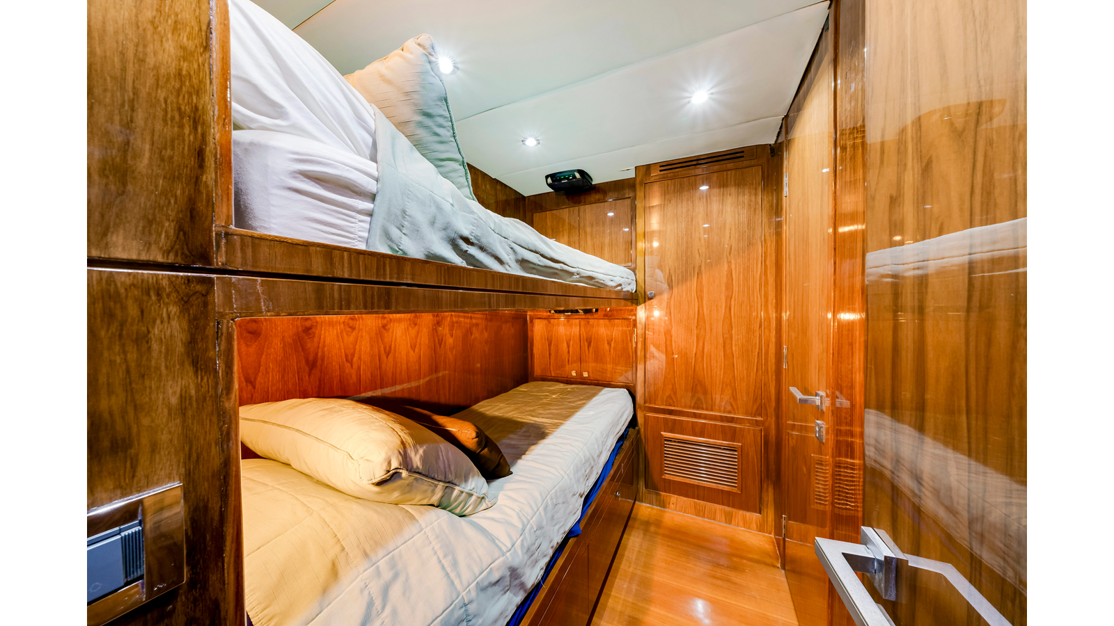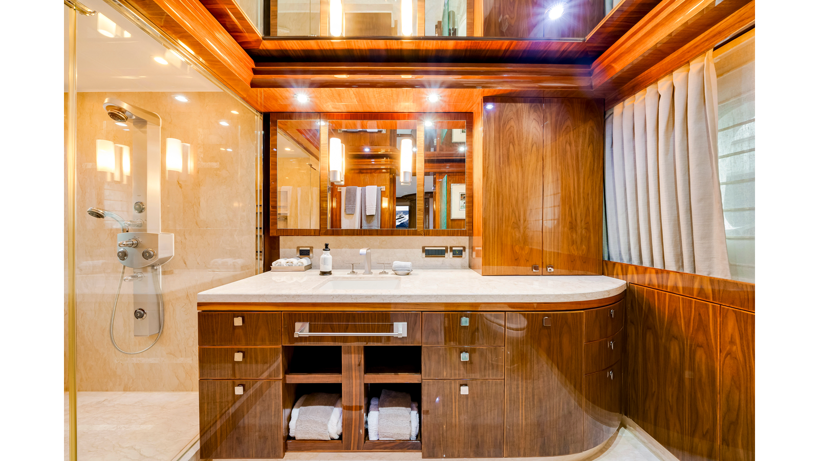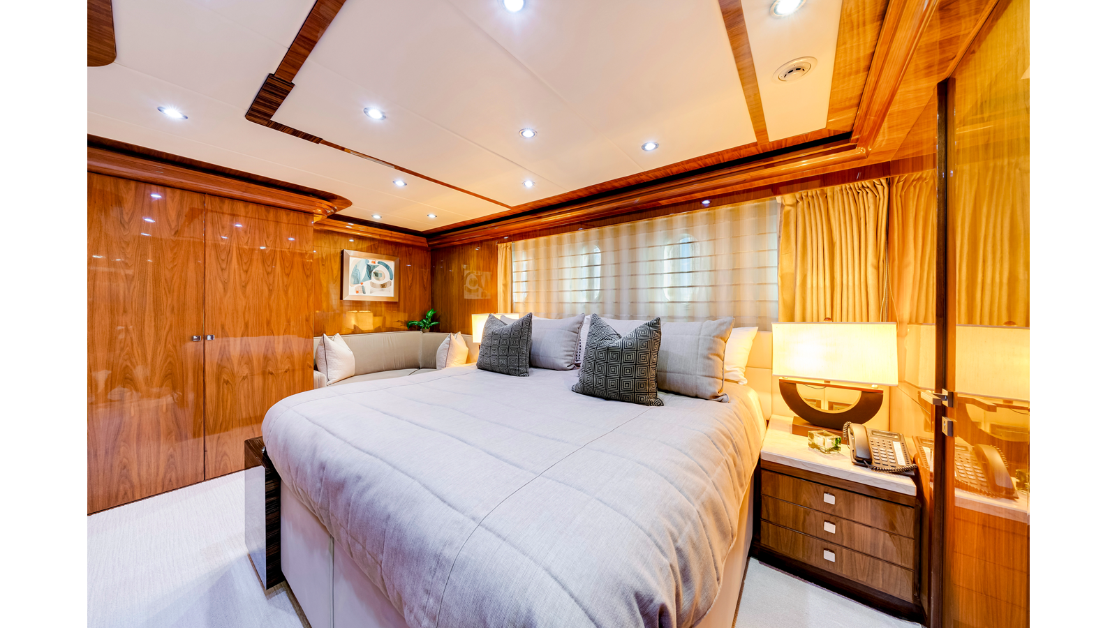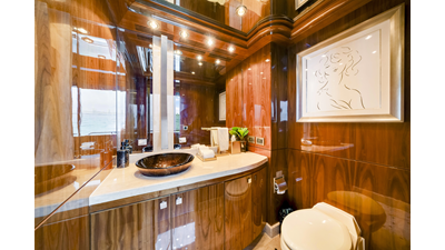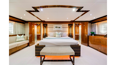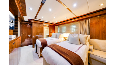 Accommodations aboard MESMERIZE are generous for a yacht of her size . Four well-appointed staterooms are thoughtfully designed to provide comfort and privacy for owners and guests. Each features a king-sized berth, ample closet space , and a spacious en-suite bathroom —amenities sure to be appreciated by both private guests and charter clients alike.