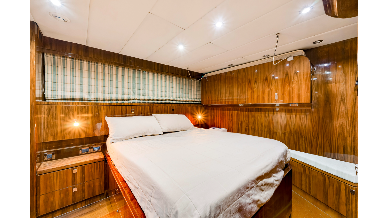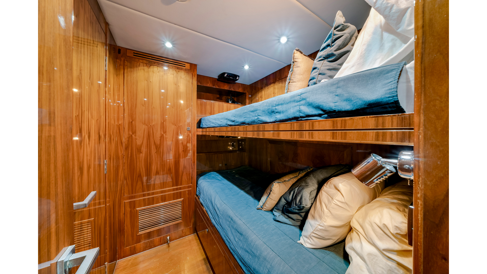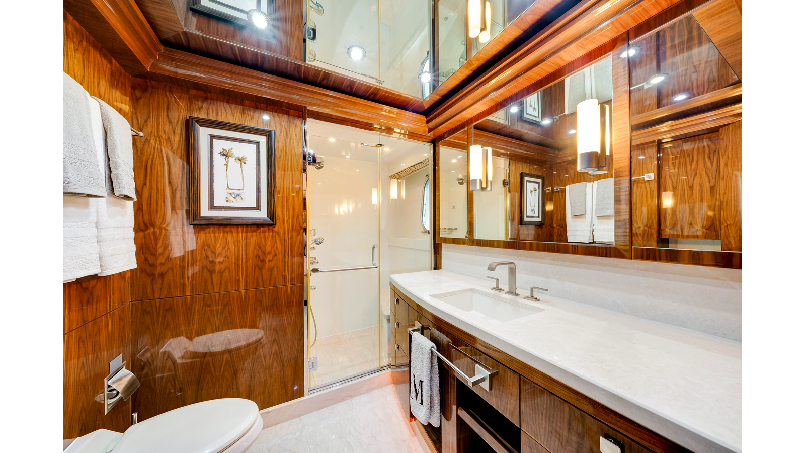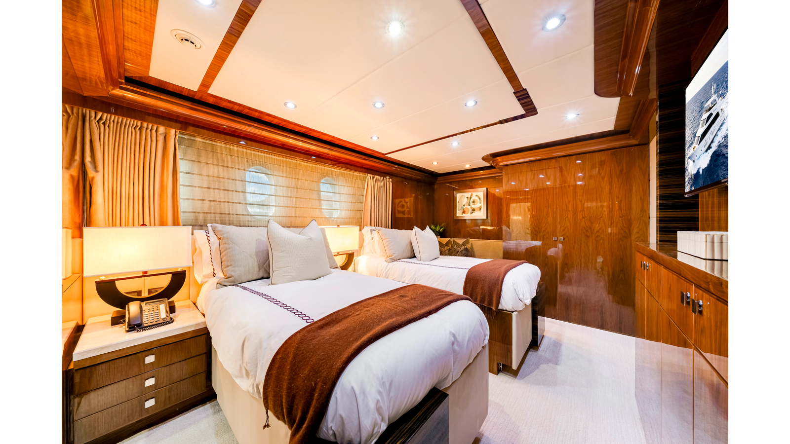 Accommodations aboard MESMERIZE are generous for a yacht of her size . Four well-appointed staterooms are thoughtfully designed to provide comfort and privacy for owners and guests. Each features a king-sized berth, ample closet space , and a spacious en-suite bathroom —amenities sure to be appreciated by both private guests and charter clients alike.