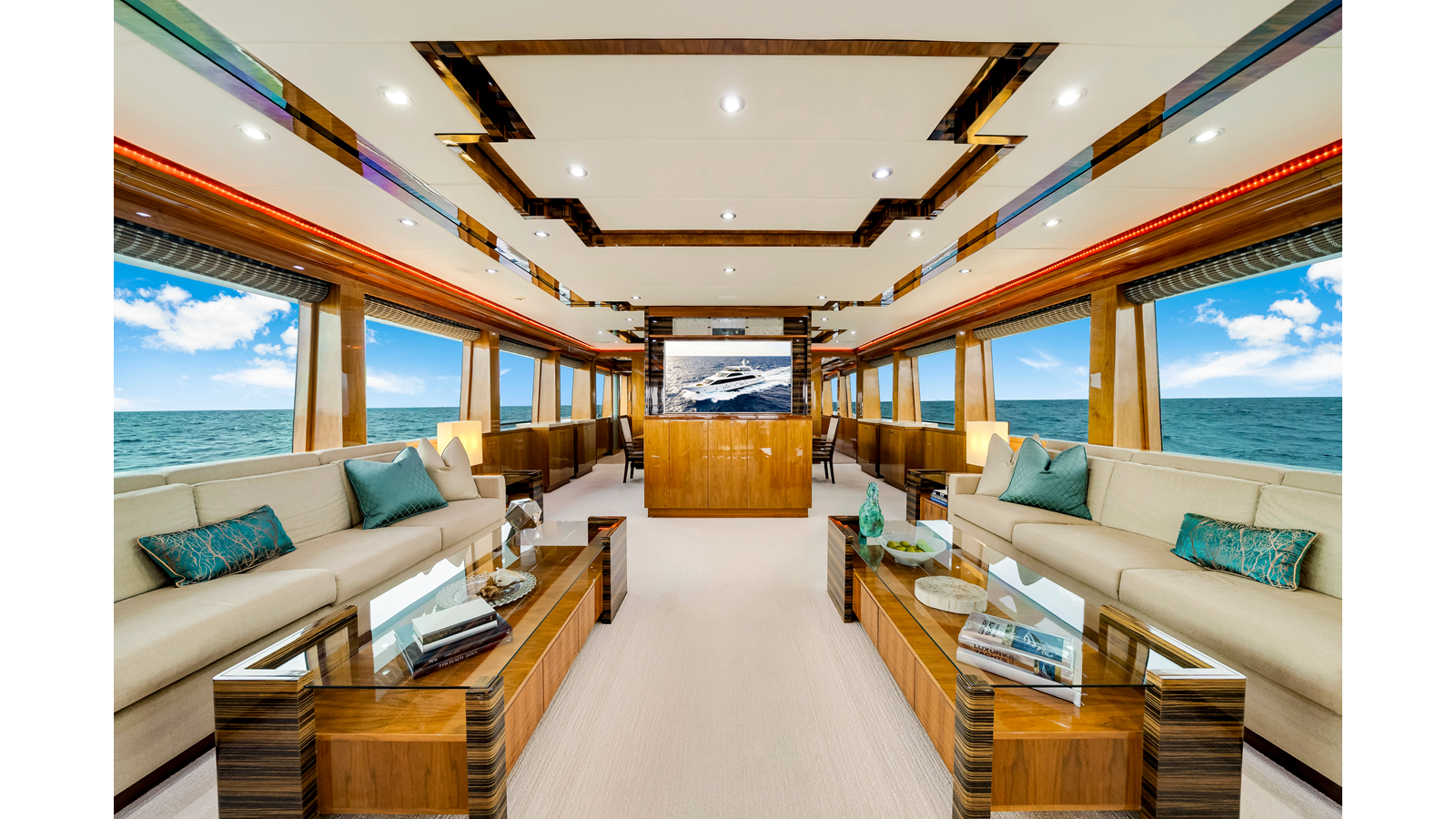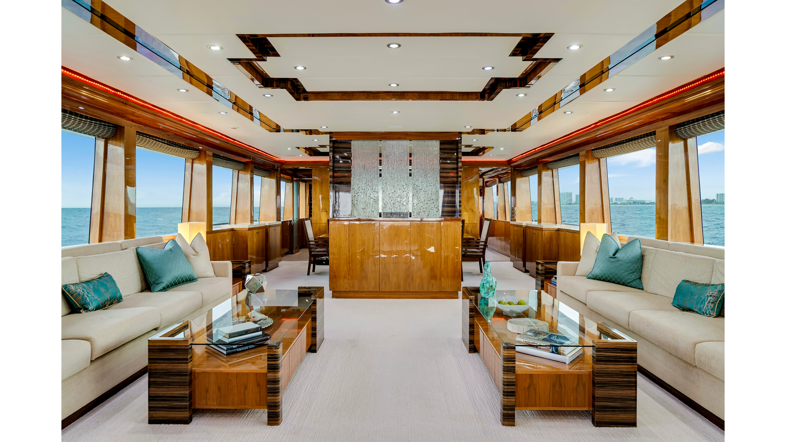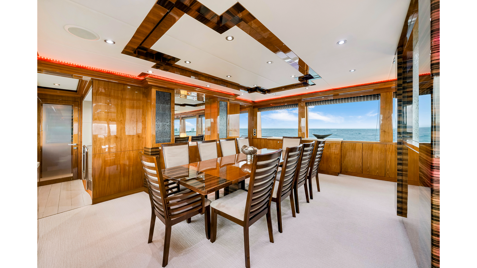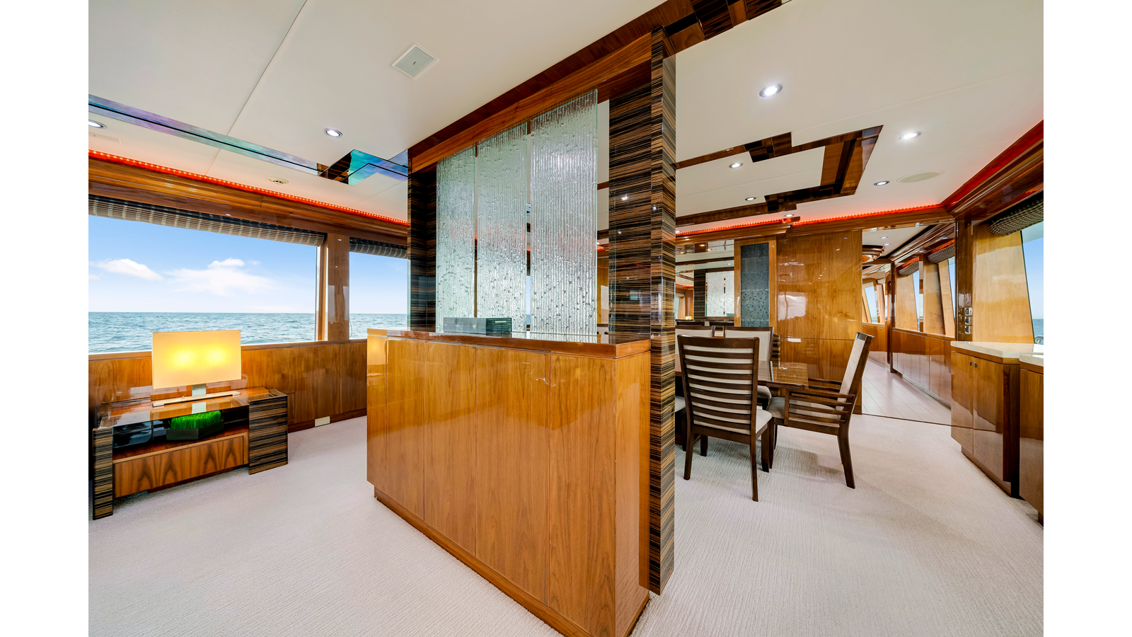 At the aft entrance the flooring is slabs of Cream Kaduna marble. On either side of the entrance foyer there are large squared corner cabinets that define and strengthen the space. The Starboard squared cabinet is the bar, complete with all the required storage, ice, sink etc and completely invisible when closed up. The Port cabinet disguises the crew companionway on the outside of the vessel. Both of these cabinets have gorgeous 44” mirrored recesses with marble shelves and sculptures from Hebi. Looking forward to the Dining Salon, there is a center cabinet with a TV and cabinet with a panel of Art Glass.