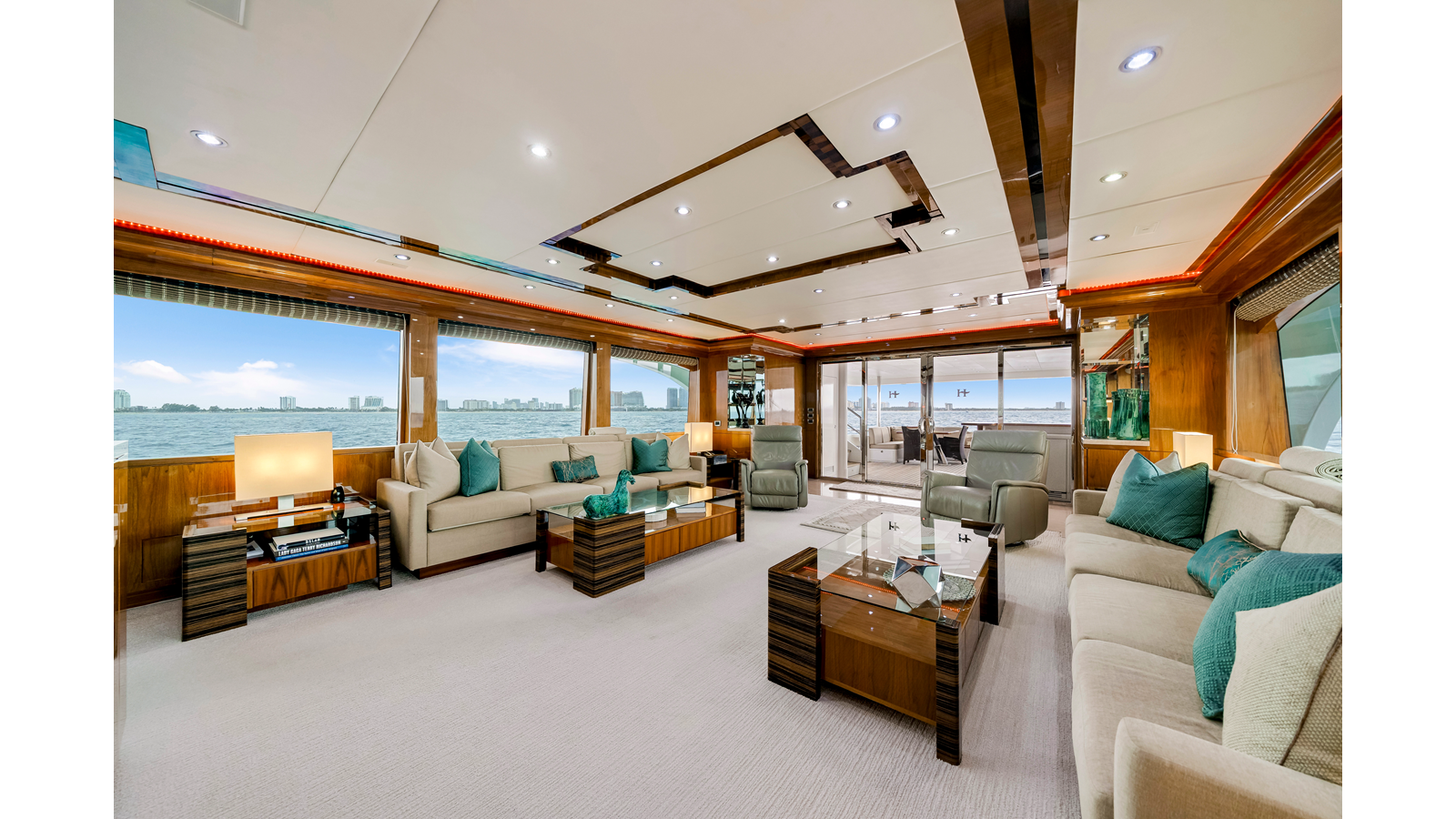 - Aft Deck Wet Bar upholstered with Aqua Leather and Stainless Steel Band & Cuff