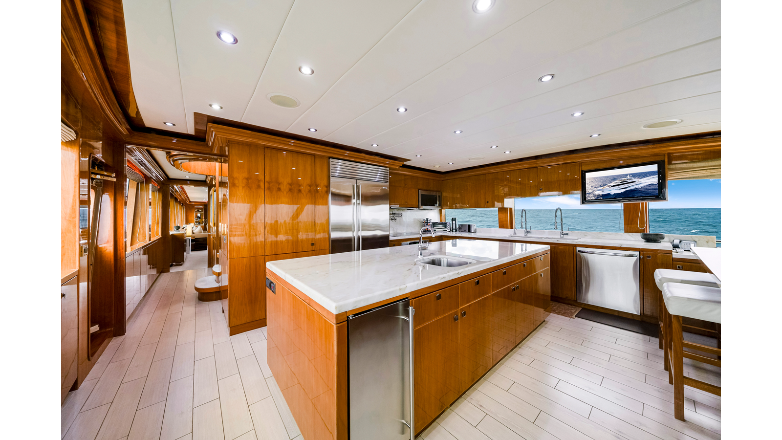 A standout feature of MESMERIZE is the country-style forward galley , which serves as more than just a food preparation area. With a large island countertop , informal seating for six , and a television , it functions much like a residential kitchen where owners and guests naturally gather throughout the day.