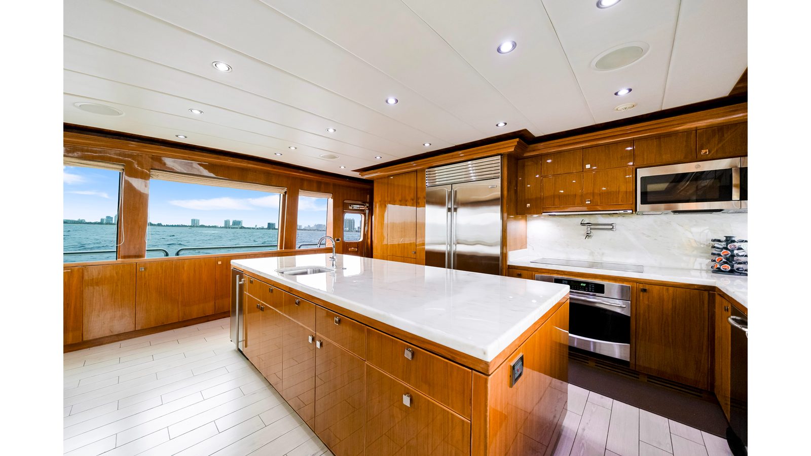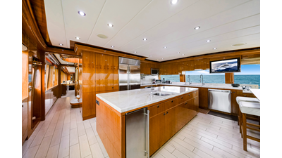 The galley was designed to be not only a professional food preparation area but an area for social gatherings. The room is finished in the same fine quality wood, hardware and craftsmanship as the rest of the vessel. The galley has tons of counter space and has a true walk in pantry (3’ x 4’). For natural light, three sides are windows and there is a large comfortable settee forward with seating for eight. The large center island has a second sink, ice maker, recycling station, additional subzero refrigerator drawers and 132’ sq. /feet of storage.